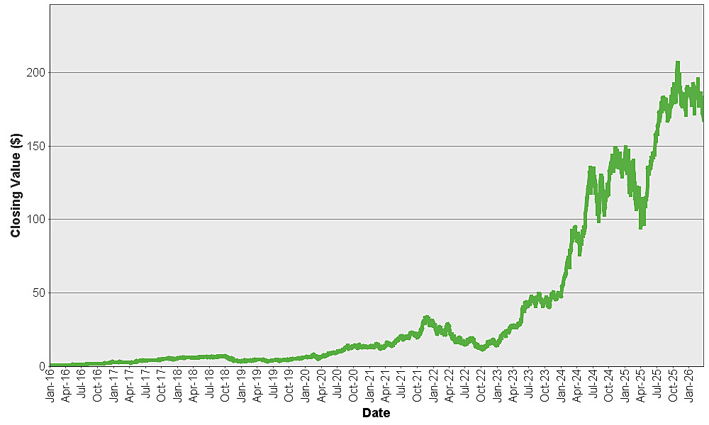 The graph below shows the closing value of NVIDIA Corporation for each day such value was available from January 4, 2016 to March 27, 2026. We obtained the closing values from Bloomberg L.P., without independent verification. If certain corporate transactions occurred during the historical period shown below, including, but not limited to, spin-offs or mergers, then the closing values shown below for the period prior to the occurrence of any such transaction have been adjusted by Bloomberg L.P. as if any such transaction had occurred prior to the first day in the period shown below. You should not take historical closing values as an indication of future performance.