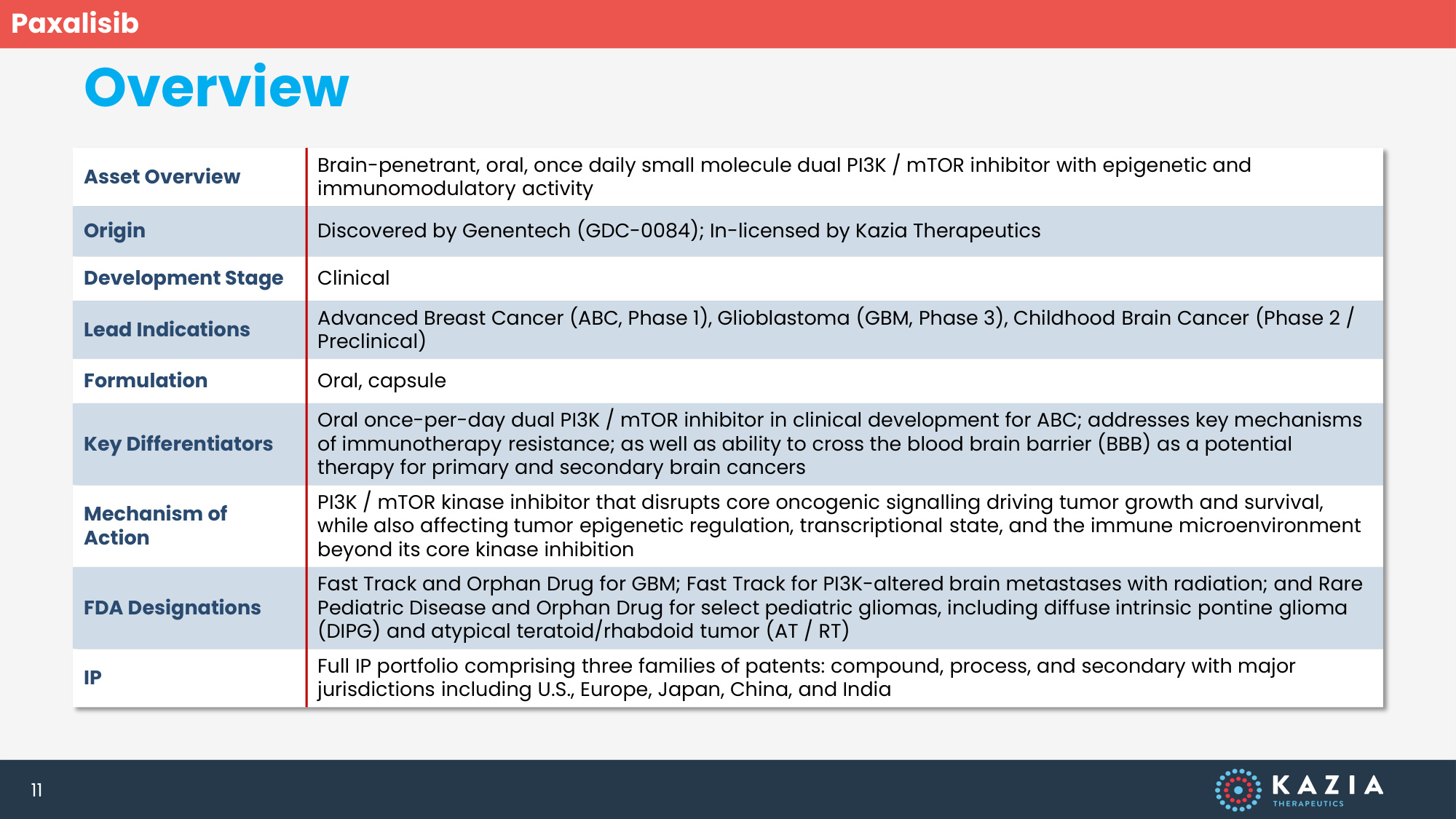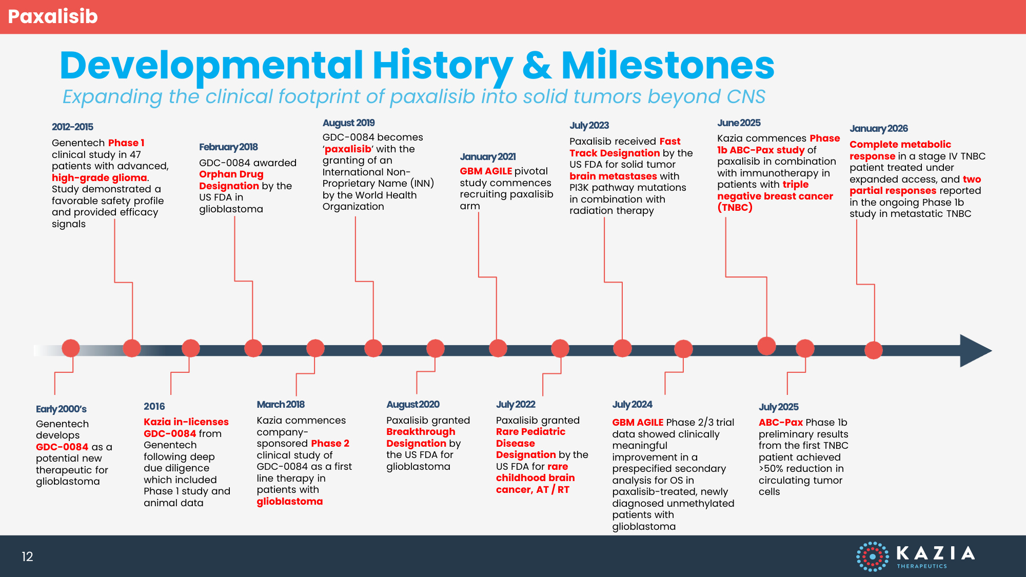 Paxalisib Overview 11 Asset Overview Brain-penetrant, oral, once daily small molecule dual PI3K / mTOR inhibitor with epigenetic and immunomodulatory activity Origin Discovered by Genentech (GDC-0084); In-licensed by Kazia Therapeutics Development Stage Clinical Lead Indications Advanced Breast Cancer (ABC, Phase 1), Glioblastoma (GBM, Phase 3), Childhood Brain Cancer (Phase 2 / Preclinical) Formulation Oral, capsule Key Differentiators Oral once-per-day dual PI3K / mTOR inhibitor in clinical development for ABC; addresses key mechanisms of immunotherapy resistance; as well as ability to cross the blood brain barrier (BBB) as a potential therapy for primary and secondary brain cancers Mechanism of Action PI3K / mTOR kinase inhibitor that disrupts core oncogenic signalling driving tumor growth and survival, while also affecting tumor epigenetic regulation, transcriptional state, and the immune microenvironment beyond its core kinase inhibition FDA Designations Fast Track and Orphan Drug for GBM; Fast Track for PI3K-altered brain metastases with radiation; and Rare Pediatric Disease and Orphan Drug for select pediatric gliomas, including diffuse intrinsic pontine glioma (DIPG) and atypical teratoid/rhabdoid tumor (AT / RT) IP Full IP portfolio comprising three families of patents: compound, process, and secondary with major jurisdictions including U.S., Europe, Japan, China, and India