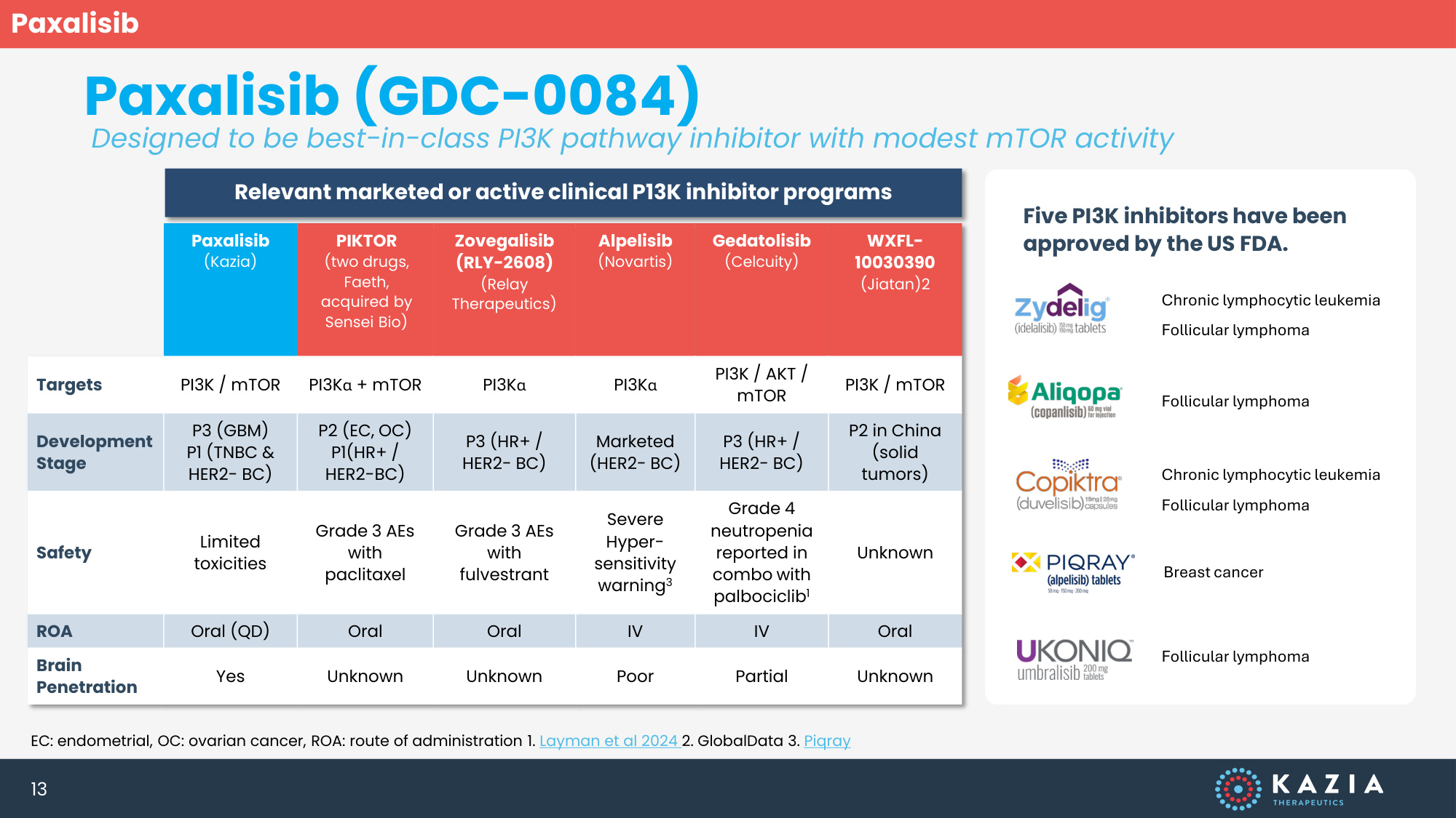 Paxalisib Developmental History & Milestones 12 Early 2000's Genentech develops GDC-0084 as a potential new therapeutic for glioblastoma 2012-2015 Genentech Phase 1 clinical study in 47 patients with advanced, high-grade glioma. Study demonstrated a favorable safety profile and provided efficacy signals 2016 Kazia in-licenses GDC-0084 from Genentech following deep due diligence which included Phase 1 study and animal data March 2018 Kazia commences company- sponsored Phase 2 clinical study of GDC-0084 as a first line therapy in patients with glioblastoma August 2020 Paxalisib granted Breakthrough Designation by the US FDA for glioblastoma January 2021 GBM AGILE pivotal study commences recruiting paxalisib arm February 2018 GDC-0084 awarded Orphan Drug Designation by the US FDA in glioblastoma August 2019 GDC-0084 becomes 'paxalisib' with the granting of an International Non- Proprietary Name (INN) by the World Health Organization July 2024 GBM AGILE Phase 2/3 trial data showed clinically meaningful improvement in a prespecified secondary analysis for OS in paxalisib-treated, newly diagnosed unmethylated patients with glioblastoma July 2022 Paxalisib granted Rare Pediatric Disease Designation by the US FDA for rare childhood brain cancer, AT / RT July 2025 ABC-Pax Phase 1b preliminary results from the first TNBC patient achieved >50% reduction in circulating tumor cells July 2023 Paxalisib received Fast Track Designation by the US FDA for solid tumor brain metastases with PI3K pathway mutations in combination with radiation therapy June 2025 Kazia commences Phase 1b ABC-Pax study of paxalisib in combination with immunotherapy in patients with triple negative breast cancer (TNBC) January 2026 Complete metabolic response in a stage IV TNBC patient treated under expanded access, and two partial responses reported in the ongoing Phase 1b study in metastatic TNBC Expanding the clinical footprint of paxalisib into solid tumors beyond CNS