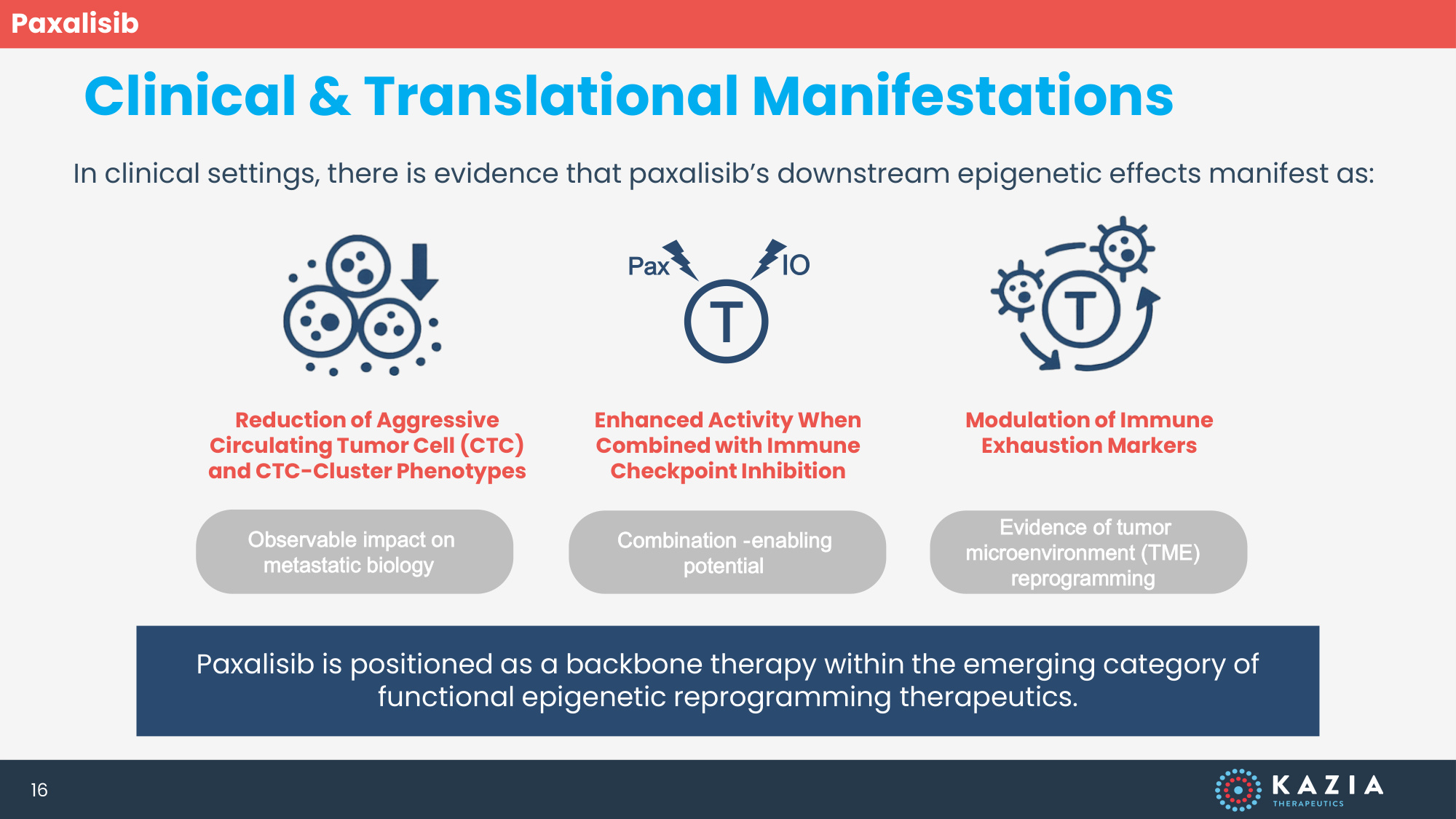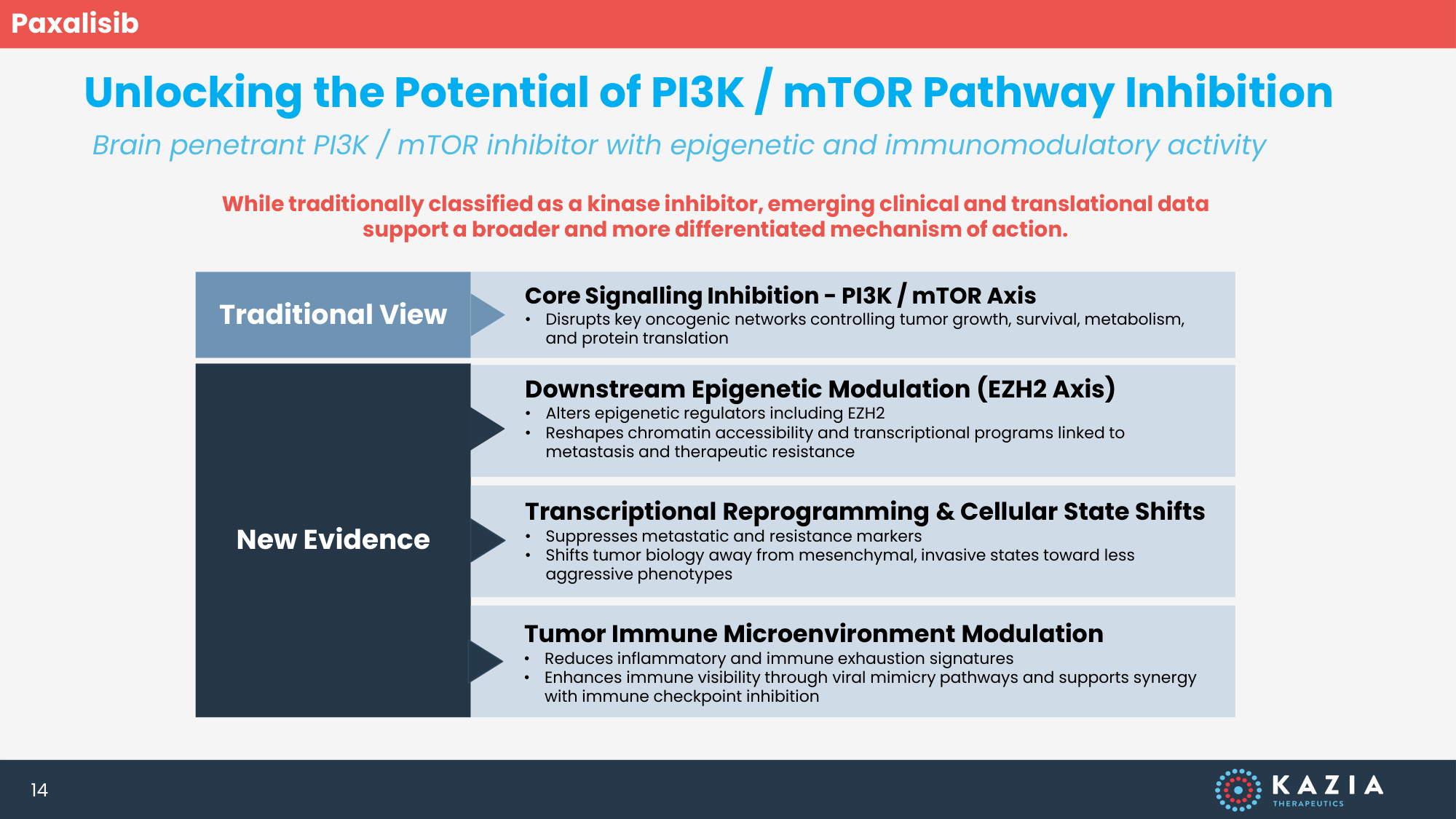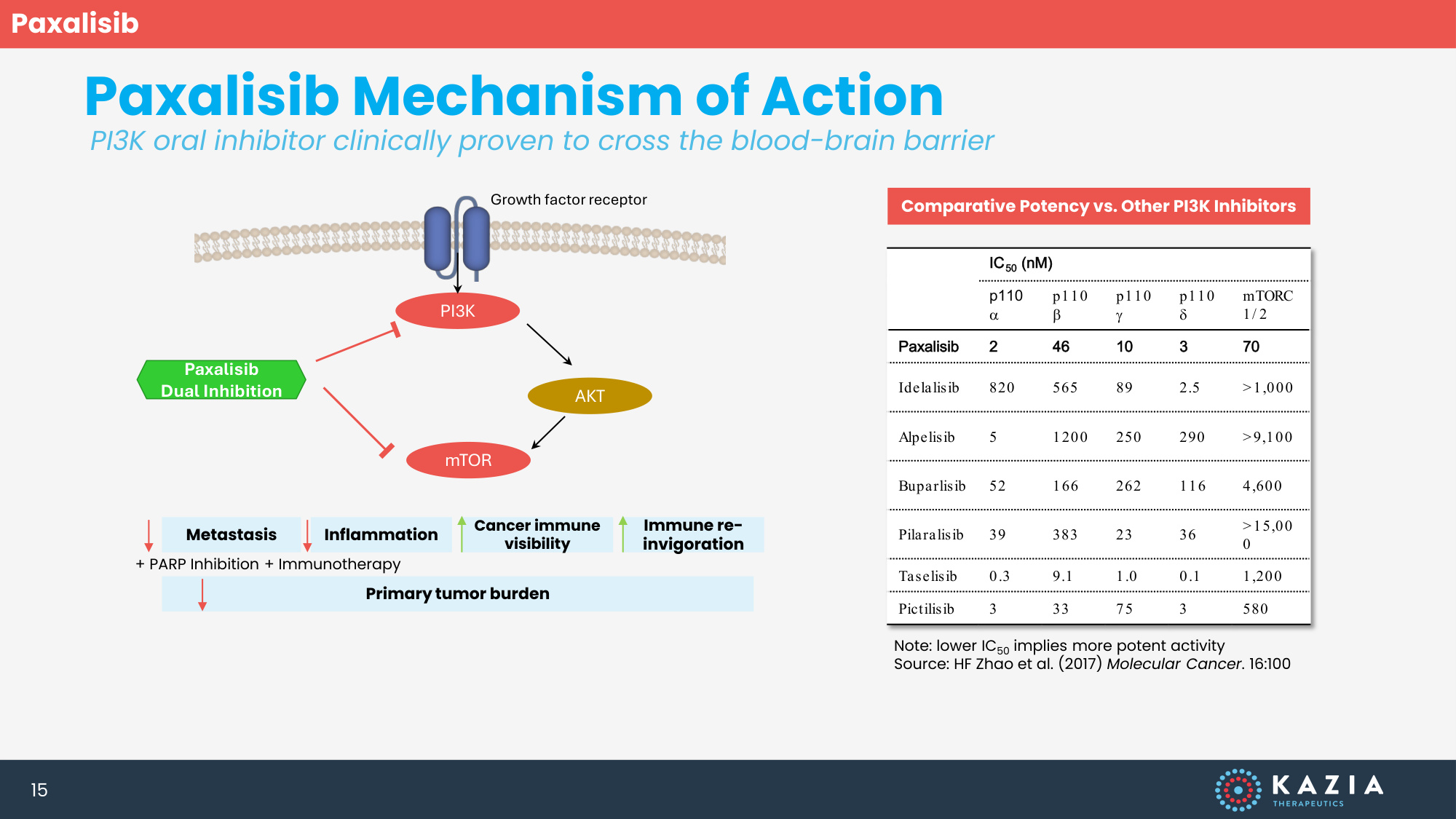 Paxalisib Unlocking the Potential of PI3K / mTOR Pathway Inhibition 14 Brain penetrant PI3K / mTOR inhibitor with epigenetic and immunomodulatory activity While traditionally classified as a kinase inhibitor, emerging clinical and translational data support a broader and more differentiated mechanism of action. Traditional View New Evidence Core Signalling Inhibition - PI3K / mTOR Axis • Disrupts key oncogenic networks controlling tumor growth, survival, metabolism, and protein translation Downstream Epigenetic Modulation (EZH2 Axis) • Alters epigenetic regulators including EZH2 • Reshapes chromatin accessibility and transcriptional programs linked to metastasis and therapeutic resistance Transcriptional Reprogramming & Cellular State Shifts • Suppresses metastatic and resistance markers • Shifts tumor biology away from mesenchymal, invasive states toward less aggressive phenotypes Tumor Immune Microenvironment Modulation • Reduces inflammatory and immune exhaustion signatures • Enhances immune visibility through viral mimicry pathways and supports synergy with immune checkpoint inhibition