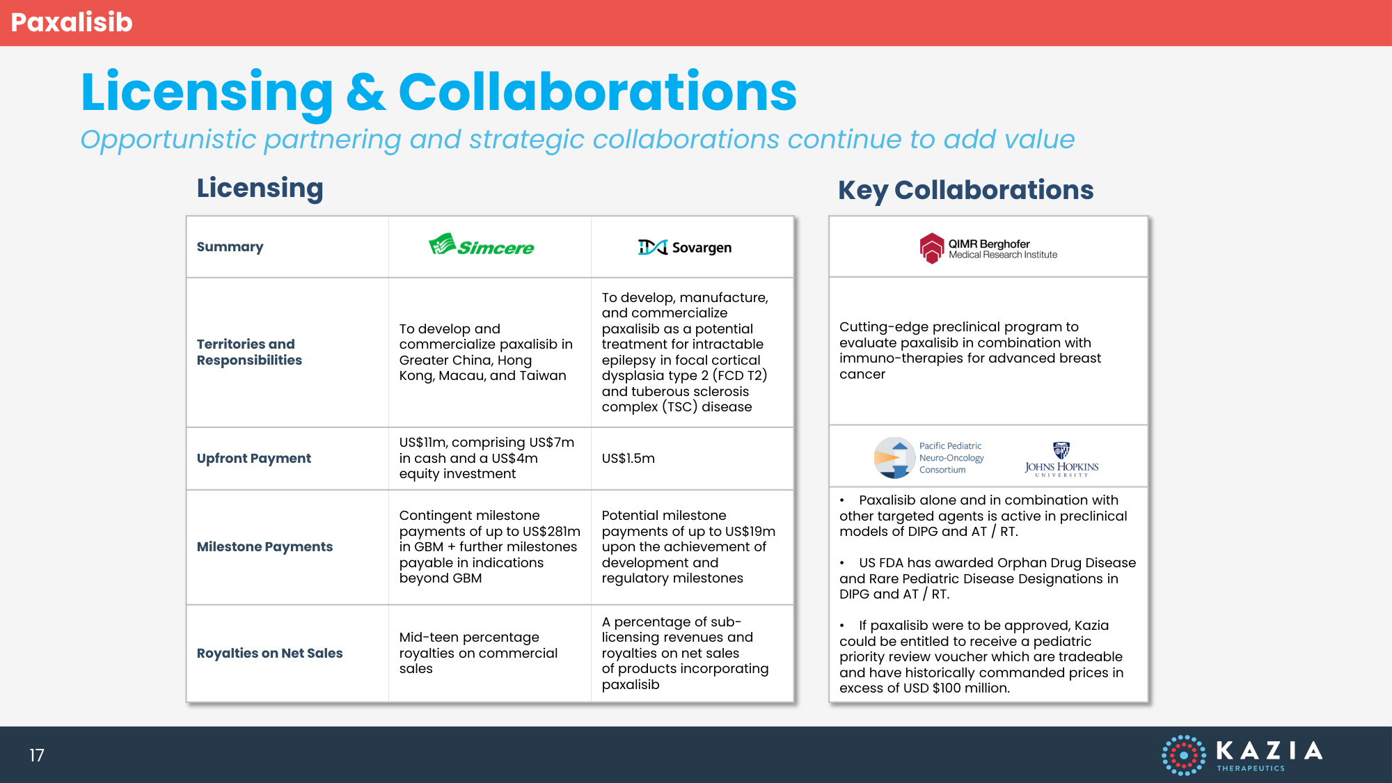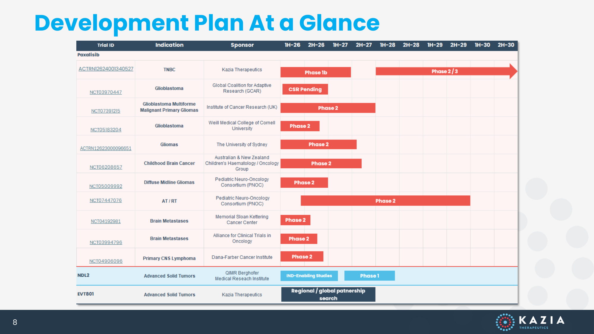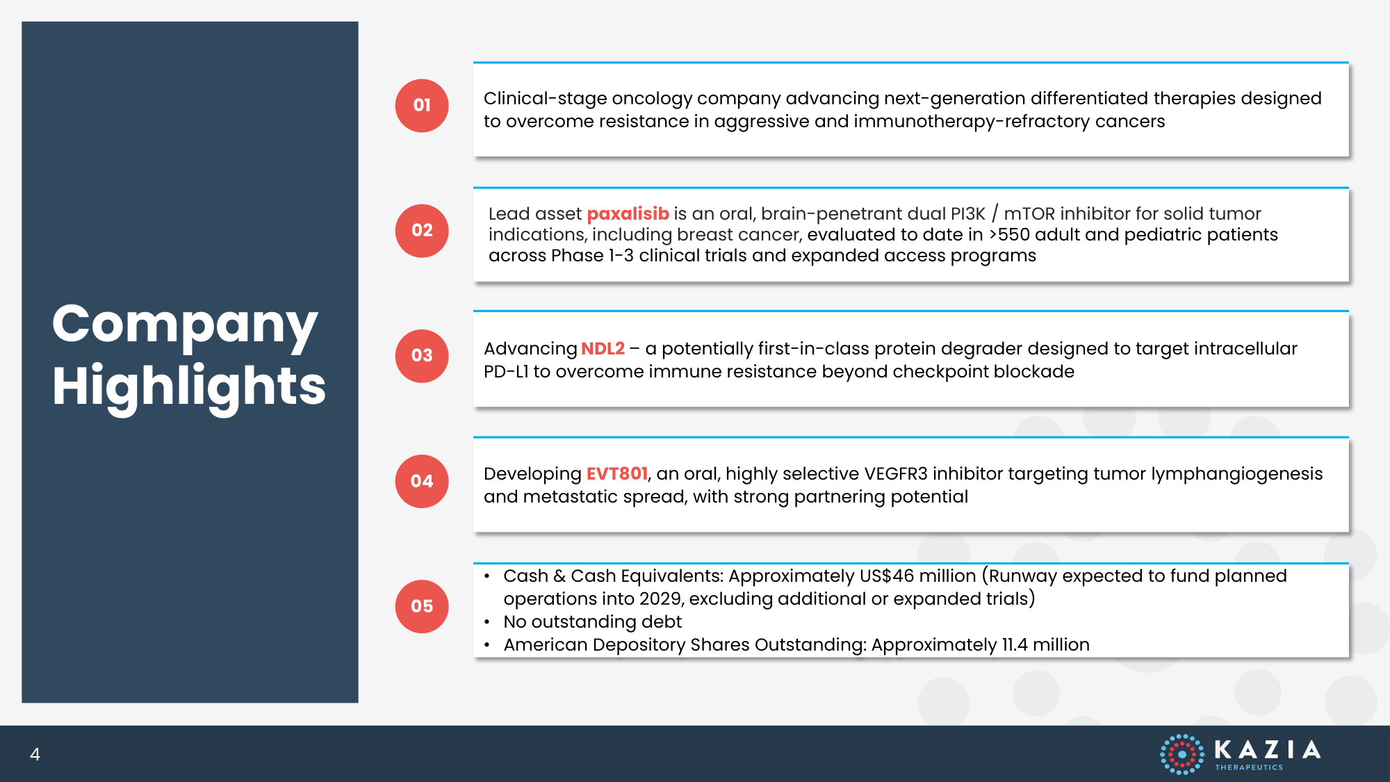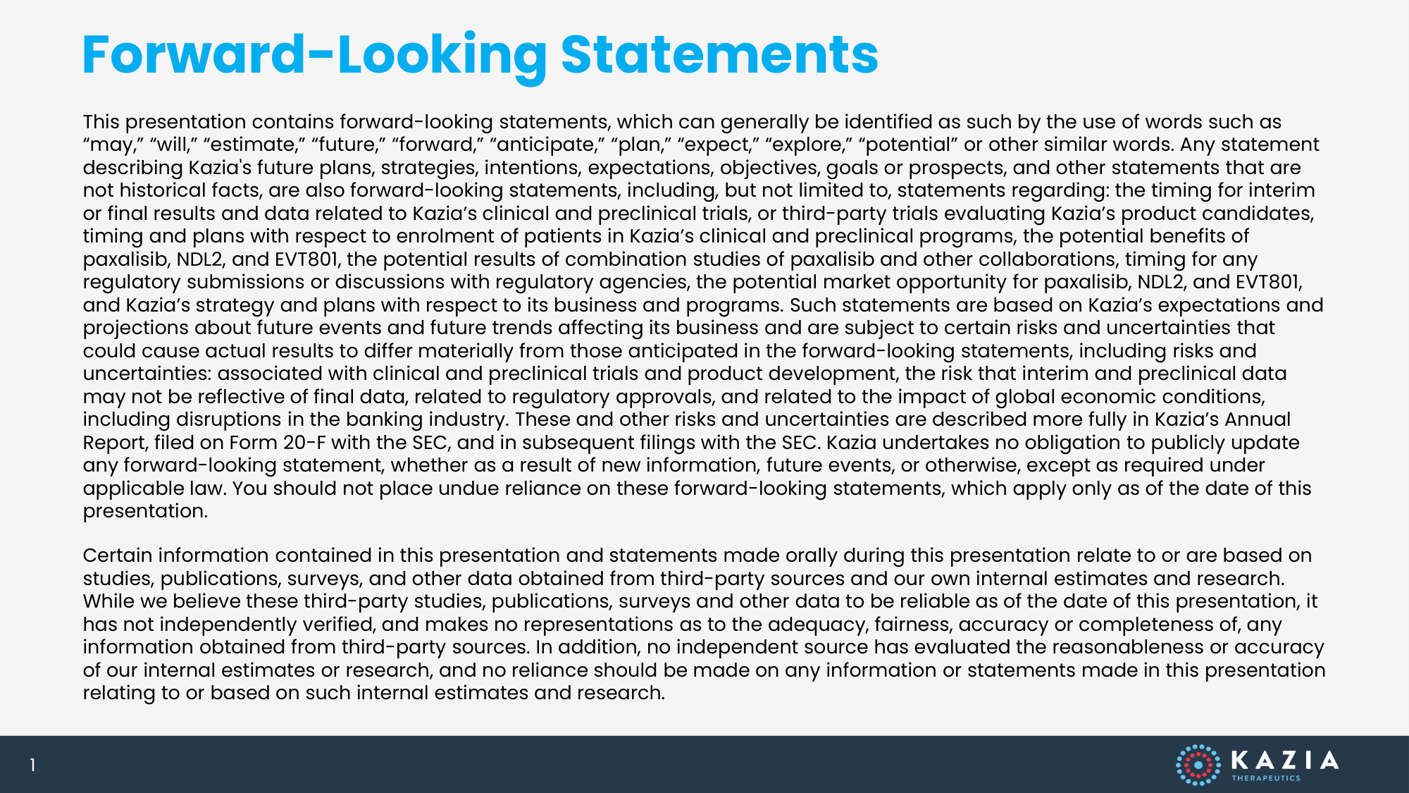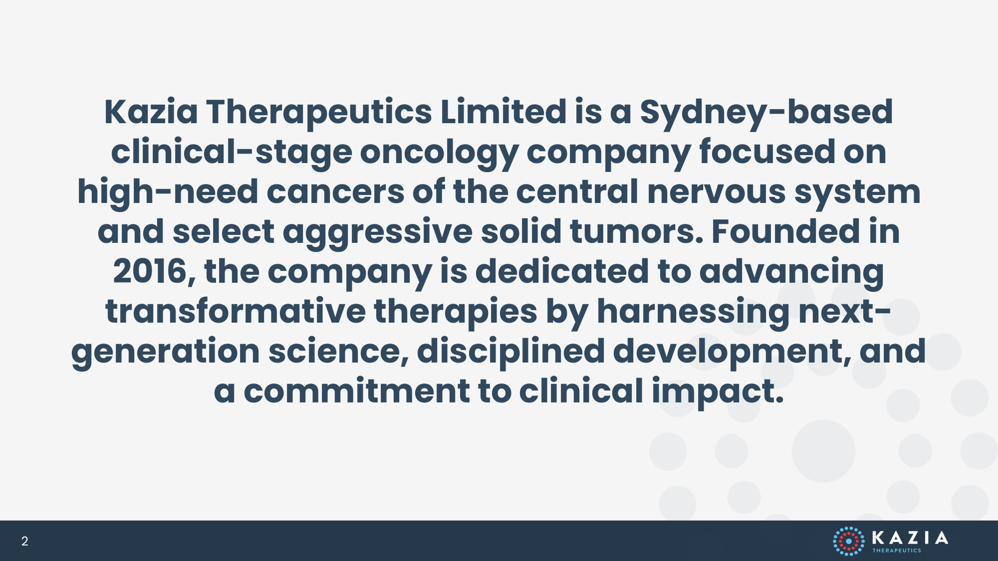 1 This presentation contains forward-looking statements, which can generally be identified as such by the use of words such as "may," "will," "estimate," "future," "forward," "anticipate," "plan," "expect," "explore," "potential" or other similar words. Any statement describing Kazia's future plans, strategies, intentions, expectations, objectives, goals or prospects, and other statements that are not historical facts, are also forward-looking statements, including, but not limited to, statements regarding: the timing for interim or final results and data related to Kazia's clinical and preclinical trials, or third-party trials evaluating Kazia's product candidates, timing and plans with respect to enrolment of patients in Kazia's clinical and preclinical programs, the potential benefits of paxalisib, NDL2, and EVT801, the potential results of combination studies of paxalisib and other collaborations, timing for any regulatory submissions or discussions with regulatory agencies, the potential market opportunity for paxalisib, NDL2, and EVT801, and Kazia's strategy and plans with respect to its business and programs. Such statements are based on Kazia's expectations and projections about future events and future trends affecting its business and are subject to certain risks and uncertainties that could cause actual results to differ materially from those anticipated in the forward-looking statements, including risks and uncertainties: associated with clinical and preclinical trials and product development, the risk that interim and preclinical data may not be reflective of final data, related to regulatory approvals, and related to the impact of global economic conditions, including disruptions in the banking industry. These and other risks and uncertainties are described more fully in Kazia's Annual Report, filed on Form 20-F with the SEC, and in subsequent filings with the SEC. Kazia undertakes no obligation to publicly update any forward-looking statement, whether as a result of new information, future events, or otherwise, except as required under applicable law. You should not place undue reliance on these forward-looking statements, which apply only as of the date of this presentation. Certain information contained in this presentation and statements made orally during this presentation relate to or are based on studies, publications, surveys, and other data obtained from third-party sources and our own internal estimates and research. While we believe these third-party studies, publications, surveys and other data to be reliable as of the date of this presentation, it has not independently verified, and makes no representations as to the adequacy, fairness, accuracy or completeness of, any information obtained from third-party sources. In addition, no independent source has evaluated the reasonableness or accuracy of our internal estimates or research, and no reliance should be made on any information or statements made in this presentation relating to or based on such internal estimates and research. Forward-Looking Statements