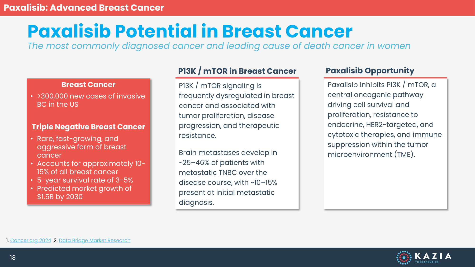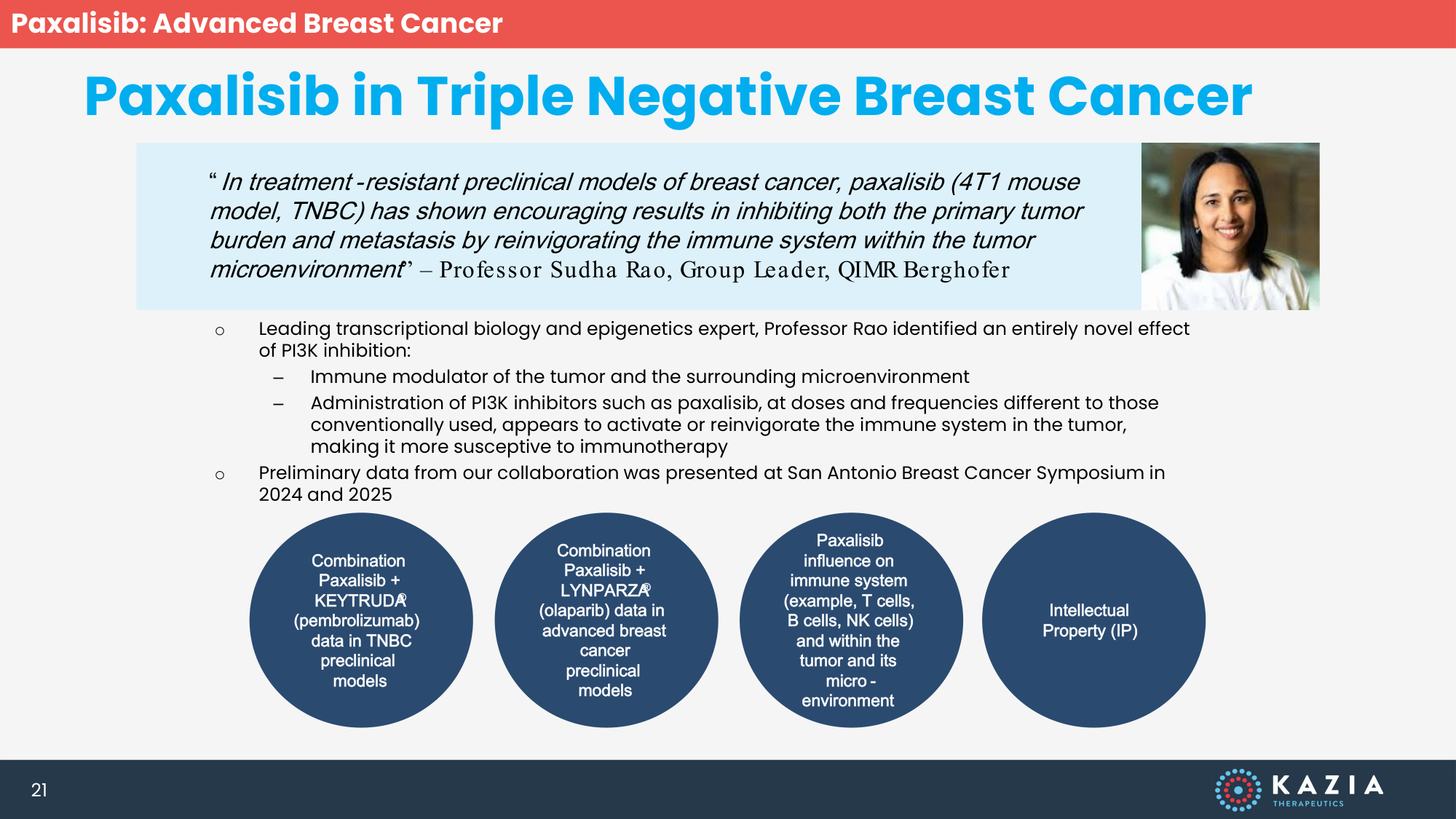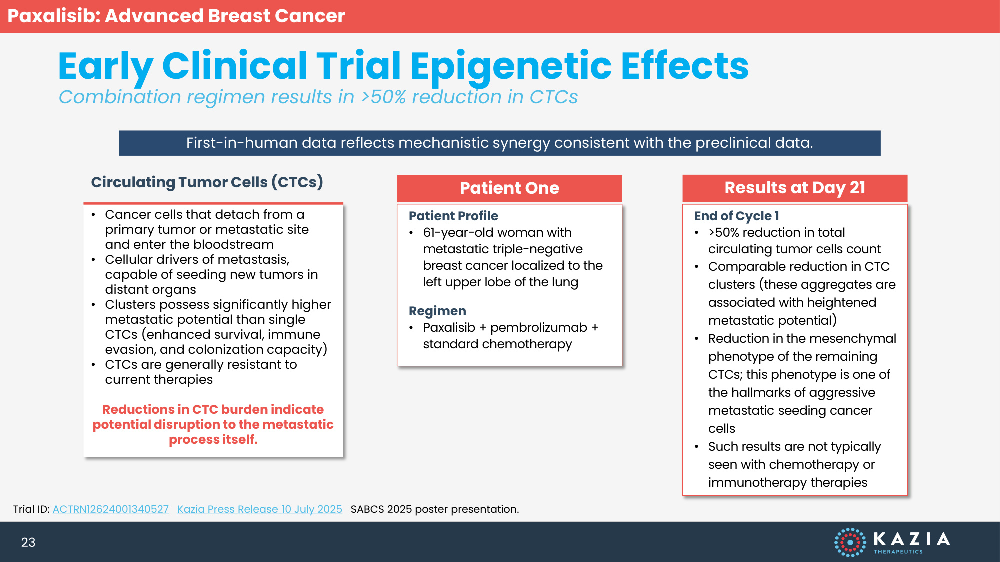 Paxalisib: Advanced Breast Cancer Early Clinical Trial Epigenetic Effects Trial ID: ACTRN12624001340527 Kazia Press Release 10 July 2025 SABCS 2025 poster presentation. First-in-human data reflects mechanistic synergy consistent with the preclinical data. Combination regimen results in >50% reduction in CTCs Patient Profile • 61-year-old woman with metastatic triple-negative breast cancer localized to the left upper lobe of the lung Regimen • Paxalisib + pembrolizumab + standard chemotherapy Patient One Results at Day 21 End of Cycle 1 • >50% reduction in total circulating tumor cells count • Comparable reduction in CTC clusters (these aggregates are associated with heightened metastatic potential) • Reduction in the mesenchymal phenotype of the remaining CTCs; this phenotype is one of the hallmarks of aggressive metastatic seeding cancer cells • Such results are not typically seen with chemotherapy or immunotherapy therapies • Cancer cells that detach from a primary tumor or metastatic site and enter the bloodstream • Cellular drivers of metastasis, capable of seeding new tumors in distant organs • Clusters possess significantly higher metastatic potential than single CTCs (enhanced survival, immune evasion, and colonization capacity) • CTCs are generally resistant to current therapies Reductions in CTC burden indicate potential disruption to the metastatic process itself. Circulating Tumor Cells (CTCs) 23