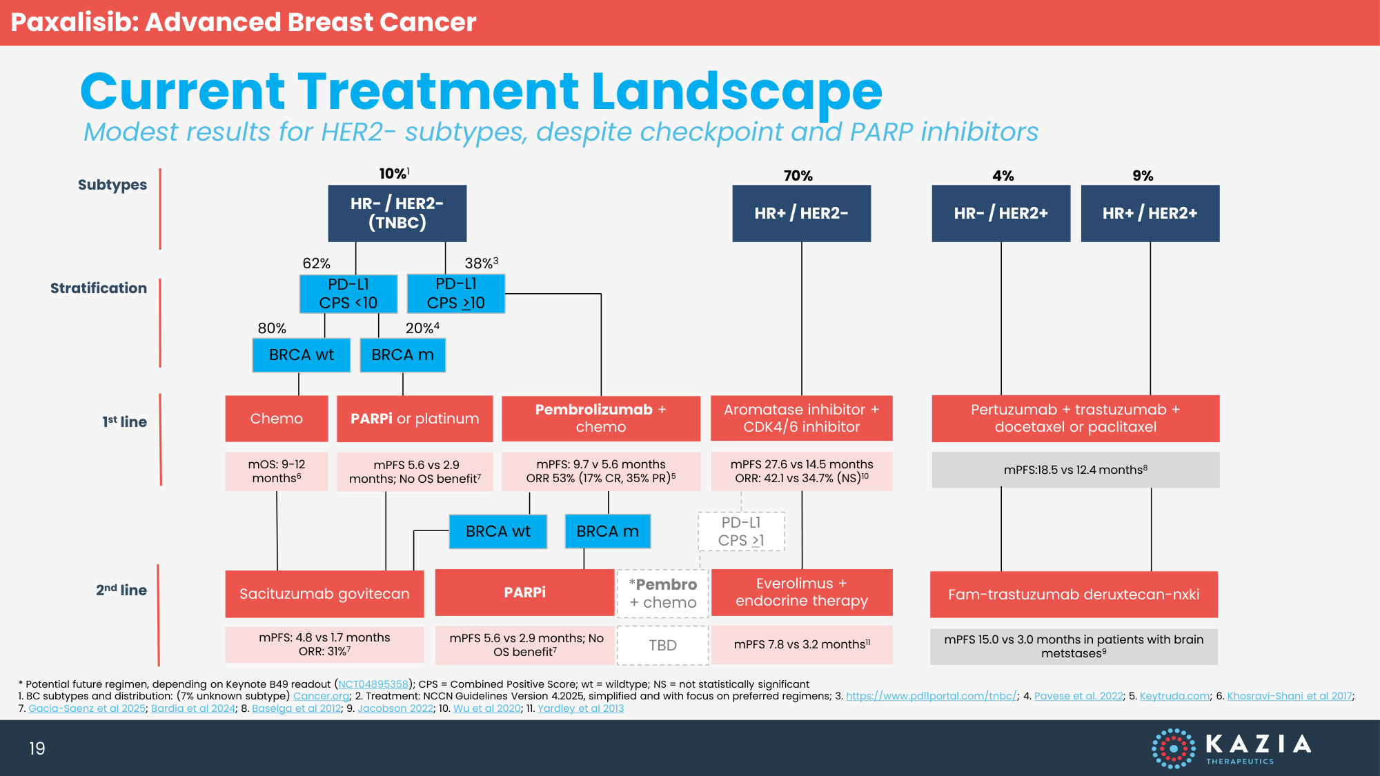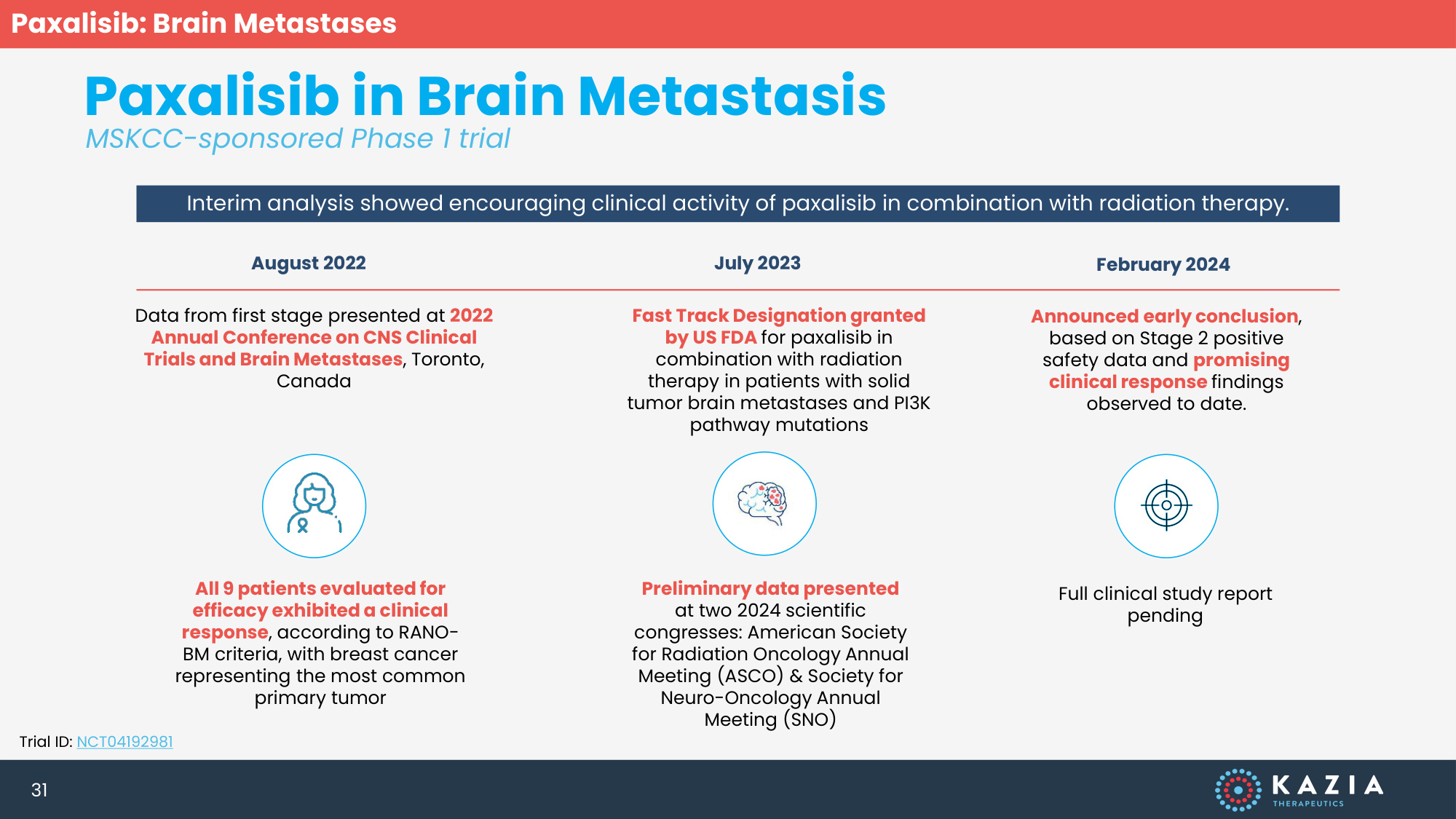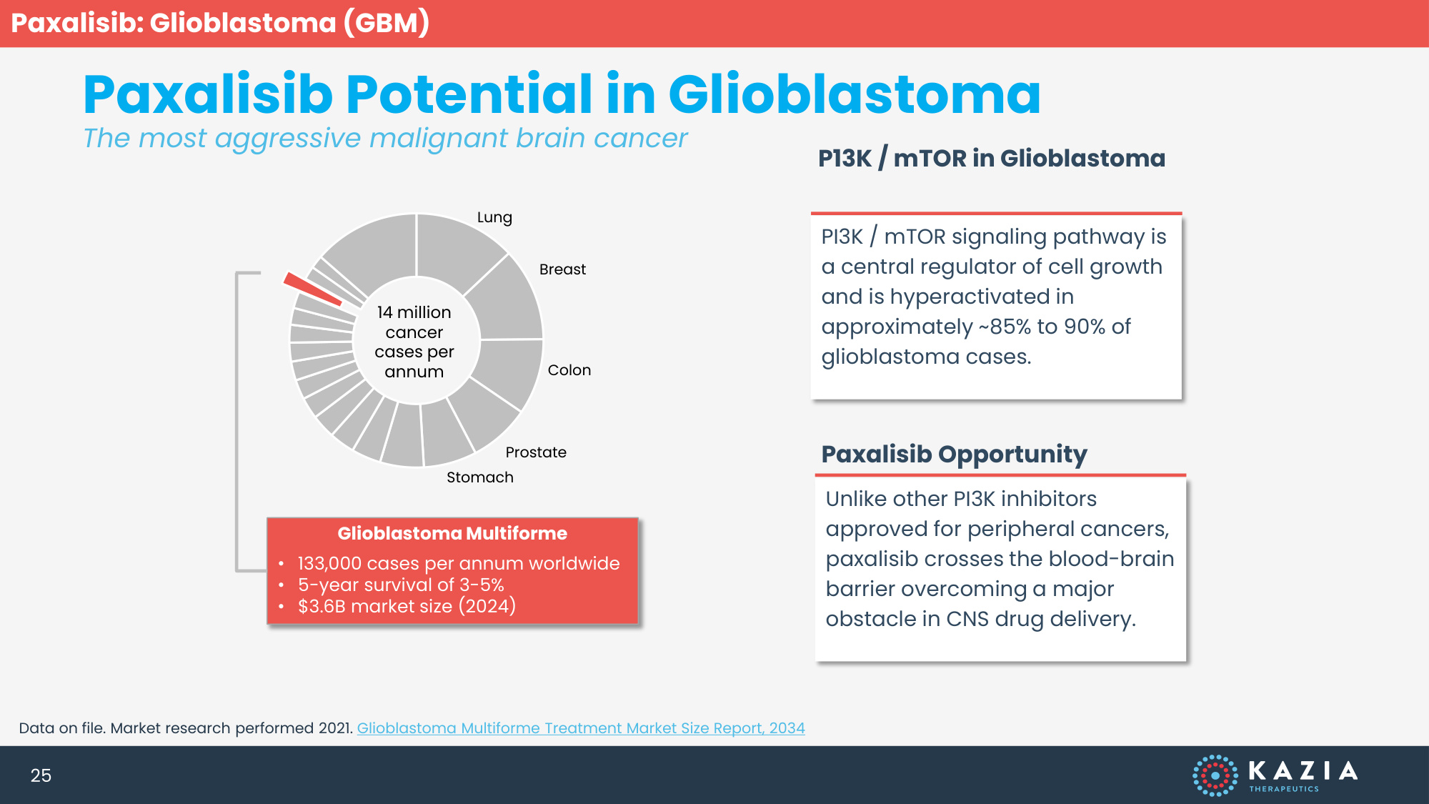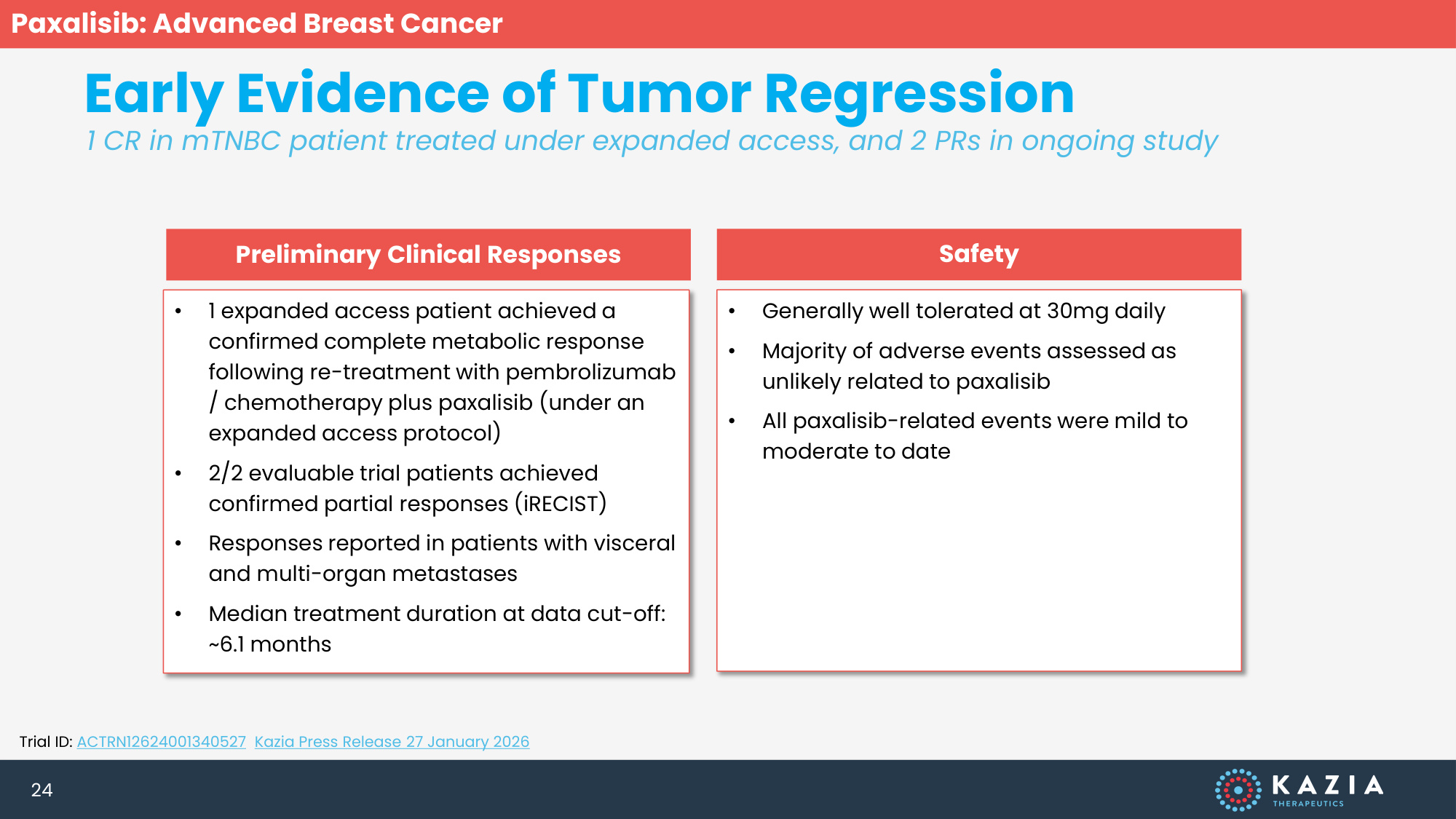 24 Trial ID: ACTRN12624001340527 Kazia Press Release 27 January 2026 • Generally well tolerated at 30mg daily • Majority of adverse events assessed as unlikely related to paxalisib • All paxalisib-related events were mild to moderate to date 1 CR in mTNBC patient treated under expanded access, and 2 PRs in ongoing study Paxalisib: Advanced Breast Cancer Early Evidence of Tumor Regression Safety Preliminary Clinical Responses • 1 expanded access patient achieved a confirmed complete metabolic response following re-treatment with pembrolizumab / chemotherapy plus paxalisib (under an expanded access protocol) • 2/2 evaluable trial patients achieved confirmed partial responses (iRECIST) • Responses reported in patients with visceral and multi-organ metastases • Median treatment duration at data cut-off: ~6.1 months
