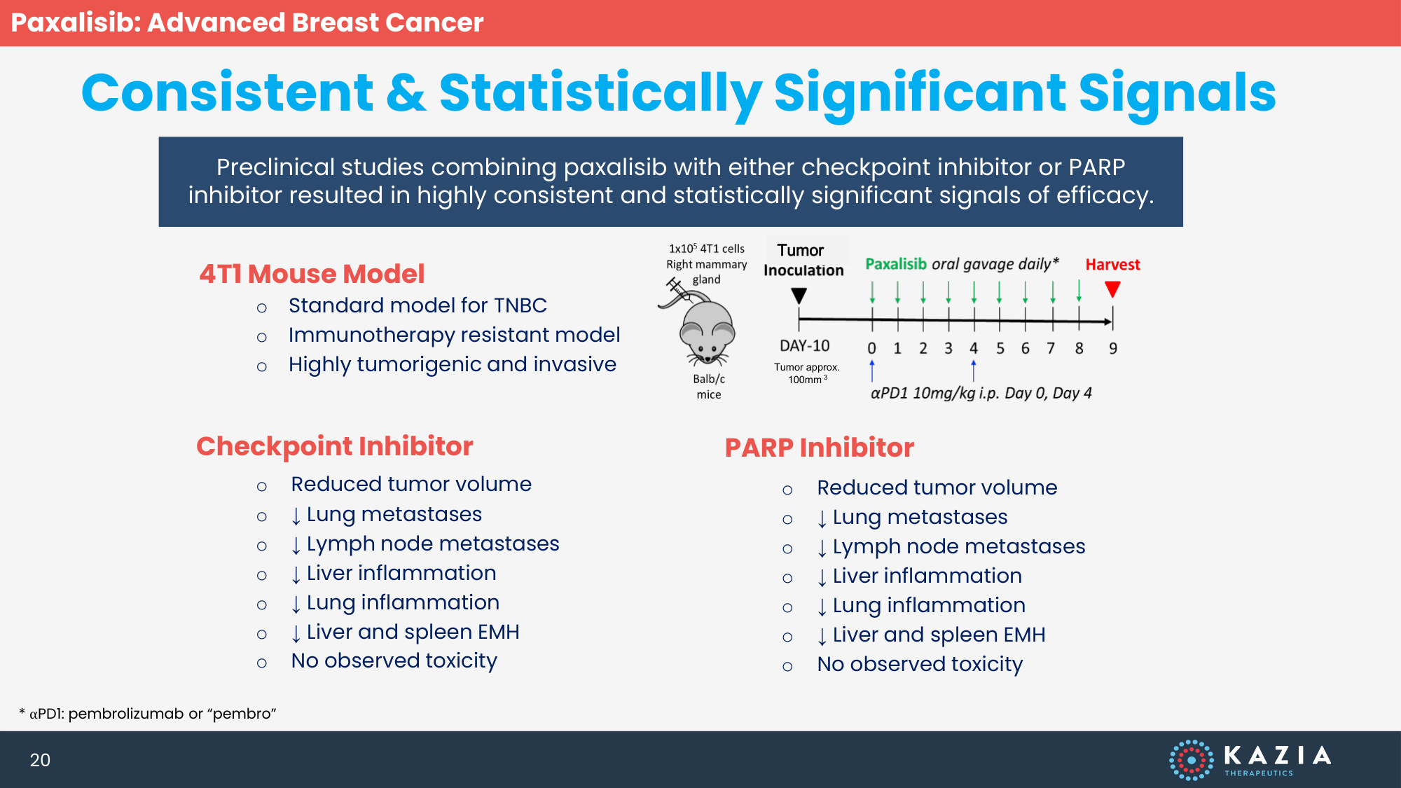Paxalisib: Advanced Breast Cancer Current Treatment Landscape 19 * Potential future regimen, depending on Keynote B49 readout (NCT04895358); CPS = Combined Positive Score; wt = wildtype; NS = not statistically significant 1. BC subtypes and distribution: (7% unknown subtype) Cancer.org; 2. Treatment: NCCN Guidelines Version 4.2025, simplified and with focus on preferred regimens; 3. https://www.pdl1portal.com/tnbc/; 4. Pavese et al. 2022; 5. Keytruda.com; 6. Khosravi-Shani et al 2017; 7. Gacia-Saenz et al 2025; Bardia et al 2024; 8. Baselga et al 2012; 9. Jacobson 2022; 10. Wu et al 2020; 11. Yardley et al 2013 HR+ / HER2+ HR- / HER2+ HR+ / HER2- PD-L1 CPS <10 PD-L1 CPS >10 mPFS:18.5 vs 12.4 months8 mPFS: 9.7 v 5.6 months ORR 53% (17% CR, 35% PR)5 mPFS 15.0 vs 3.0 months in patients with brain metstases9 mPFS 5.6 vs 2.9 months; No OS benefit7 mOS: 9-12 months6 mPFS 27.6 vs 14.5 months ORR: 42.1 vs 34.7% (NS)10 BRCA m mPFS: 4.8 vs 1.7 months ORR: 31%7 mPFS 5.6 vs 2.9 months; No OS benefit7 mPFS 7.8 vs 3.2 months11 BRCA wt 70% 9% 4% 10%1 38%3 62% 20%4 80% PD-L1 CPS >1 *Pembro + chemo TBD Chemo PARPi Sacituzumab govitecan Pembrolizumab + chemo PARPi or platinum Aromatase inhibitor + CDK4/6 inhibitor Everolimus + endocrine therapy Pertuzumab + trastuzumab + docetaxel or paclitaxel Fam-trastuzumab deruxtecan-nxki HR- / HER2- (TNBC) BRCA wt Modest results for HER2- subtypes, despite checkpoint and PARP inhibitors BRCA m Subtypes Stratification 1st line 2nd line