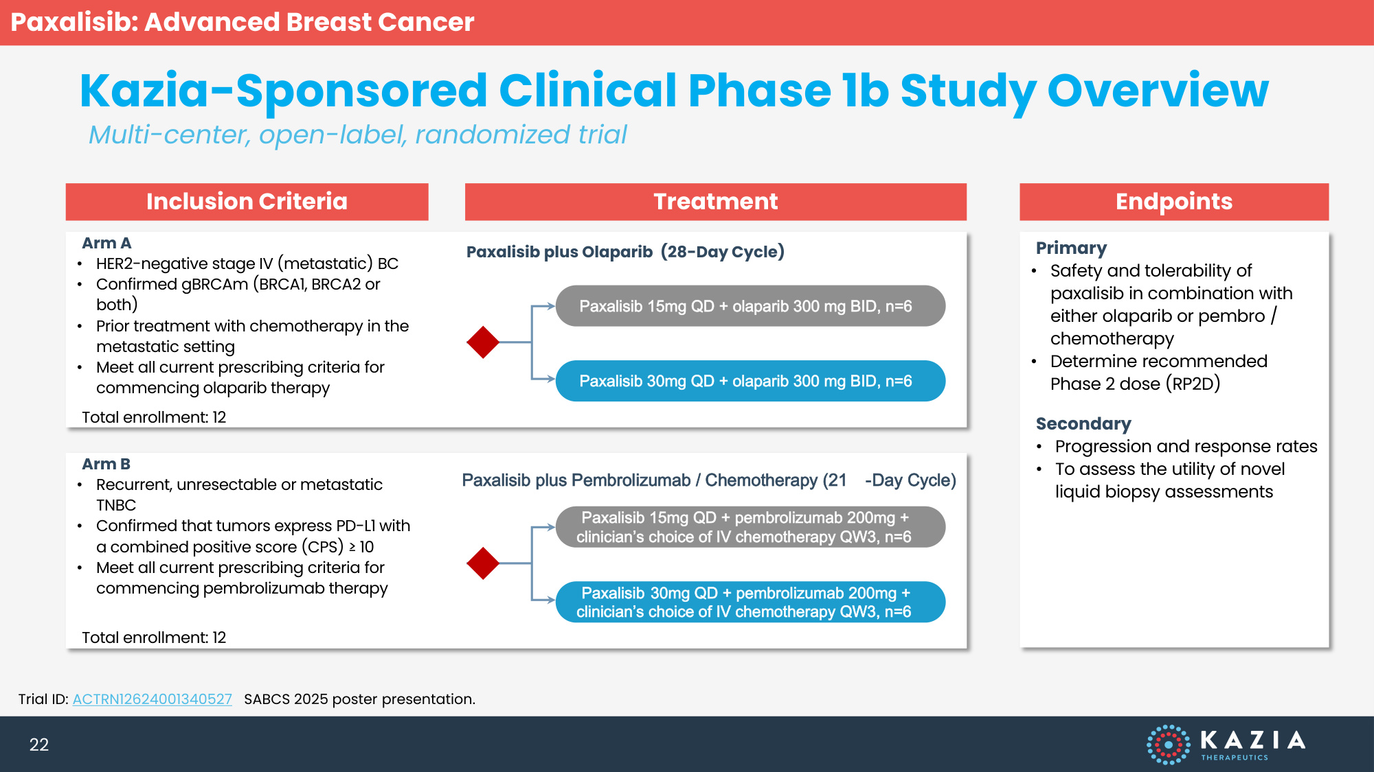 Paxalisib: Advanced Breast Cancer Paxalisib in Triple Negative Breast Cancer 21 "In treatment -resistant preclinical models of breast cancer, paxalisib (4T1 mouse model, TNBC) has shown encouraging results in inhibiting both the primary tumor burden and metastasis by reinvigorating the immune system within the tumor microenvironment" – Professor Sudha Rao, Group Leader, QIMR Berghofer Combination Paxalisib + KEYTRUDA® (pembrolizumab) data in TNBC preclinical models Combination Paxalisib + LYNPARZA® (olaparib) data in advanced breast cancer preclinical models Paxalisib influence on immune system (example, T cells, B cells, NK cells) and within the tumor and its micro - environment Intellectual Property (IP) o Leading transcriptional biology and epigenetics expert, Professor Rao identified an entirely novel effect of PI3K inhibition: – Immune modulator of the tumor and the surrounding microenvironment – Administration of PI3K inhibitors such as paxalisib, at doses and frequencies different to those conventionally used, appears to activate or reinvigorate the immune system in the tumor, making it more susceptive to immunotherapy o Preliminary data from our collaboration was presented at San Antonio Breast Cancer Symposium in 2024 and 2025