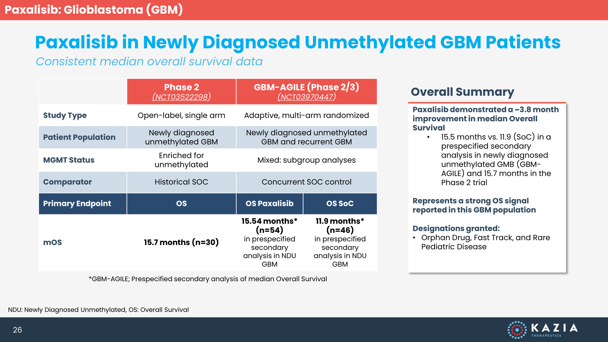 Paxalisib: Glioblastoma (GBM) Paxalisib Potential in Glioblastoma 25 Data on file. Market research performed 2021. Glioblastoma Multiforme Treatment Market Size Report, 2034 PI3K / mTOR signaling pathway is a central regulator of cell growth and is hyperactivated in approximately ~85% to 90% of glioblastoma cases.. P13K / mTOR in Glioblastoma Lung 14 million cancer cases per annum Breast Colon Prostate Stomach Glioblastoma Multiforme • 133,000 cases per annum worldwide • 5-year survival of 3-5% • $3.6B market size (2024) The most aggressive malignant brain cancer Unlike other PI3K inhibitors approved for peripheral cancers, paxalisib crosses the blood-brain barrier overcoming a major obstacle in CNS drug delivery. Paxalisib Opportunity