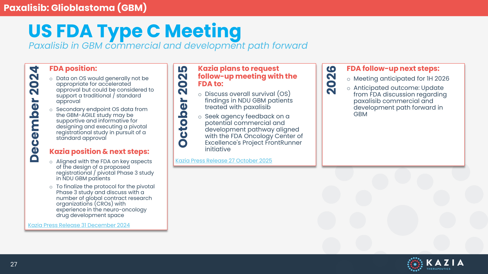 27 Paxalisib: Glioblastoma (GBM) US FDA Type C Meeting FDA position: o Data on OS would generally not be appropriate for accelerated approval but could be considered to support a traditional / standard approval o Secondary endpoint OS data from the GBM-AGILE study may be supportive and informative for designing and executing a pivotal registrational study in pursuit of a standard approval Kazia position & next steps: o Aligned with the FDA on key aspects of the design of a proposed registrational / pivotal Phase 3 study in NDU GBM patients o To finalize the protocol for the pivotal Phase 3 study and discuss with a number of global contract research organizations (CROs) with experience in the neuro-oncology drug development space December 2024 Kazia plans to request follow-up meeting with the FDA to: o Discuss overall survival (OS) findings in NDU GBM patients treated with paxalisib o Seek agency feedback on a potential commercial and development pathway aligned with the FDA Oncology Center of Excellence's Project FrontRunner initiative October 2025 FDA follow-up next steps: o Meeting anticipated for 1H 2026 o Anticipated outcome: Update from FDA discussion regarding paxalisib commercial and development path forward in GBM 2026 Paxalisib in GBM commercial and development path forward Kazia Press Release 27 October 2025 Kazia Press Release 31 December 2024