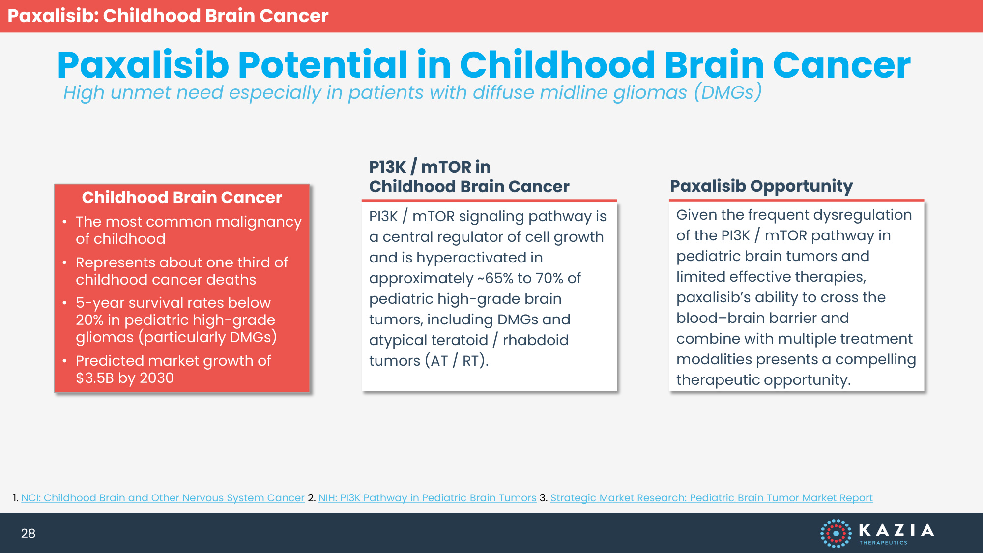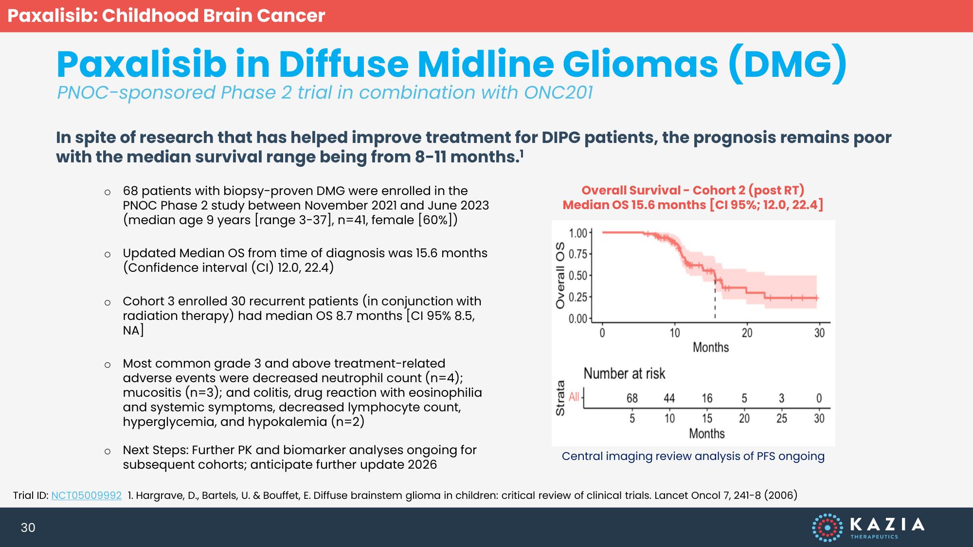 Paxalisib: Childhood Brain Cancer Paxalisib in Diffuse Midline Gliomas (DMG) 30 Trial ID: NCT05009992 1. Hargrave, D., Bartels, U. & Bouffet, E. Diffuse brainstem glioma in children: critical review of clinical trials. Lancet Oncol 7, 241-8 (2006) In spite of research that has helped improve treatment for DIPG patients, the prognosis remains poor with the median survival range being from 8-11 months.1 Overall Survival - Cohort 2 (post RT) Median OS 15.6 months [CI 95%; 12.0, 22.4] Central imaging review analysis of PFS ongoing PNOC-sponsored Phase 2 trial in combination with ONC201 o 68 patients with biopsy-proven DMG were enrolled in the PNOC Phase 2 study between November 2021 and June 2023 (median age 9 years [range 3-37], n=41, female [60%]) o Updated Median OS from time of diagnosis was 15.6 months (Confidence interval (CI) 12.0, 22.4) o Cohort 3 enrolled 30 recurrent patients (in conjunction with radiation therapy) had median OS 8.7 months [CI 95% 8.5, NA] o Most common grade 3 and above treatment-related adverse events were decreased neutrophil count (n=4); mucositis (n=3); and colitis, drug reaction with eosinophilia and systemic symptoms, decreased lymphocyte count, hyperglycemia, and hypokalemia (n=2) o Next Steps: Further PK and biomarker analyses ongoing for subsequent cohorts; anticipate further update 2026
