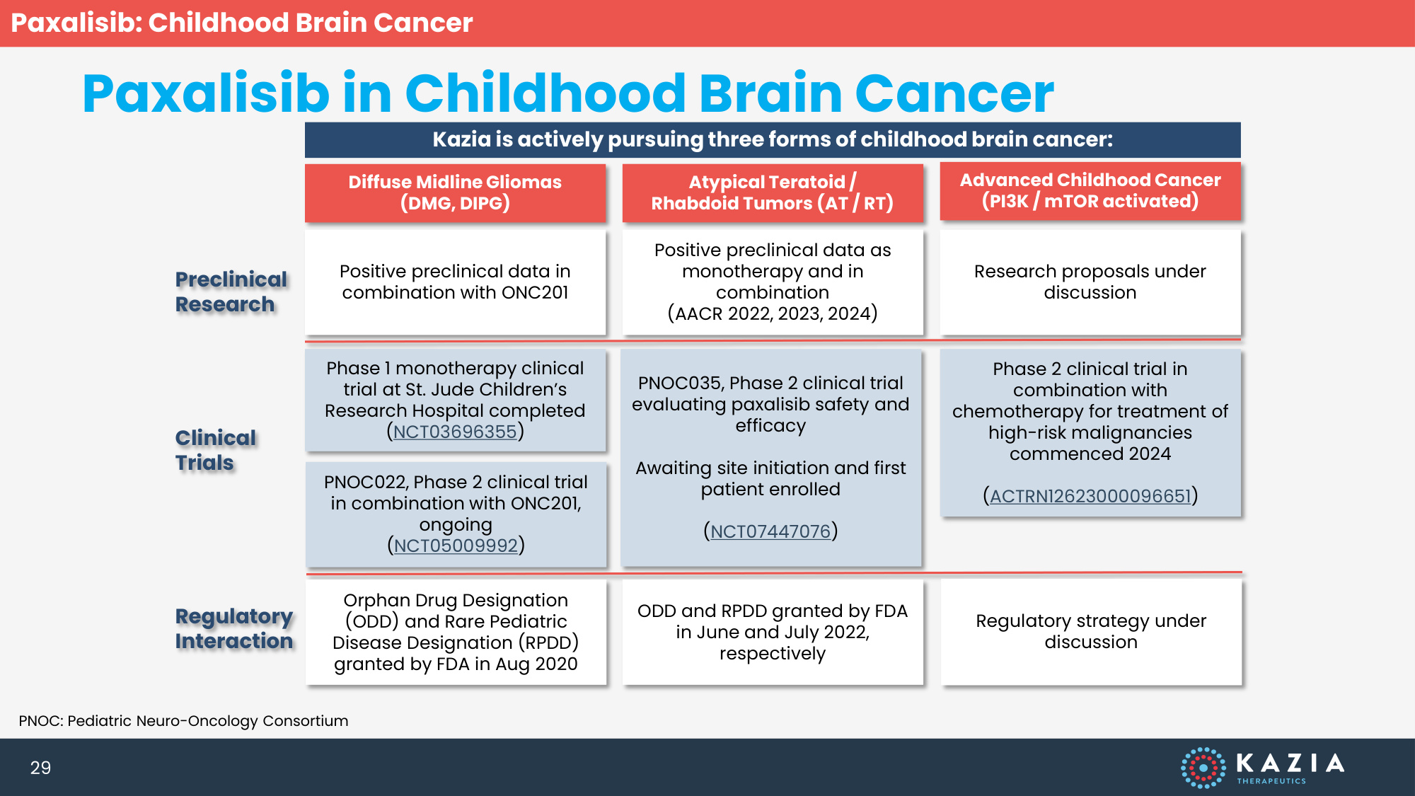 Paxalisib: Childhood Brain Cancer Paxalisib Potential in Childhood Brain Cancer 28 1. NCI: Childhood Brain and Other Nervous System Cancer 2. NIH: PI3K Pathway in Pediatric Brain Tumors 3. Strategic Market Research: Pediatric Brain Tumor Market Report Childhood Brain Cancer • The most common malignancy of childhood • Represents about one third of childhood cancer deaths • 5-year survival rates below 20% in pediatric high-grade gliomas (particularly DMGs) • Predicted market growth of $3.5B by 2030 Given the frequent dysregulation of the PI3K / mTOR pathway in pediatric brain tumors and limited effective therapies, paxalisib's ability to cross the blood–brain barrier and combine with multiple treatment modalities presents a compelling therapeutic opportunity. PI3K / mTOR signaling pathway is a central regulator of cell growth and is hyperactivated in approximately ~65% to 70% of pediatric high-grade brain tumors, including DMGs and atypical teratoid / rhabdoid tumors (AT / RT).. High unmet need especially in patients with diffuse midline gliomas (DMGs) P13K / mTOR in Childhood Brain Cancer Paxalisib Opportunity