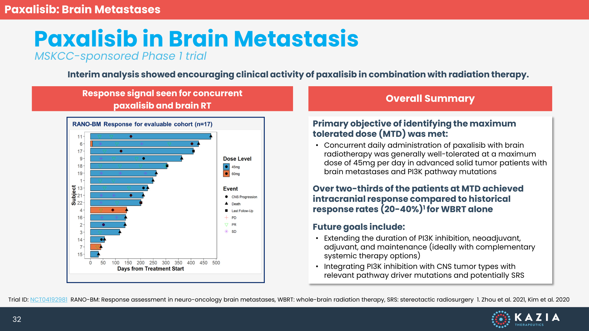 Paxalisib: Brain Metastases Paxalisib in Brain Metastasis 31 Trial ID: NCT04192981 Interim analysis showed encouraging clinical activity of paxalisib in combination with radiation therapy. August 2022 July 2023 February 2024 Data from first stage presented at 2022 Annual Conference on CNS Clinical Trials and Brain Metastases, Toronto, Canada All 9 patients evaluated for efficacy exhibited a clinical response, according to RANO- BM criteria, with breast cancer representing the most common primary tumor Fast Track Designation granted by US FDA for paxalisib in combination with radiation therapy in patients with solid tumor brain metastases and PI3K pathway mutations Announced early conclusion, based on Stage 2 positive safety data and promising clinical response findings observed to date. Full clinical study report pending MSKCC-sponsored Phase 1 trial Preliminary data presented at two 2024 scientific congresses: American Society for Radiation Oncology Annual Meeting (ASCO) & Society for Neuro-Oncology Annual Meeting (SNO)