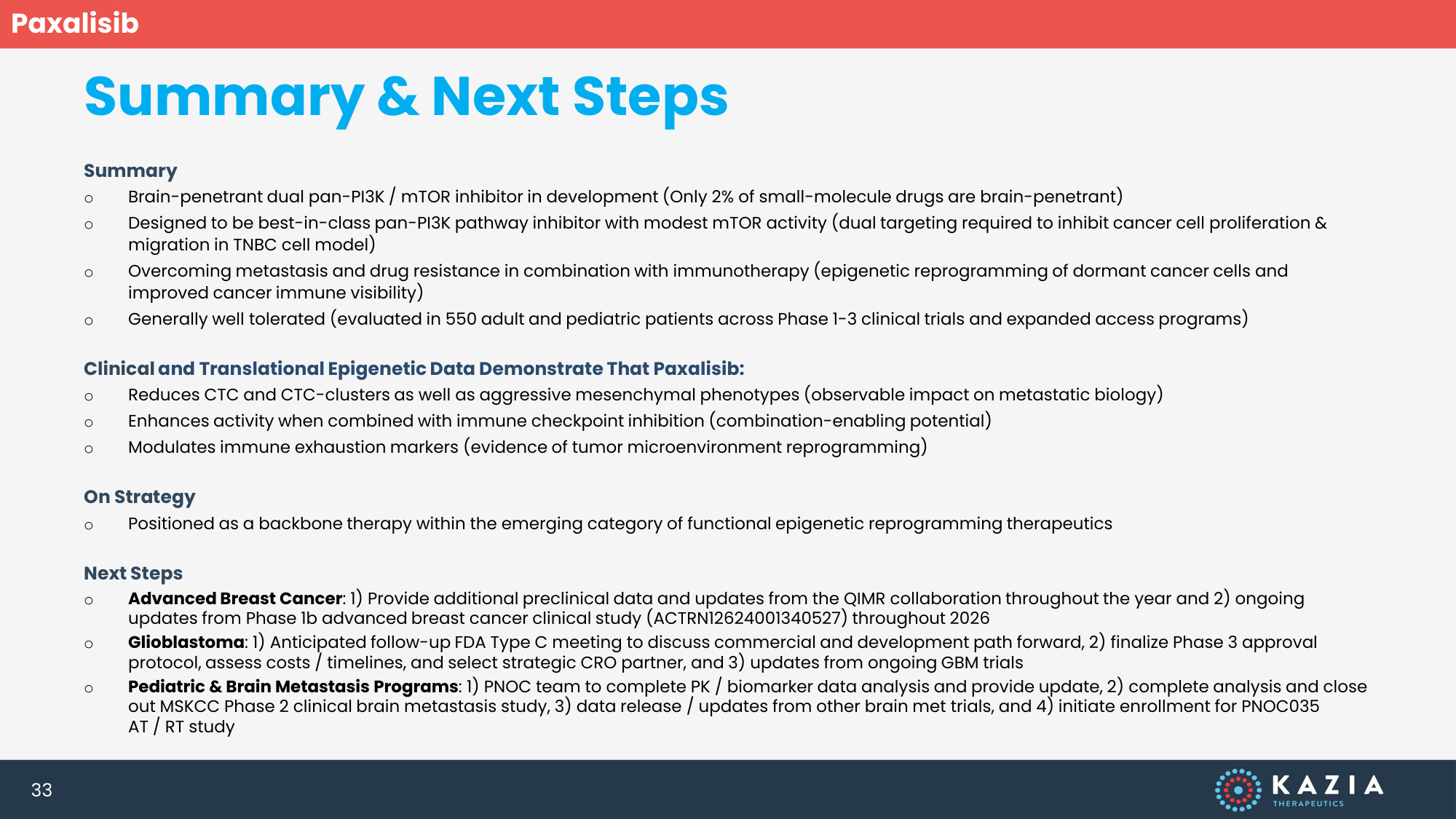 Paxalisib: Advanced Breast Cancer Kazia-Sponsored Clinical Phase 1b Study Overview Multi-center, open-label, randomized trial Inclusion Criteria Endpoints Treatment Arm B • Recurrent, unresectable or metastatic TNBC • Confirmed that tumors express PD-L1 with a combined positive score (CPS) ≥ 10 • Meet all current prescribing criteria for commencing pembrolizumab therapy Total enrollment: 12 Paxalisib 15mg QD + olaparib 300 mg BID, n=6 Paxalisib 30mg QD + olaparib 300 mg BID, n=6 Paxalisib plus Olaparib (28-Day Cycle) Primary • Safety and tolerability of paxalisib in combination with either olaparib or pembro / chemotherapy • Determine recommended Phase 2 dose (RP2D) Secondary • Progression and response rates • To assess the utility of novel liquid biopsy assessments Arm A • HER2-negative stage IV (metastatic) BC • Confirmed gBRCAm (BRCA1, BRCA2 or both) • Prior treatment with chemotherapy in the metastatic setting • Meet all current prescribing criteria for commencing olaparib therapy Total enrollment: 12 Paxalisib 15mg QD + pembrolizumab 200mg + clinician's choice of IV chemotherapy QW3, n=6 Paxalisib 30mg QD + pembrolizumab 200mg + clinician's choice of IV chemotherapy QW3, n=6 Paxalisib plus Pembrolizumab / Chemotherapy (21 -Day Cycle) 22 Trial ID: ACTRN12624001340527 SABCS 2025 poster presentation.