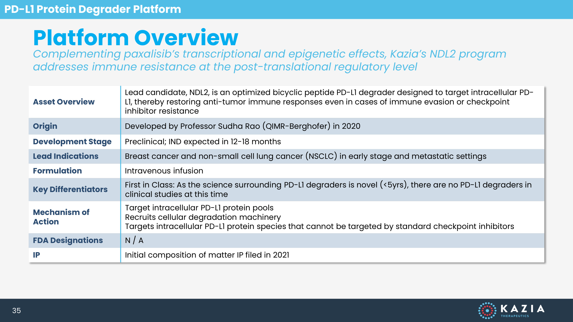 PD-L1 Protein Degrader Platform Platform Overview 35 Asset Overview Lead candidate, NDL2, is an optimized bicyclic peptide PD-L1 degrader designed to target intracellular PD- L1, thereby restoring anti-tumor immune responses even in cases of immune evasion or checkpoint inhibitor resistance Origin Developed by Professor Sudha Rao (QIMR-Berghofer) in 2020 Development Stage Preclinical; IND expected in 12-18 months Lead Indications Breast cancer and non-small cell lung cancer (NSCLC) in early stage and metastatic settings Formulation Intravenous infusion Key Differentiators First in Class: As the science surrounding PD-L1 degraders is novel (<5yrs), there are no PD-L1 degraders in clinical studies at this time Mechanism of Action Target intracellular PD-L1 protein pools Recruits cellular degradation machinery Targets intracellular PD-L1 protein species that cannot be targeted by standard checkpoint inhibitors FDA Designations N / A IP Initial composition of matter IP filed in 2021 Complementing paxalisib's transcriptional and epigenetic effects, Kazia's NDL2 program addresses immune resistance at the post-translational regulatory level