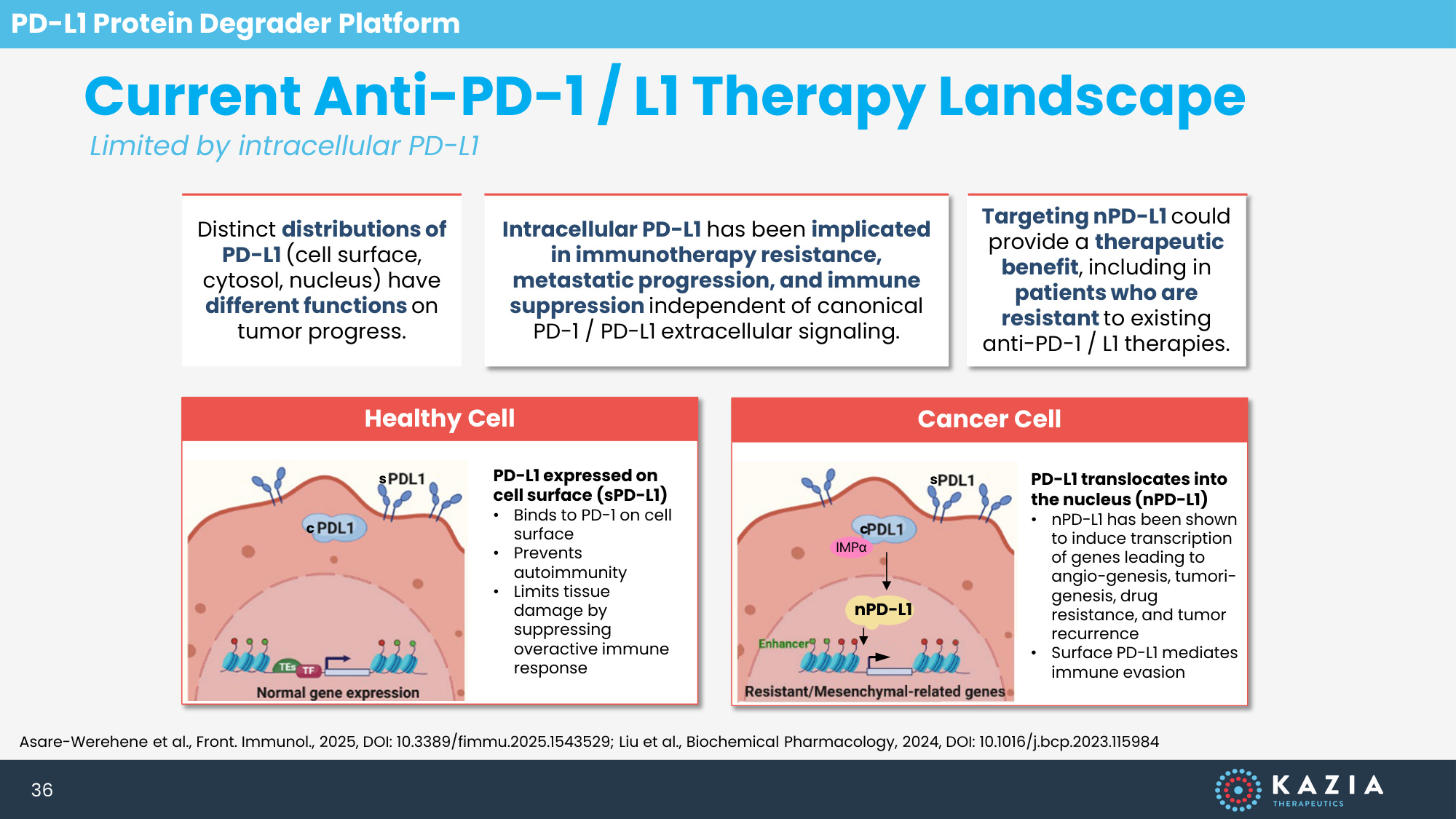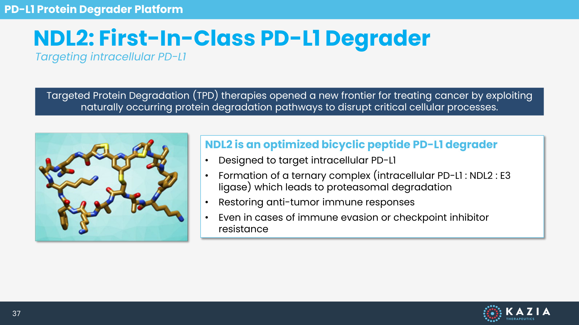 PD-L1 Protein Degrader Platform Current Anti-PD-1 / L1 Therapy Landscape 36 Asare-Werehene et al., Front. Immunol., 2025, DOI: 10.3389/fimmu.2025.1543529; Liu et al., Biochemical Pharmacology, 2024, DOI: 10.1016/j.bcp.2023.115984 Healthy Cell PD-L1 expressed on cell surface (sPD-L1) • Binds to PD-1 on cell surface • Prevents autoimmunity • Limits tissue damage by suppressing overactive immune response s c Cancer Cell PD-L1 translocates into the nucleus (nPD-L1) • nPD-L1 has been shown to induce transcription of genes leading to angio-genesis, tumori- genesis, drug resistance, and tumor recurrence • Surface PD-L1 mediates immune evasion nPD-L1 s IMPα c Distinct distributions of PD-L1 (cell surface, cytosol, nucleus) have different functions on tumor progress. Intracellular PD-L1 has been implicated in immunotherapy resistance, metastatic progression, and immune suppression independent of canonical PD-1 / PD-L1 extracellular signaling. Targeting nPD-L1 could provide a therapeutic benefit, including in patients who are resistant to existing anti-PD-1 / L1 therapies. Limited by intracellular PD-L1