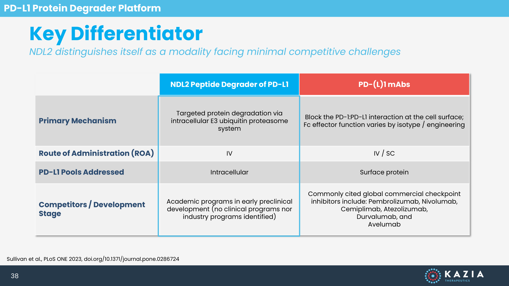 PD-L1 Protein Degrader Platform NDL2: First-In-Class PD-L1 Degrader 37 Targeted Protein Degradation (TPD) therapies opened a new frontier for treating cancer by exploiting naturally occurring protein degradation pathways to disrupt critical cellular processes. NDL2 is an optimized bicyclic peptide PD-L1 degrader • Designed to target intracellular PD-L1 • Formation of a ternary complex (intracellular PD-L1 : NDL2 : E3 ligase) which leads to proteasomal degradation • Restoring anti-tumor immune responses • Even in cases of immune evasion or checkpoint inhibitor resistance Targeting intracellular PD-L1