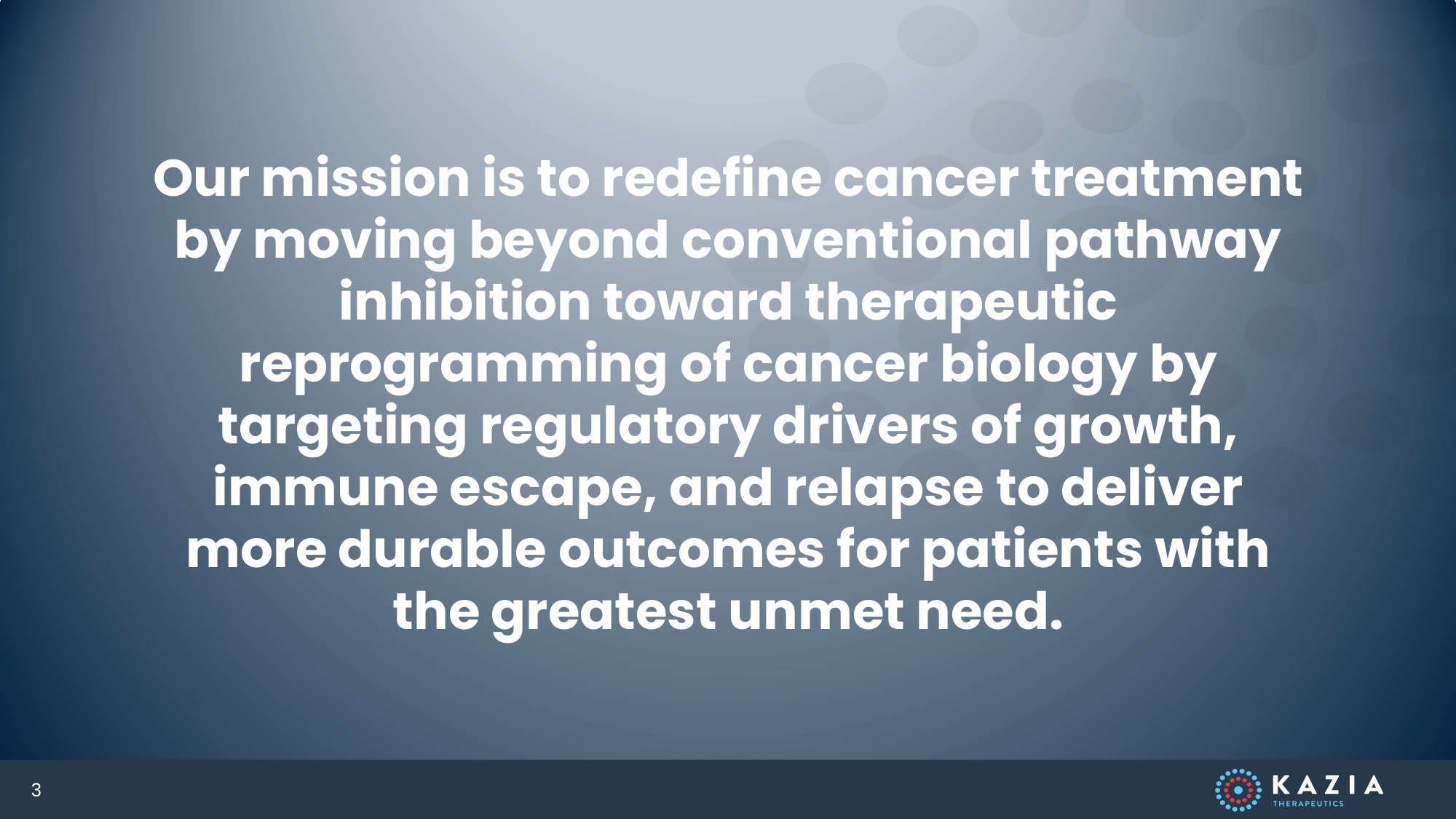 3 Our mission is to redefine cancer treatment by moving beyond conventional pathway inhibition toward therapeutic reprogramming of cancer biology by targeting regulatory drivers of growth, immune escape, and relapse to deliver more durable outcomes for patients with the greatest unmet need.