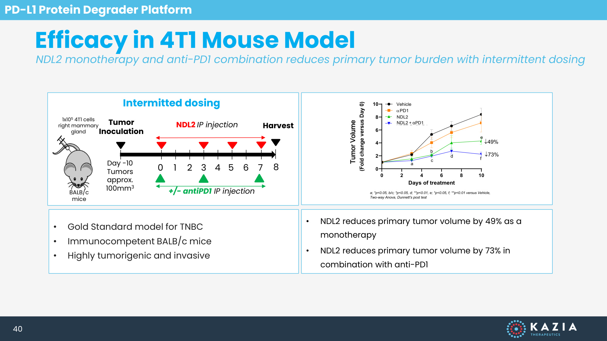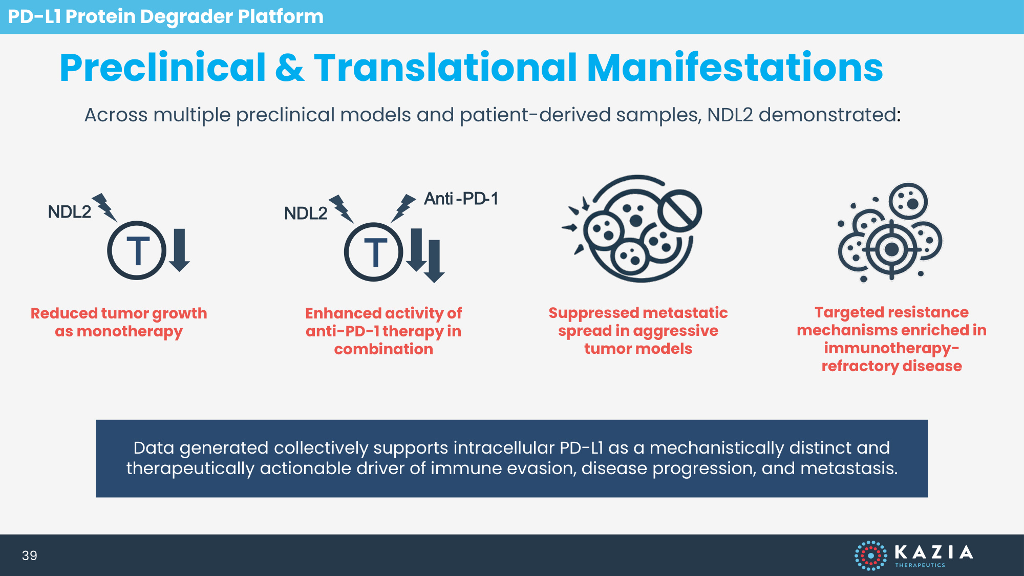 PD-L1 Protein Degrader Platform Preclinical & Translational Manifestations 39 Across multiple preclinical models and patient-derived samples, NDL2 demonstrated: Data generated collectively supports intracellular PD-L1 as a mechanistically distinct and therapeutically actionable driver of immune evasion, disease progression, and metastasis. Reduced tumor growth as monotherapy Enhanced activity of anti-PD-1 therapy in combination Suppressed metastatic spread in aggressive tumor models Targeted resistance mechanisms enriched in immunotherapy- refractory disease T Anti -PD-1 NDL2 T NDL2