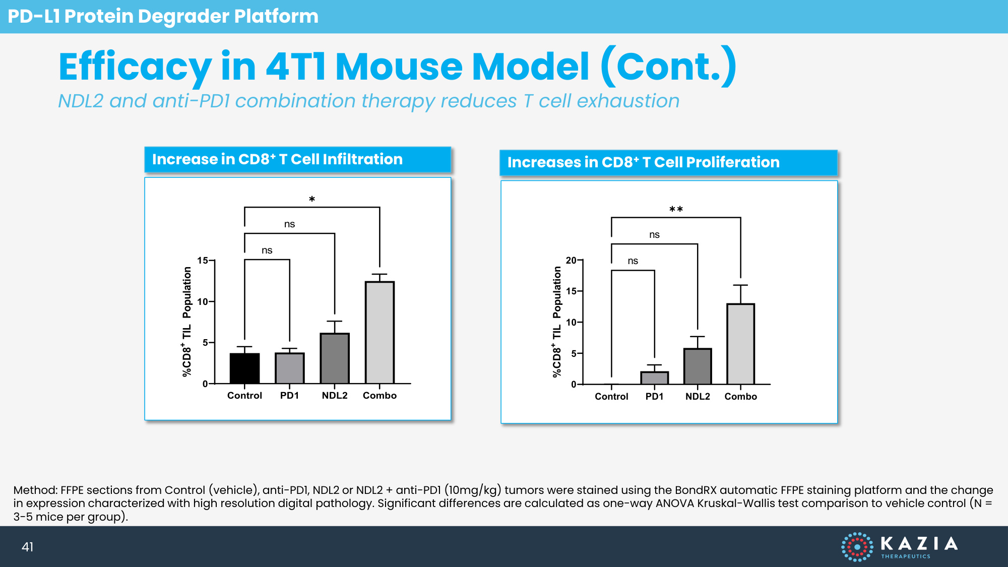 PD-L1 Protein Degrader Platform Efficacy in 4T1 Mouse Model 40 • Gold Standard model for TNBC • Immunocompetent BALB/c mice • Highly tumorigenic and invasive Intermitted dosing 0 Tumor Inoculation NDL2 IP injection Day -10 Tumors approx. 100mm3 1 2 3 4 5 6 Harvest 7 8 +/- antiPD1 IP injection 1x105 4T1 cells right mammary gland BALB/c mice 0 2 4 6 8 10 0 2 4 6 8 10 Days of treatment Tumour volume (Fold change versus Day 0) Vehicle αPD1 NDL2-D NDL2-D+αPD1 a b c d e f a; *p<0.05, b/c; *p<0.05, d; **p<0.01, e; *p<0.05, f; **p<0.01 versus Vehicle, Two-way Anova, Dunnett's post test ↓49% ↓73% • NDL2 reduces primary tumor volume by 49% as a monotherapy • NDL2 reduces primary tumor volume by 73% in combination with anti-PD1 NDL2 monotherapy and anti-PD1 combination reduces primary tumor burden with intermittent dosing NDL2 NDL2 + αPD1 Tumor Volume
