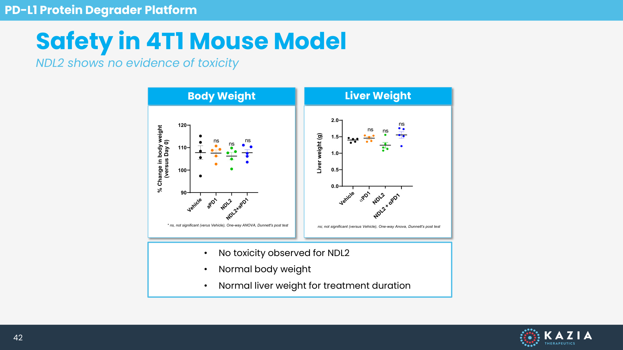 PD-L1 Protein Degrader Platform 41 Method: FFPE sections from Control (vehicle), anti-PD1, NDL2 or NDL2 + anti-PD1 (10mg/kg) tumors were stained using the BondRX automatic FFPE staining platform and the change in expression characterized with high resolution digital pathology. Significant differences are calculated as one-way ANOVA Kruskal-Wallis test comparison to vehicle control (N = 3-5 mice per group). Control PD1 NDL2 Combo 0 5 10 15 20 %CD8+ TIL Population ns ns ✱✱ Increases in CD8+ T Cell Proliferation Control PD1 NDL2 Combo 0 5 10 15 %CD8+ TIL Population ns ns ✱ Increase in CD8+ T Cell Infiltration Efficacy in 4T1 Mouse Model (Cont.) NDL2 and anti-PD1 combination therapy reduces T cell exhaustion