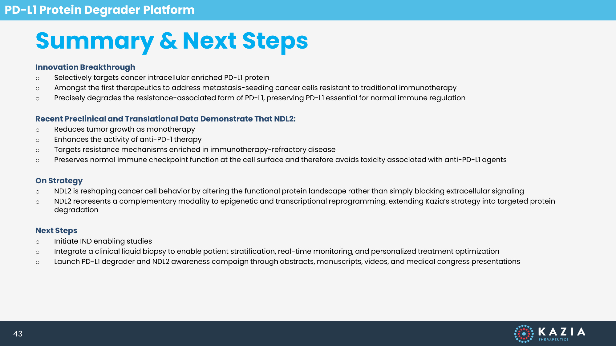 PD-L1 Protein Degrader Platform 42 Body Weight Vehicle aPD1 NDL2 NDL2+aPD1 90 100 110 120 % Change in body weight (versus Day 0) ns ns ns * ns, not significant (verus Vehicle), One-way ANOVA, Dunnett's post test • No toxicity observed for NDL2 • Normal body weight • Normal liver weight for treatment duration NDL2 shows no evidence of toxicity Safety in 4T1 Mouse Model Liver Weight Vehicle αPD1 NDL2-D NDL2-D+αPD1 0.0 0.5 1.0 1.5 2.0 Liver weight (g) ns; not significant (versus Vehicle), One-way Anova, Dunnett's post test ns ns ns