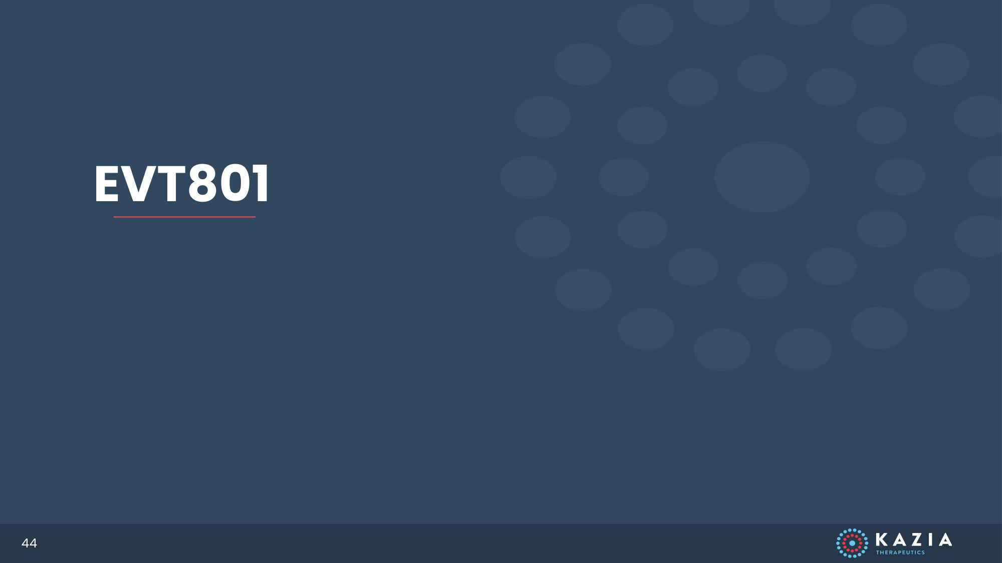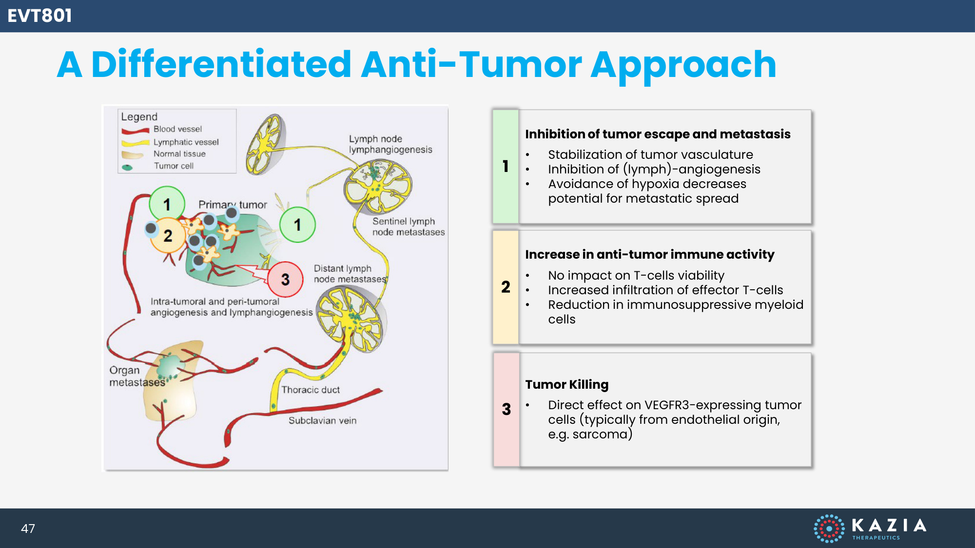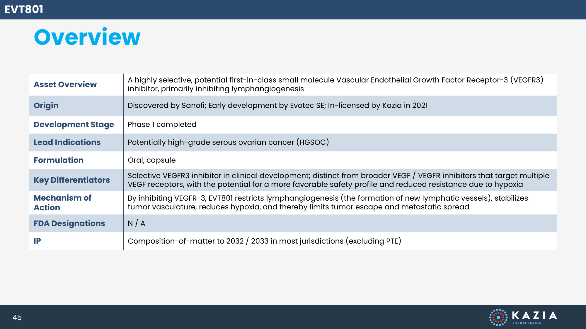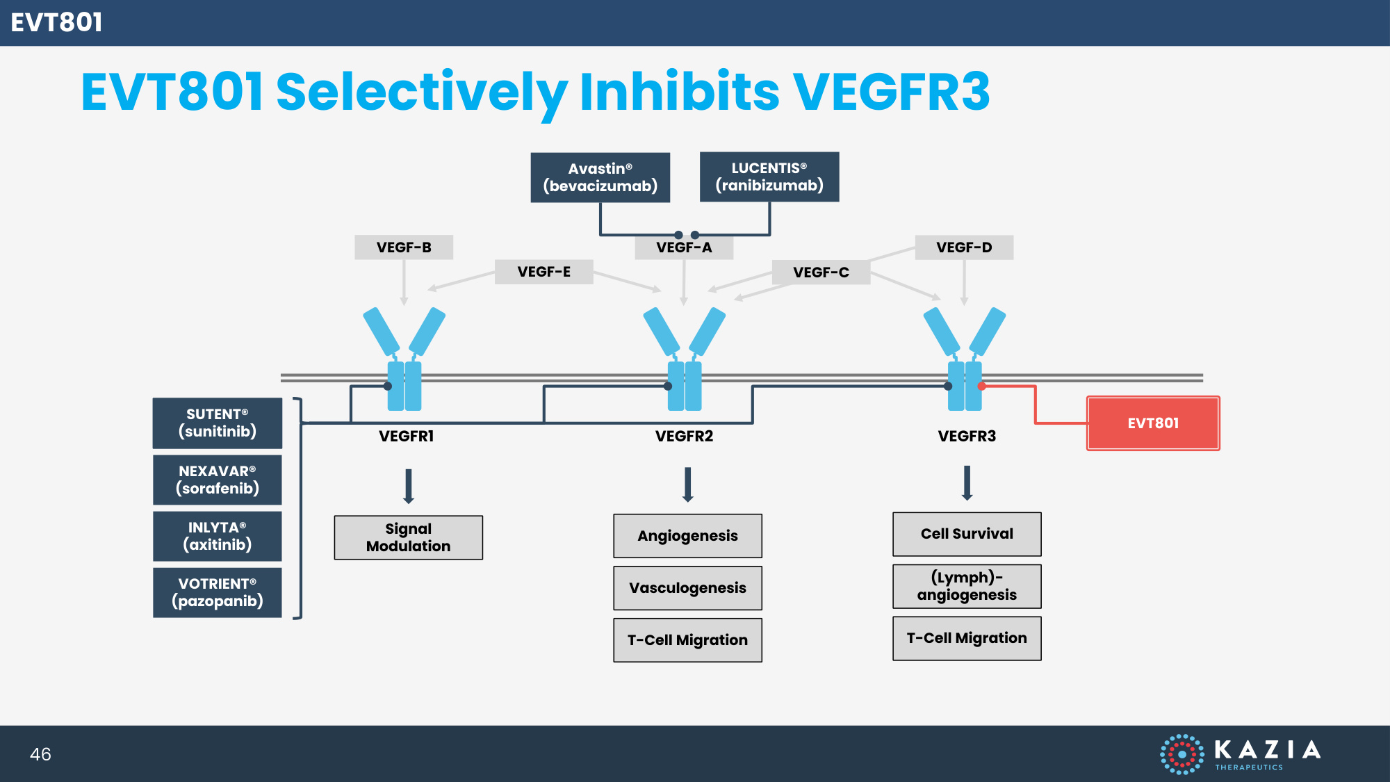 EVT801 45 Overview Asset Overview A highly selective, potential first-in-class small molecule Vascular Endothelial Growth Factor Receptor-3 (VEGFR3) inhibitor, primarily inhibiting lymphangiogenesis Origin Discovered by Sanofi; Early development by Evotec SE; In-licensed by Kazia in 2021 Development Stage Phase 1 completed Lead Indications Potentially high-grade serous ovarian cancer (HGSOC) Formulation Oral, capsule Key Differentiators Selective VEGFR3 inhibitor in clinical development; distinct from broader VEGF / VEGFR inhibitors that target multiple VEGF receptors, with the potential for a more favorable safety profile and reduced resistance due to hypoxia Mechanism of Action By inhibiting VEGFR-3, EVT801 restricts lymphangiogenesis (the formation of new lymphatic vessels), stabilizes tumor vasculature, reduces hypoxia, and thereby limits tumor escape and metastatic spread FDA Designations N / A IP Composition-of-matter to 2032 / 2033 in most jurisdictions (excluding PTE)