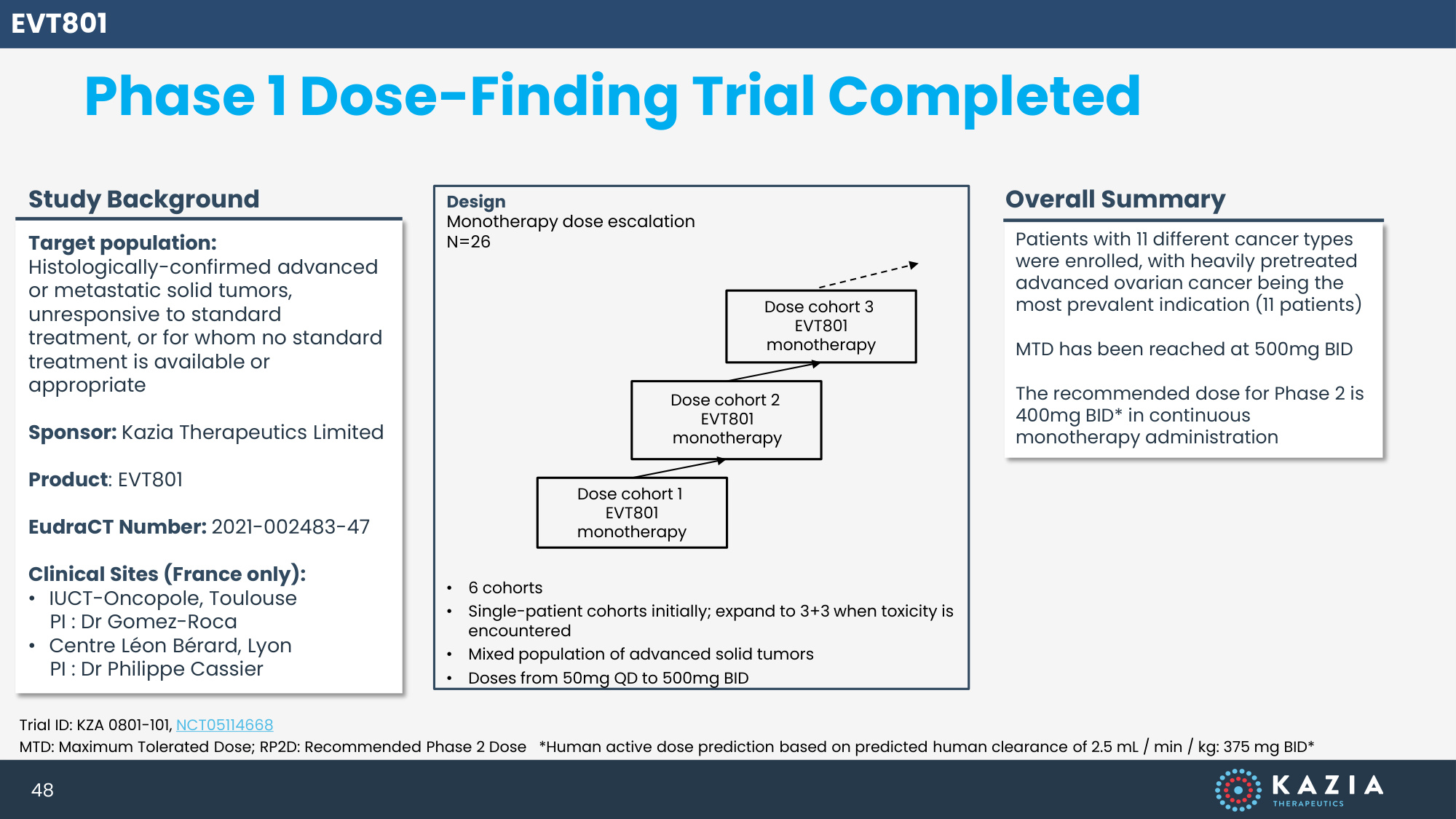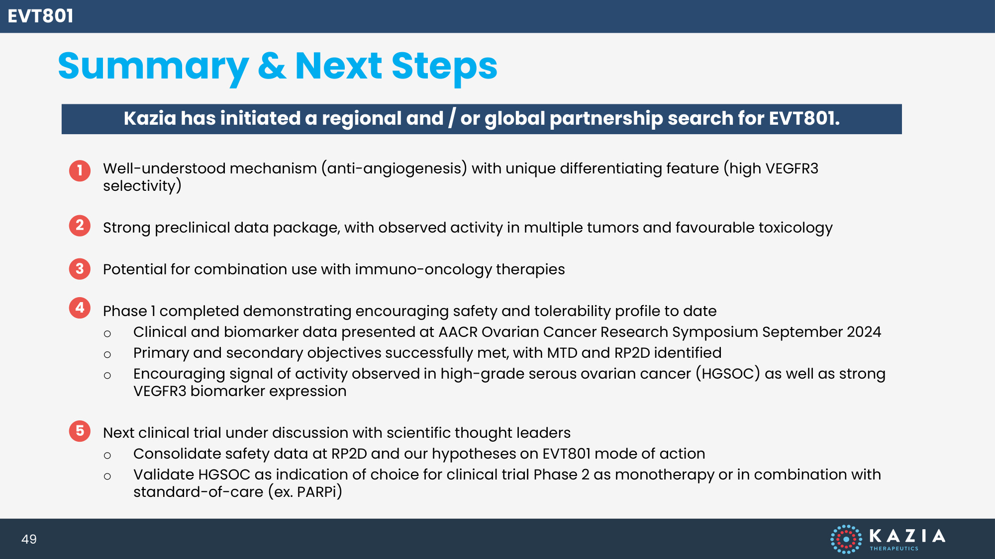 EVT801 Phase 1 Dose-Finding Trial Completed 48 Design Monotherapy dose escalation N=26 Dose cohort 3 EVT801 monotherapy Dose cohort 2 EVT801 monotherapy Dose cohort 1 EVT801 monotherapy • 6 cohorts • Single-patient cohorts initially; expand to 3+3 when toxicity is encountered • Mixed population of advanced solid tumors • Doses from 50mg QD to 500mg BID Target population: Histologically-confirmed advanced or metastatic solid tumors, unresponsive to standard treatment, or for whom no standard treatment is available or appropriate Sponsor: Kazia Therapeutics Limited Product: EVT801 EudraCT Number: 2021-002483-47 Clinical Sites (France only): • IUCT-Oncopole, Toulouse PI : Dr Gomez-Roca • Centre Léon Bérard, Lyon PI : Dr Philippe Cassier Trial ID: KZA 0801-101, NCT05114668 MTD: Maximum Tolerated Dose; RP2D: Recommended Phase 2 Dose *Human active dose prediction based on predicted human clearance of 2.5 mL / min / kg: 375 mg BID* Patients with 11 different cancer types were enrolled, with heavily pretreated advanced ovarian cancer being the most prevalent indication (11 patients) MTD has been reached at 500mg BID The recommended dose for Phase 2 is 400mg BID* in continuous monotherapy administration Overall Summary Study Background