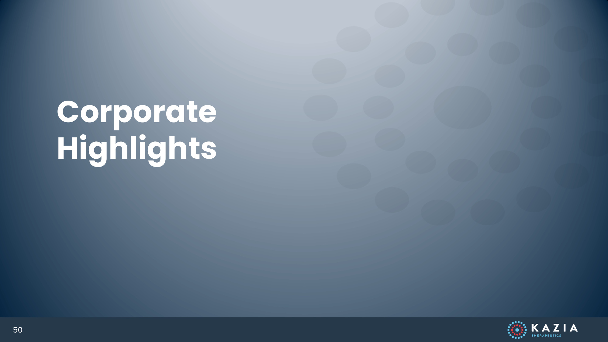 EVT801 Summary & Next Steps 49 Well-understood mechanism (anti-angiogenesis) with unique differentiating feature (high VEGFR3 selectivity) Strong preclinical data package, with observed activity in multiple tumors and favourable toxicology Potential for combination use with immuno-oncology therapies Phase 1 completed demonstrating encouraging safety and tolerability profile to date o Clinical and biomarker data presented at AACR Ovarian Cancer Research Symposium September 2024 o Primary and secondary objectives successfully met, with MTD and RP2D identified o Encouraging signal of activity observed in high-grade serous ovarian cancer (HGSOC) as well as strong VEGFR3 biomarker expression Next clinical trial under discussion with scientific thought leaders o Consolidate safety data at RP2D and our hypotheses on EVT801 mode of action o Validate HGSOC as indication of choice for clinical trial Phase 2 as monotherapy or in combination with standard-of-care (ex. PARPi) 1 2 3 4 5 Kazia has initiated a regional and / or global partnership search for EVT801.