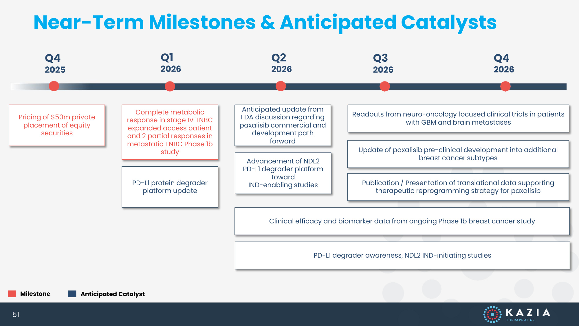 Near-Term Milestones & Anticipated Catalysts 51 Q1 2026 Complete metabolic response in stage IV TNBC expanded access patient and 2 partial responses in metastatic TNBC Phase 1b study Advancement of NDL2 PD-L1 degrader platform toward IND-enabling studies Anticipated update from FDA discussion regarding paxalisib commercial and development path forward Readouts from neuro-oncology focused clinical trials in patients with GBM and brain metastases Clinical efficacy and biomarker data from ongoing Phase 1b breast cancer study Update of paxalisib pre-clinical development into additional breast cancer subtypes Publication / Presentation of translational data supporting therapeutic reprogramming strategy for paxalisib Milestone Anticipated Catalyst PD-L1 protein degrader platform update PD-L1 degrader awareness, NDL2 IND-initiating studies Pricing of $50m private placement of equity securities Q4 2025 Q2 2026 Q3 2026 Q4 2026
