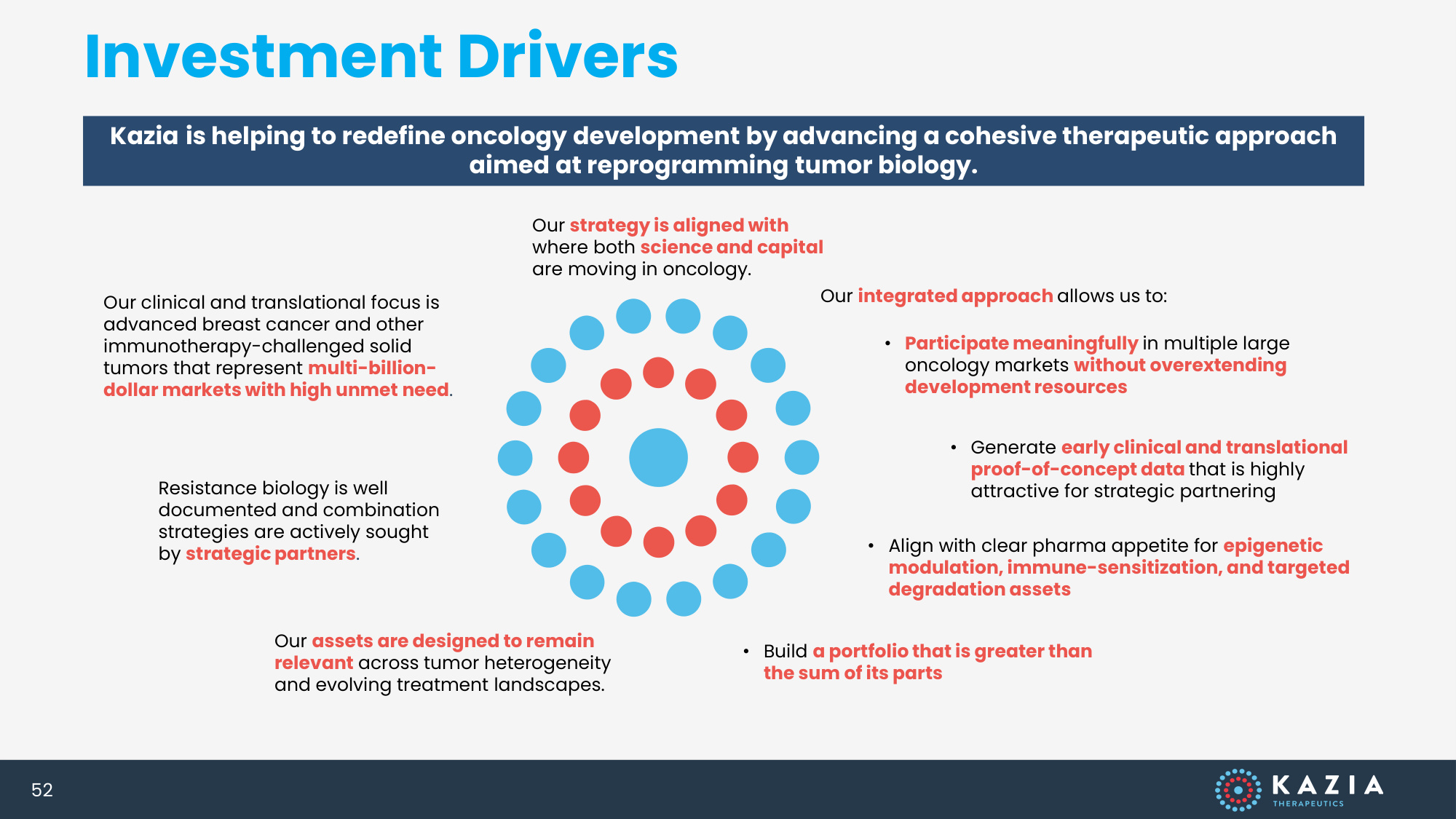 Investment Drivers 52 Kazia is helping to redefine oncology development by advancing a cohesive therapeutic approach aimed at reprogramming tumor biology. Resistance biology is well documented and combination strategies are actively sought by strategic partners. Our strategy is aligned with where both science and capital are moving in oncology. • Build a portfolio that is greater than the sum of its parts • Align with clear pharma appetite for epigenetic modulation, immune-sensitization, and targeted degradation assets • Generate early clinical and translational proof-of-concept data that is highly attractive for strategic partnering • Participate meaningfully in multiple large oncology markets without overextending development resources Our clinical and translational focus is advanced breast cancer and other immunotherapy-challenged solid tumors that represent multi-billion- dollar markets with high unmet need. Our assets are designed to remain relevant across tumor heterogeneity and evolving treatment landscapes. Our integrated approach allows us to: