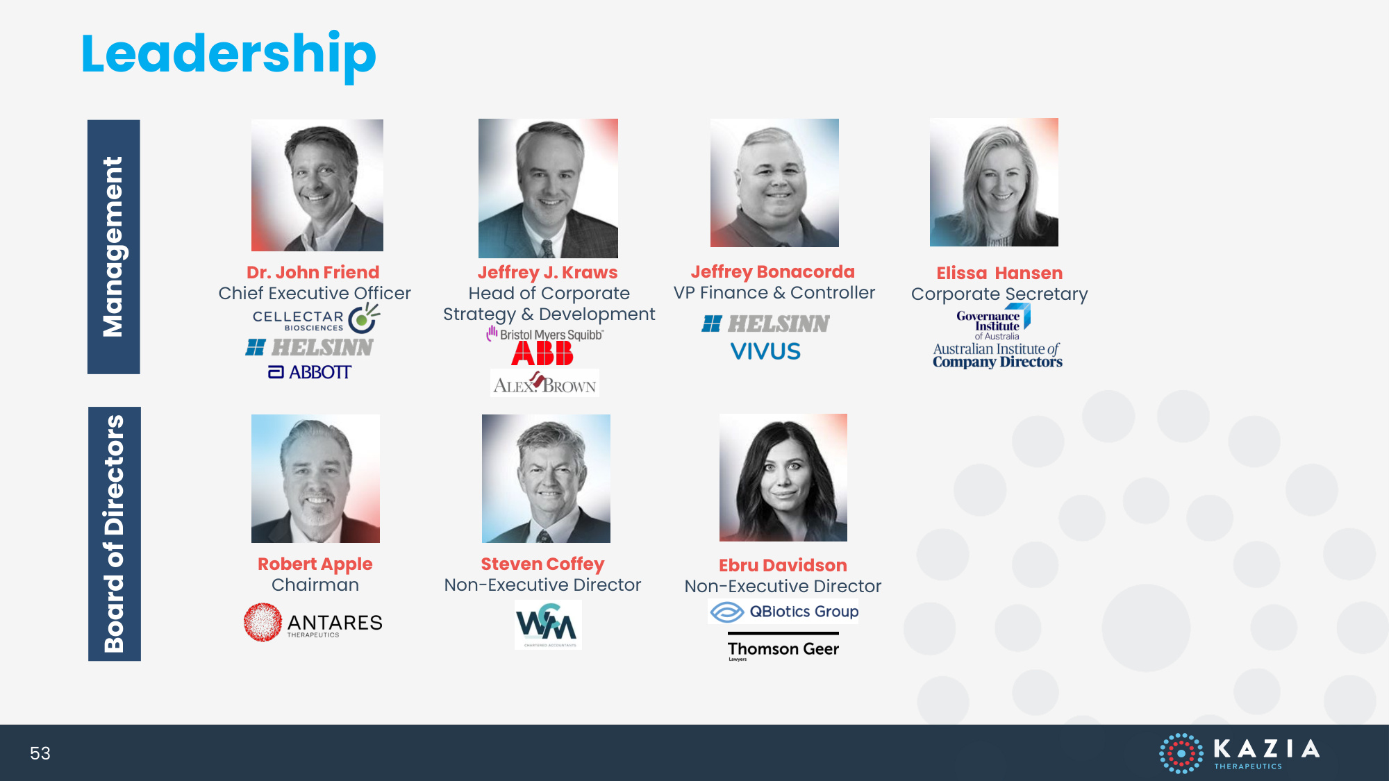 Leadership 53 Management Dr. John Friend Chief Executive Officer Jeffrey J. Kraws Head of Corporate Strategy & Development Jeffrey Bonacorda VP Finance & Controller Robert Apple Chairman Steven Coffey Non-Executive Director Ebru Davidson Non-Executive Director Board of Directors Elissa Hansen Corporate Secretary