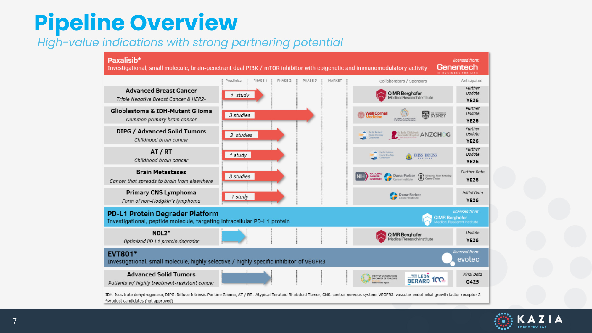 Complementary Layers of Cancer Control Paxalisib Brain-penetrant dual PI3K / mTOR inhibitor with epigenetic and immunomodulatory activity PD-L1 Protein Degrader Platform First-in-class optimized PD-L1 protein degrader Epigenetic Pathway Modulation – Inhibits PI3K-driven epigenetic regulators – Reprograms metastatic and immune-suppressive tumor states Enhances Immune Responsiveness – Reduces tumor-driven immune suppression – Improves sensitivity to immunotherapy and other targeted therapeutics Clinically Validated Asset – Evidence of clinical activity across CNS, breast cancer, and other solid tumors – Fast Track, Orphan Drug, and Rare Pediatric Disease designations from US FDA Strategic Backbone Across CNS & Breast Cancer – Demonstrated relevance in high-unmet-need CNS tumors, including glioblastoma – Expanding applicability into large breast cancer populations beyond TNBC – Shared biological drivers enable multi-indication development and commercial scale Safety and tolerability evaluated in >550 patients to date Phase 1b clinical study in TNBC ongoing NDL2 (Lead Compound) is First-in-Class PD-L1 Protein Degrader – Target intracellular PD-L1 protein rather than transiently block receptor–ligand interaction – Designed to overcome mechanisms of resistance to antibody- based checkpoint inhibitors Epigenetic & Immune Reprograming of Resistant Tumors – Targets tumor-intrinsic immune evasion not reached by existing immunotherapies – Potential to restore immune sensitivity in refractory tumors Platform & Combination Potential – Potential broad applicability across solid tumors and rationale for combination with pathway inhibitors and cytotoxics – Potential backbone for next-generation immuno-oncology regimens Clear Development & Value Inflection Path – Designed for rapid transition to first-in-human trials – Multiple preclinical and translational milestones prior to clinical proof-of-concept IND initiating studies commencing 2026 Kazia is building a differentiated oncology portfolio aligned with the current shift in oncology, designed to overcome resistance in aggressive and immunotherapy-refractory cancers. 6