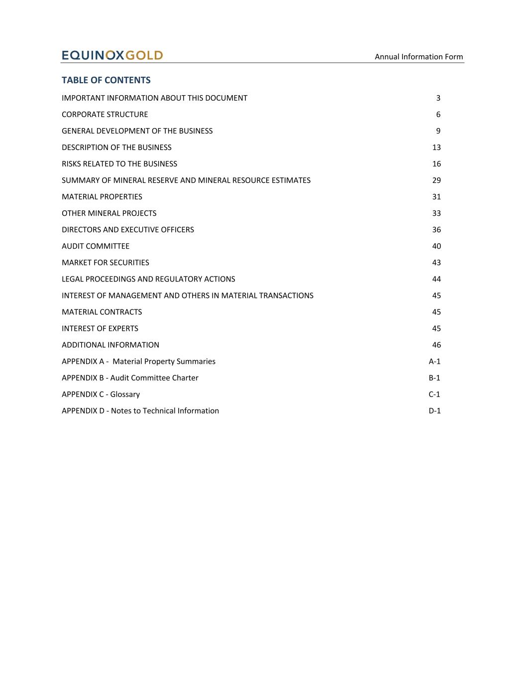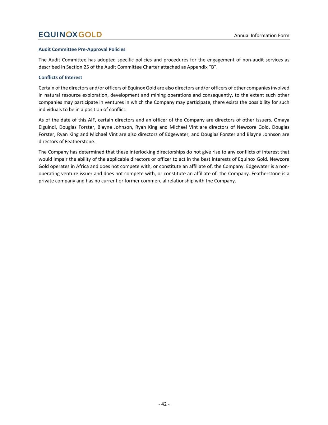 Annual Information Form - 42 - Audit Committee Pre-Approval Policies The Audit Committee has adopted specific policies and procedures for the engagement of non-audit services as described in Section 25 of the Audit Committee Charter attached as Appendix “B”. Conflicts of Interest Certain of the directors and/or officers of Equinox Gold are also directors and/or officers of other companies involved in natural resource exploration, development and mining operations and consequently, to the extent such other companies may participate in ventures in which the Company may participate, there exists the possibility for such individuals to be in a position of conflict. As of the date of this AIF, certain directors and an officer of the Company are directors of other issuers. Omaya Elguindi, Douglas Forster, Blayne Johnson, Ryan King and Michael Vint are directors of Newcore Gold. Douglas Forster, Ryan King and Michael Vint are also directors of Edgewater, and Douglas Forster and Blayne Johnson are directors of Featherstone. The Company has determined that these interlocking directorships do not give rise to any conflicts of interest that would impair the ability of the applicable directors or officer to act in the best interests of Equinox Gold. Newcore Gold operates in Africa and does not compete with, or constitute an affiliate of, the Company. Edgewater is a non- operating venture issuer and does not compete with, or constitute an affiliate of, the Company. Featherstone is a private company and has no current or former commercial relationship with the Company.