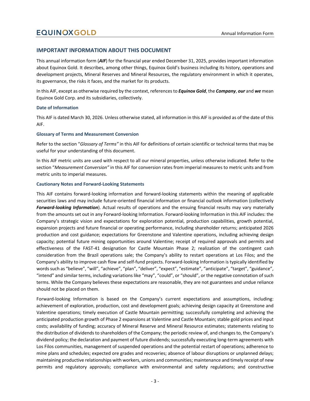 Annual Information Form - 3 - IMPORTANT INFORMATION ABOUT THIS DOCUMENT This annual information form (AIF) for the financial year ended December 31, 2025, provides important information about Equinox Gold. It describes, among other things, Equinox Gold’s business including its history, operations and development projects, Mineral Reserves and Mineral Resources, the regulatory environment in which it operates, its governance, the risks it faces, and the market for its products. In this AIF, except as otherwise required by the context, references to Equinox Gold, the Company, our and we mean Equinox Gold Corp. and its subsidiaries, collectively. Date of Information This AIF is dated March 30, 2026. Unless otherwise stated, all information in this AIF is provided as of the date of this AIF. Glossary of Terms and Measurement Conversion Refer to the section “Glossary of Terms” in this AIF for definitions of certain scientific or technical terms that may be useful for your understanding of this document. In this AIF metric units are used with respect to all our mineral properties, unless otherwise indicated. Refer to the section “Measurement Conversion” in this AIF for conversion rates from imperial measures to metric units and from metric units to imperial measures. Cautionary Notes and Forward-Looking Statements This AIF contains forward-looking information and forward-looking statements within the meaning of applicable securities laws and may include future-oriented financial information or financial outlook information (collectively Forward-looking Information). Actual results of operations and the ensuing financial results may vary materially from the amounts set out in any Forward-looking Information. Forward-looking Information in this AIF includes: the Company’s strategic vision and expectations for exploration potential, production capabilities, growth potential, expansion projects and future financial or operating performance, including shareholder returns; anticipated 2026 production and cost guidance; expectations for Greenstone and Valentine operations, including achieving design capacity; potential future mining opportunities around Valentine; receipt of required approvals and permits and effectiveness of the FAST-41 designation for Castle Mountain Phase 2; realization of the contingent cash consideration from the Brazil operations sale; the Company’s ability to restart operations at Los Filos; and the Company’s ability to improve cash flow and self-fund projects. Forward-looking Information is typically identified by words such as “believe”, “will”, “achieve”, “plan”, “deliver”, “expect”, “estimate”, “anticipate”, “target”, “guidance”, “intend” and similar terms, including variations like “may”, “could”, or “should”, or the negative connotation of such terms. While the Company believes these expectations are reasonable, they are not guarantees and undue reliance should not be placed on them. Forward-looking Information is based on the Company’s current expectations and assumptions, including: achievement of exploration, production, cost and development goals; achieving design capacity at Greenstone and Valentine operations; timely execution of Castle Mountain permitting; successfully completing and achieving the anticipated production growth of Phase 2 expansions at Valentine and Castle Mountain; stable gold prices and input costs; availability of funding; accuracy of Mineral Reserve and Mineral Resource estimates; statements relating to the distribution of dividends to shareholders of the Company; the periodic review of, and changes to, the Company’s dividend policy; the declaration and payment of future dividends; successfully executing long-term agreements with Los Filos communities, management of suspended operations and the potential restart of operations; adherence to mine plans and schedules; expected ore grades and recoveries; absence of labour disruptions or unplanned delays; maintaining productive relationships with workers, unions and communities; maintenance and timely receipt of new permits and regulatory approvals; compliance with environmental and safety regulations; and constructive