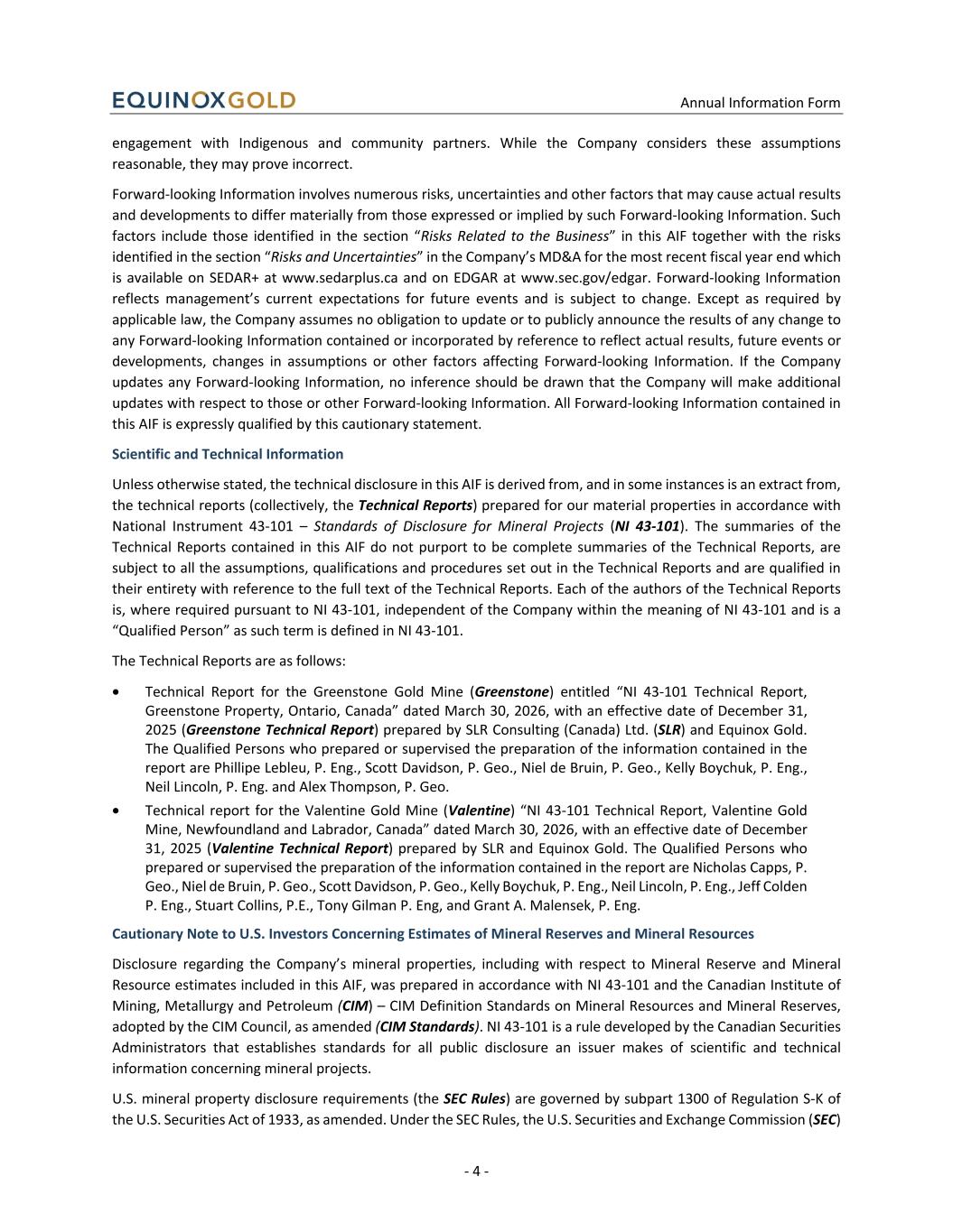 Annual Information Form - 4 - engagement with Indigenous and community partners. While the Company considers these assumptions reasonable, they may prove incorrect. Forward-looking Information involves numerous risks, uncertainties and other factors that may cause actual results and developments to differ materially from those expressed or implied by such Forward-looking Information. Such factors include those identified in the section “Risks Related to the Business” in this AIF together with the risks identified in the section “Risks and Uncertainties” in the Company’s MD&A for the most recent fiscal year end which is available on SEDAR+ at www.sedarplus.ca and on EDGAR at www.sec.gov/edgar. Forward-looking Information reflects management’s current expectations for future events and is subject to change. Except as required by applicable law, the Company assumes no obligation to update or to publicly announce the results of any change to any Forward-looking Information contained or incorporated by reference to reflect actual results, future events or developments, changes in assumptions or other factors affecting Forward-looking Information. If the Company updates any Forward-looking Information, no inference should be drawn that the Company will make additional updates with respect to those or other Forward-looking Information. All Forward-looking Information contained in this AIF is expressly qualified by this cautionary statement. Scientific and Technical Information Unless otherwise stated, the technical disclosure in this AIF is derived from, and in some instances is an extract from, the technical reports (collectively, the Technical Reports) prepared for our material properties in accordance with National Instrument 43-101 – Standards of Disclosure for Mineral Projects (NI 43-101). The summaries of the Technical Reports contained in this AIF do not purport to be complete summaries of the Technical Reports, are subject to all the assumptions, qualifications and procedures set out in the Technical Reports and are qualified in their entirety with reference to the full text of the Technical Reports. Each of the authors of the Technical Reports is, where required pursuant to NI 43-101, independent of the Company within the meaning of NI 43-101 and is a “Qualified Person” as such term is defined in NI 43-101. The Technical Reports are as follows: • Technical Report for the Greenstone Gold Mine (Greenstone) entitled “NI 43-101 Technical Report, Greenstone Property, Ontario, Canada” dated March 30, 2026, with an effective date of December 31, 2025 (Greenstone Technical Report) prepared by SLR Consulting (Canada) Ltd. (SLR) and Equinox Gold. The Qualified Persons who prepared or supervised the preparation of the information contained in the report are Phillipe Lebleu, P. Eng., Scott Davidson, P. Geo., Niel de Bruin, P. Geo., Kelly Boychuk, P. Eng., Neil Lincoln, P. Eng. and Alex Thompson, P. Geo. • Technical report for the Valentine Gold Mine (Valentine) “NI 43-101 Technical Report, Valentine Gold Mine, Newfoundland and Labrador, Canada” dated March 30, 2026, with an effective date of December 31, 2025 (Valentine Technical Report) prepared by SLR and Equinox Gold. The Qualified Persons who prepared or supervised the preparation of the information contained in the report are Nicholas Capps, P. Geo., Niel de Bruin, P. Geo., Scott Davidson, P. Geo., Kelly Boychuk, P. Eng., Neil Lincoln, P. Eng., Jeff Colden P. Eng., Stuart Collins, P.E., Tony Gilman P. Eng, and Grant A. Malensek, P. Eng. Cautionary Note to U.S. Investors Concerning Estimates of Mineral Reserves and Mineral Resources Disclosure regarding the Company’s mineral properties, including with respect to Mineral Reserve and Mineral Resource estimates included in this AIF, was prepared in accordance with NI 43-101 and the Canadian Institute of Mining, Metallurgy and Petroleum (CIM) – CIM Definition Standards on Mineral Resources and Mineral Reserves, adopted by the CIM Council, as amended (CIM Standards). NI 43-101 is a rule developed by the Canadian Securities Administrators that establishes standards for all public disclosure an issuer makes of scientific and technical information concerning mineral projects. U.S. mineral property disclosure requirements (the SEC Rules) are governed by subpart 1300 of Regulation S-K of the U.S. Securities Act of 1933, as amended. Under the SEC Rules, the U.S. Securities and Exchange Commission (SEC)