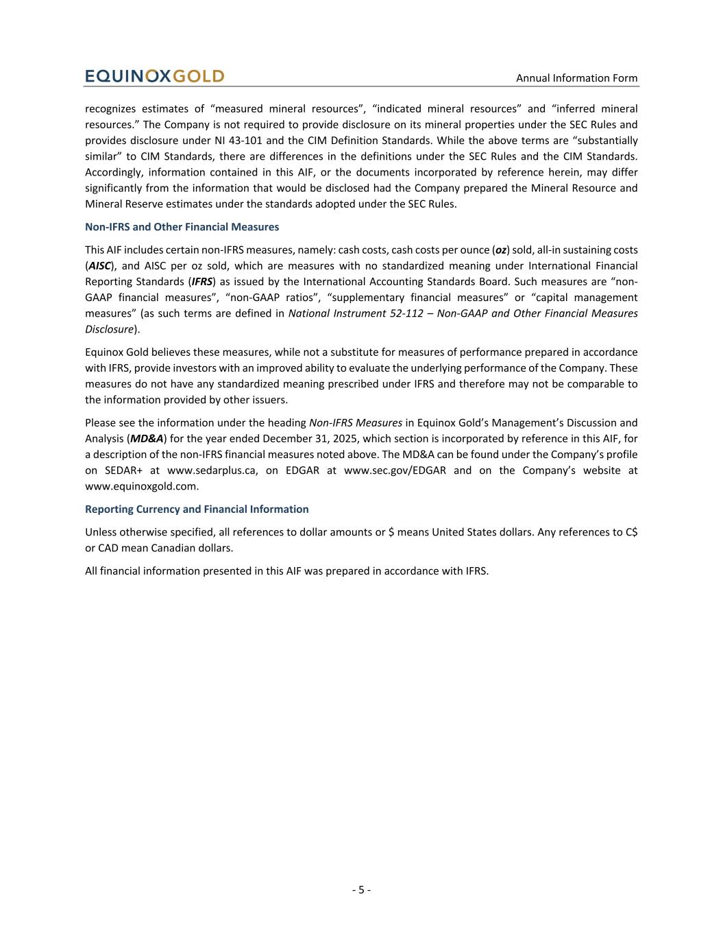 Annual Information Form - 5 - recognizes estimates of “measured mineral resources”, “indicated mineral resources” and “inferred mineral resources.” The Company is not required to provide disclosure on its mineral properties under the SEC Rules and provides disclosure under NI 43-101 and the CIM Definition Standards. While the above terms are “substantially similar” to CIM Standards, there are differences in the definitions under the SEC Rules and the CIM Standards. Accordingly, information contained in this AIF, or the documents incorporated by reference herein, may differ significantly from the information that would be disclosed had the Company prepared the Mineral Resource and Mineral Reserve estimates under the standards adopted under the SEC Rules. Non-IFRS and Other Financial Measures This AIF includes certain non-IFRS measures, namely: cash costs, cash costs per ounce (oz) sold, all-in sustaining costs (AISC), and AISC per oz sold, which are measures with no standardized meaning under International Financial Reporting Standards (IFRS) as issued by the International Accounting Standards Board. Such measures are “non- GAAP financial measures”, “non-GAAP ratios”, “supplementary financial measures” or “capital management measures” (as such terms are defined in National Instrument 52-112 – Non-GAAP and Other Financial Measures Disclosure). Equinox Gold believes these measures, while not a substitute for measures of performance prepared in accordance with IFRS, provide investors with an improved ability to evaluate the underlying performance of the Company. These measures do not have any standardized meaning prescribed under IFRS and therefore may not be comparable to the information provided by other issuers. Please see the information under the heading Non-IFRS Measures in Equinox Gold’s Management’s Discussion and Analysis (MD&A) for the year ended December 31, 2025, which section is incorporated by reference in this AIF, for a description of the non-IFRS financial measures noted above. The MD&A can be found under the Company’s profile on SEDAR+ at www.sedarplus.ca, on EDGAR at www.sec.gov/EDGAR and on the Company’s website at www.equinoxgold.com. Reporting Currency and Financial Information Unless otherwise specified, all references to dollar amounts or $ means United States dollars. Any references to C$ or CAD mean Canadian dollars. All financial information presented in this AIF was prepared in accordance with IFRS.