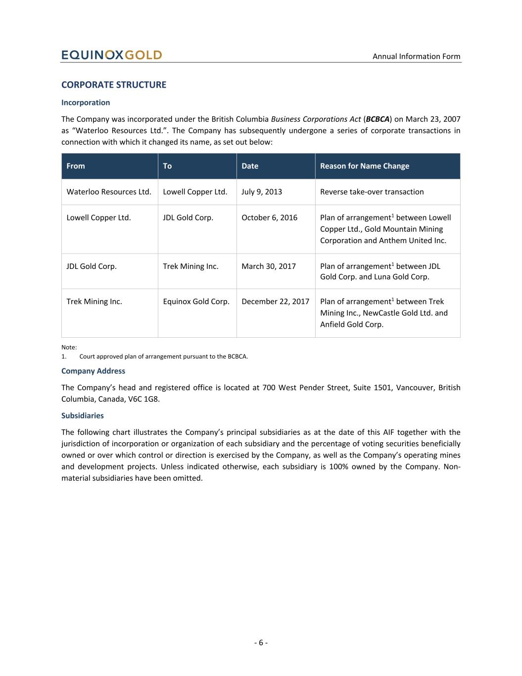 Annual Information Form - 6 - CORPORATE STRUCTURE Incorporation The Company was incorporated under the British Columbia Business Corporations Act (BCBCA) on March 23, 2007 as “Waterloo Resources Ltd.”. The Company has subsequently undergone a series of corporate transactions in connection with which it changed its name, as set out below: From To Date Reason for Name Change Waterloo Resources Ltd. Lowell Copper Ltd. July 9, 2013 Reverse take-over transaction Lowell Copper Ltd. JDL Gold Corp. October 6, 2016 Plan of arrangement1 between Lowell Copper Ltd., Gold Mountain Mining Corporation and Anthem United Inc. JDL Gold Corp. Trek Mining Inc. March 30, 2017 Plan of arrangement1 between JDL Gold Corp. and Luna Gold Corp. Trek Mining Inc. Equinox Gold Corp. December 22, 2017 Plan of arrangement1 between Trek Mining Inc., NewCastle Gold Ltd. and Anfield Gold Corp. Note: 1. Court approved plan of arrangement pursuant to the BCBCA. Company Address The Company’s head and registered office is located at 700 West Pender Street, Suite 1501, Vancouver, British Columbia, Canada, V6C 1G8. Subsidiaries The following chart illustrates the Company’s principal subsidiaries as at the date of this AIF together with the jurisdiction of incorporation or organization of each subsidiary and the percentage of voting securities beneficially owned or over which control or direction is exercised by the Company, as well as the Company’s operating mines and development projects. Unless indicated otherwise, each subsidiary is 100% owned by the Company. Non- material subsidiaries have been omitted.