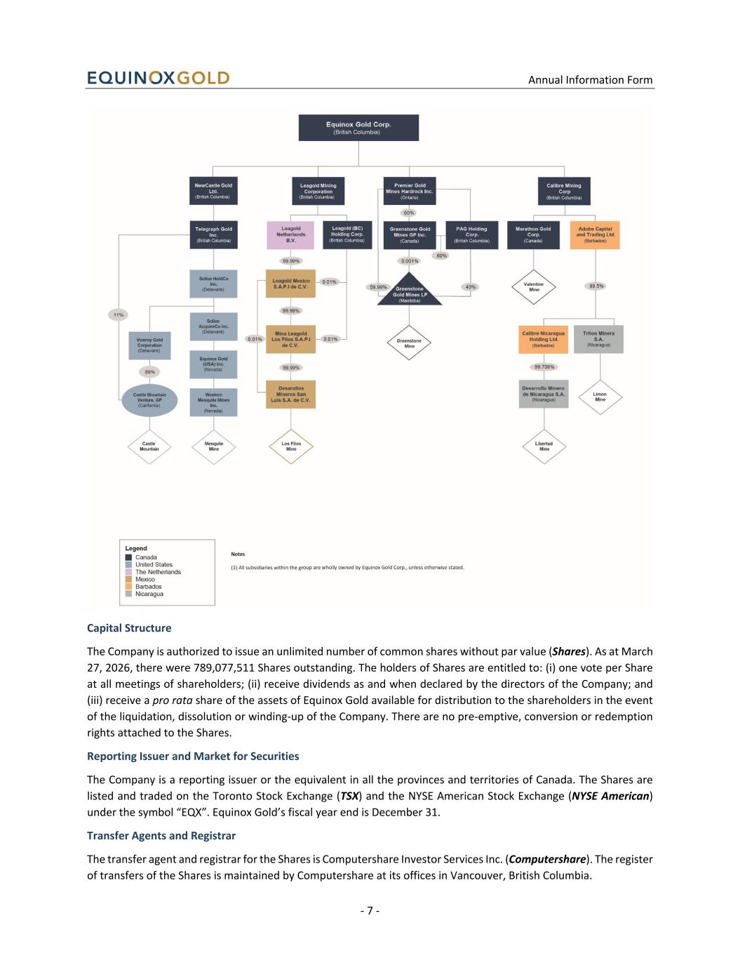Annual Information Form - 7 - Capital Structure The Company is authorized to issue an unlimited number of common shares without par value (Shares). As at March 27, 2026, there were 789,077,511 Shares outstanding. The holders of Shares are entitled to: (i) one vote per Share at all meetings of shareholders; (ii) receive dividends as and when declared by the directors of the Company; and (iii) receive a pro rata share of the assets of Equinox Gold available for distribution to the shareholders in the event of the liquidation, dissolution or winding-up of the Company. There are no pre-emptive, conversion or redemption rights attached to the Shares. Reporting Issuer and Market for Securities The Company is a reporting issuer or the equivalent in all the provinces and territories of Canada. The Shares are listed and traded on the Toronto Stock Exchange (TSX) and the NYSE American Stock Exchange (NYSE American) under the symbol “EQX”. Equinox Gold’s fiscal year end is December 31. Transfer Agents and Registrar The transfer agent and registrar for the Shares is Computershare Investor Services Inc. (Computershare). The register of transfers of the Shares is maintained by Computershare at its offices in Vancouver, British Columbia.
