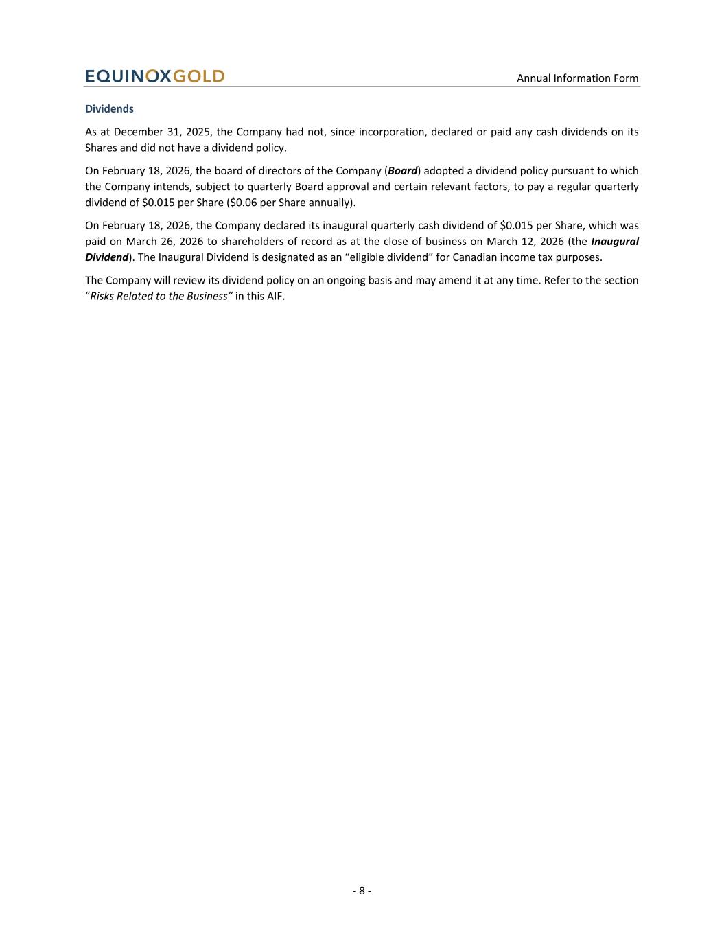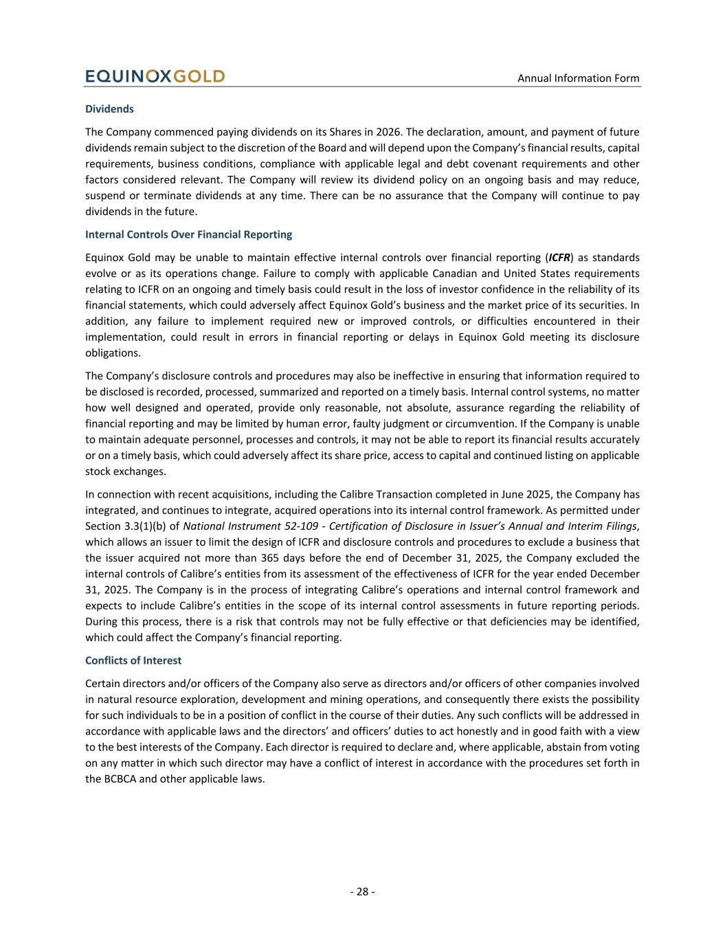 Annual Information Form - 28 - Dividends The Company commenced paying dividends on its Shares in 2026. The declaration, amount, and payment of future dividends remain subject to the discretion of the Board and will depend upon the Company’s financial results, capital requirements, business conditions, compliance with applicable legal and debt covenant requirements and other factors considered relevant. The Company will review its dividend policy on an ongoing basis and may reduce, suspend or terminate dividends at any time. There can be no assurance that the Company will continue to pay dividends in the future. Internal Controls Over Financial Reporting Equinox Gold may be unable to maintain effective internal controls over financial reporting (ICFR) as standards evolve or as its operations change. Failure to comply with applicable Canadian and United States requirements relating to ICFR on an ongoing and timely basis could result in the loss of investor confidence in the reliability of its financial statements, which could adversely affect Equinox Gold’s business and the market price of its securities. In addition, any failure to implement required new or improved controls, or difficulties encountered in their implementation, could result in errors in financial reporting or delays in Equinox Gold meeting its disclosure obligations. The Company’s disclosure controls and procedures may also be ineffective in ensuring that information required to be disclosed is recorded, processed, summarized and reported on a timely basis. Internal control systems, no matter how well designed and operated, provide only reasonable, not absolute, assurance regarding the reliability of financial reporting and may be limited by human error, faulty judgment or circumvention. If the Company is unable to maintain adequate personnel, processes and controls, it may not be able to report its financial results accurately or on a timely basis, which could adversely affect its share price, access to capital and continued listing on applicable stock exchanges. In connection with recent acquisitions, including the Calibre Transaction completed in June 2025, the Company has integrated, and continues to integrate, acquired operations into its internal control framework. As permitted under Section 3.3(1)(b) of National Instrument 52-109 - Certification of Disclosure in Issuer’s Annual and Interim Filings, which allows an issuer to limit the design of ICFR and disclosure controls and procedures to exclude a business that the issuer acquired not more than 365 days before the end of December 31, 2025, the Company excluded the internal controls of Calibre’s entities from its assessment of the effectiveness of ICFR for the year ended December 31, 2025. The Company is in the process of integrating Calibre’s operations and internal control framework and expects to include Calibre’s entities in the scope of its internal control assessments in future reporting periods. During this process, there is a risk that controls may not be fully effective or that deficiencies may be identified, which could affect the Company’s financial reporting. Conflicts of Interest Certain directors and/or officers of the Company also serve as directors and/or officers of other companies involved in natural resource exploration, development and mining operations, and consequently there exists the possibility for such individuals to be in a position of conflict in the course of their duties. Any such conflicts will be addressed in accordance with applicable laws and the directors’ and officers’ duties to act honestly and in good faith with a view to the best interests of the Company. Each director is required to declare and, where applicable, abstain from voting on any matter in which such director may have a conflict of interest in accordance with the procedures set forth in the BCBCA and other applicable laws.