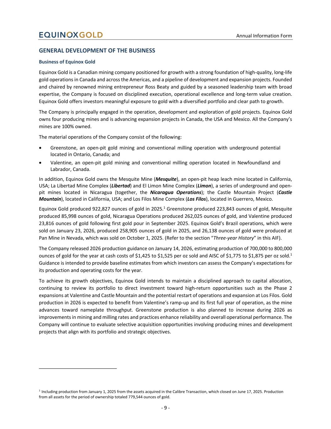 Annual Information Form - 9 - GENERAL DEVELOPMENT OF THE BUSINESS Business of Equinox Gold Equinox Gold is a Canadian mining company positioned for growth with a strong foundation of high-quality, long-life gold operations in Canada and across the Americas, and a pipeline of development and expansion projects. Founded and chaired by renowned mining entrepreneur Ross Beaty and guided by a seasoned leadership team with broad expertise, the Company is focused on disciplined execution, operational excellence and long-term value creation. Equinox Gold offers investors meaningful exposure to gold with a diversified portfolio and clear path to growth. The Company is principally engaged in the operation, development and exploration of gold projects. Equinox Gold owns four producing mines and is advancing expansion projects in Canada, the USA and Mexico. All the Company’s mines are 100% owned. The material operations of the Company consist of the following: • Greenstone, an open-pit gold mining and conventional milling operation with underground potential located in Ontario, Canada; and • Valentine, an open-pit gold mining and conventional milling operation located in Newfoundland and Labrador, Canada. In addition, Equinox Gold owns the Mesquite Mine (Mesquite), an open-pit heap leach mine located in California, USA; La Libertad Mine Complex (Libertad) and El Limon Mine Complex (Limon), a series of underground and open- pit mines located in Nicaragua (together, the Nicaragua Operations); the Castle Mountain Project (Castle Mountain), located in California, USA; and Los Filos Mine Complex (Los Filos), located in Guerrero, Mexico. Equinox Gold produced 922,827 ounces of gold in 2025.1 Greenstone produced 223,843 ounces of gold, Mesquite produced 85,998 ounces of gold, Nicaragua Operations produced 262,025 ounces of gold, and Valentine produced 23,816 ounces of gold following first gold pour in September 2025. Equinox Gold’s Brazil operations, which were sold on January 23, 2026, produced 258,905 ounces of gold in 2025, and 26,138 ounces of gold were produced at Pan Mine in Nevada, which was sold on October 1, 2025. (Refer to the section “Three-year History” in this AIF). The Company released 2026 production guidance on January 14, 2026, estimating production of 700,000 to 800,000 ounces of gold for the year at cash costs of $1,425 to $1,525 per oz sold and AISC of $1,775 to $1,875 per oz sold.1 Guidance is intended to provide baseline estimates from which investors can assess the Company’s expectations for its production and operating costs for the year. To achieve its growth objectives, Equinox Gold intends to maintain a disciplined approach to capital allocation, continuing to review its portfolio to direct investment toward high-return opportunities such as the Phase 2 expansions at Valentine and Castle Mountain and the potential restart of operations and expansion at Los Filos. Gold production in 2026 is expected to benefit from Valentine’s ramp-up and its first full year of operation, as the mine advances toward nameplate throughput. Greenstone production is also planned to increase during 2026 as improvements in mining and milling rates and practices enhance reliability and overall operational performance. The Company will continue to evaluate selective acquisition opportunities involving producing mines and development projects that align with its portfolio and strategic objectives. 1 Including production from January 1, 2025 from the assets acquired in the Calibre Transaction, which closed on June 17, 2025. Production from all assets for the period of ownership totaled 779,544 ounces of gold.