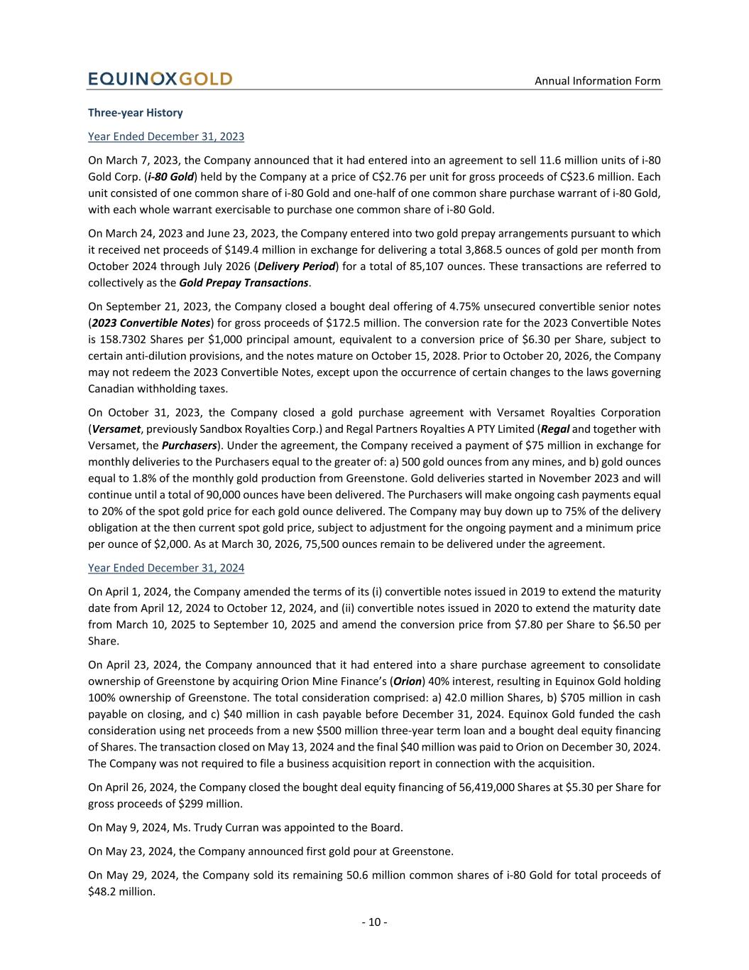 Annual Information Form - 10 - Three-year History Year Ended December 31, 2023 On March 7, 2023, the Company announced that it had entered into an agreement to sell 11.6 million units of i-80 Gold Corp. (i-80 Gold) held by the Company at a price of C$2.76 per unit for gross proceeds of C$23.6 million. Each unit consisted of one common share of i-80 Gold and one-half of one common share purchase warrant of i-80 Gold, with each whole warrant exercisable to purchase one common share of i-80 Gold. On March 24, 2023 and June 23, 2023, the Company entered into two gold prepay arrangements pursuant to which it received net proceeds of $149.4 million in exchange for delivering a total 3,868.5 ounces of gold per month from October 2024 through July 2026 (Delivery Period) for a total of 85,107 ounces. These transactions are referred to collectively as the Gold Prepay Transactions. On September 21, 2023, the Company closed a bought deal offering of 4.75% unsecured convertible senior notes (2023 Convertible Notes) for gross proceeds of $172.5 million. The conversion rate for the 2023 Convertible Notes is 158.7302 Shares per $1,000 principal amount, equivalent to a conversion price of $6.30 per Share, subject to certain anti-dilution provisions, and the notes mature on October 15, 2028. Prior to October 20, 2026, the Company may not redeem the 2023 Convertible Notes, except upon the occurrence of certain changes to the laws governing Canadian withholding taxes. On October 31, 2023, the Company closed a gold purchase agreement with Versamet Royalties Corporation (Versamet, previously Sandbox Royalties Corp.) and Regal Partners Royalties A PTY Limited (Regal and together with Versamet, the Purchasers). Under the agreement, the Company received a payment of $75 million in exchange for monthly deliveries to the Purchasers equal to the greater of: a) 500 gold ounces from any mines, and b) gold ounces equal to 1.8% of the monthly gold production from Greenstone. Gold deliveries started in November 2023 and will continue until a total of 90,000 ounces have been delivered. The Purchasers will make ongoing cash payments equal to 20% of the spot gold price for each gold ounce delivered. The Company may buy down up to 75% of the delivery obligation at the then current spot gold price, subject to adjustment for the ongoing payment and a minimum price per ounce of $2,000. As at March 30, 2026, 75,500 ounces remain to be delivered under the agreement. Year Ended December 31, 2024 On April 1, 2024, the Company amended the terms of its (i) convertible notes issued in 2019 to extend the maturity date from April 12, 2024 to October 12, 2024, and (ii) convertible notes issued in 2020 to extend the maturity date from March 10, 2025 to September 10, 2025 and amend the conversion price from $7.80 per Share to $6.50 per Share. On April 23, 2024, the Company announced that it had entered into a share purchase agreement to consolidate ownership of Greenstone by acquiring Orion Mine Finance’s (Orion) 40% interest, resulting in Equinox Gold holding 100% ownership of Greenstone. The total consideration comprised: a) 42.0 million Shares, b) $705 million in cash payable on closing, and c) $40 million in cash payable before December 31, 2024. Equinox Gold funded the cash consideration using net proceeds from a new $500 million three-year term loan and a bought deal equity financing of Shares. The transaction closed on May 13, 2024 and the final $40 million was paid to Orion on December 30, 2024. The Company was not required to file a business acquisition report in connection with the acquisition. On April 26, 2024, the Company closed the bought deal equity financing of 56,419,000 Shares at $5.30 per Share for gross proceeds of $299 million. On May 9, 2024, Ms. Trudy Curran was appointed to the Board. On May 23, 2024, the Company announced first gold pour at Greenstone. On May 29, 2024, the Company sold its remaining 50.6 million common shares of i-80 Gold for total proceeds of $48.2 million.