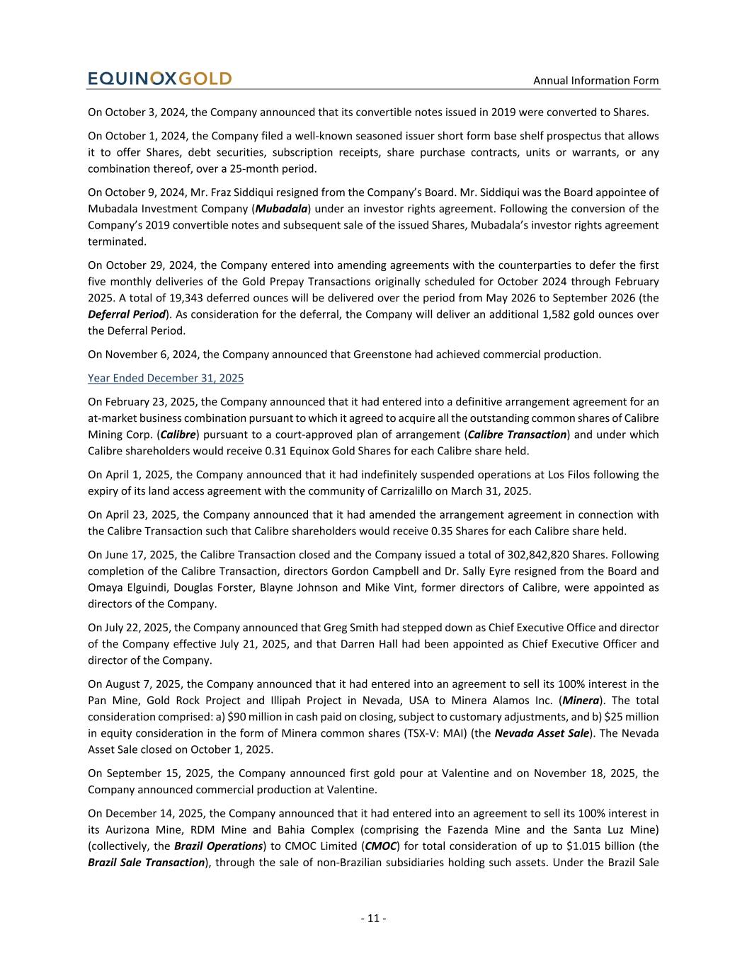 Annual Information Form - 11 - On October 3, 2024, the Company announced that its convertible notes issued in 2019 were converted to Shares. On October 1, 2024, the Company filed a well-known seasoned issuer short form base shelf prospectus that allows it to offer Shares, debt securities, subscription receipts, share purchase contracts, units or warrants, or any combination thereof, over a 25-month period. On October 9, 2024, Mr. Fraz Siddiqui resigned from the Company’s Board. Mr. Siddiqui was the Board appointee of Mubadala Investment Company (Mubadala) under an investor rights agreement. Following the conversion of the Company’s 2019 convertible notes and subsequent sale of the issued Shares, Mubadala’s investor rights agreement terminated. On October 29, 2024, the Company entered into amending agreements with the counterparties to defer the first five monthly deliveries of the Gold Prepay Transactions originally scheduled for October 2024 through February 2025. A total of 19,343 deferred ounces will be delivered over the period from May 2026 to September 2026 (the Deferral Period). As consideration for the deferral, the Company will deliver an additional 1,582 gold ounces over the Deferral Period. On November 6, 2024, the Company announced that Greenstone had achieved commercial production. Year Ended December 31, 2025 On February 23, 2025, the Company announced that it had entered into a definitive arrangement agreement for an at-market business combination pursuant to which it agreed to acquire all the outstanding common shares of Calibre Mining Corp. (Calibre) pursuant to a court-approved plan of arrangement (Calibre Transaction) and under which Calibre shareholders would receive 0.31 Equinox Gold Shares for each Calibre share held. On April 1, 2025, the Company announced that it had indefinitely suspended operations at Los Filos following the expiry of its land access agreement with the community of Carrizalillo on March 31, 2025. On April 23, 2025, the Company announced that it had amended the arrangement agreement in connection with the Calibre Transaction such that Calibre shareholders would receive 0.35 Shares for each Calibre share held. On June 17, 2025, the Calibre Transaction closed and the Company issued a total of 302,842,820 Shares. Following completion of the Calibre Transaction, directors Gordon Campbell and Dr. Sally Eyre resigned from the Board and Omaya Elguindi, Douglas Forster, Blayne Johnson and Mike Vint, former directors of Calibre, were appointed as directors of the Company. On July 22, 2025, the Company announced that Greg Smith had stepped down as Chief Executive Office and director of the Company effective July 21, 2025, and that Darren Hall had been appointed as Chief Executive Officer and director of the Company. On August 7, 2025, the Company announced that it had entered into an agreement to sell its 100% interest in the Pan Mine, Gold Rock Project and Illipah Project in Nevada, USA to Minera Alamos Inc. (Minera). The total consideration comprised: a) $90 million in cash paid on closing, subject to customary adjustments, and b) $25 million in equity consideration in the form of Minera common shares (TSX-V: MAI) (the Nevada Asset Sale). The Nevada Asset Sale closed on October 1, 2025. On September 15, 2025, the Company announced first gold pour at Valentine and on November 18, 2025, the Company announced commercial production at Valentine. On December 14, 2025, the Company announced that it had entered into an agreement to sell its 100% interest in its Aurizona Mine, RDM Mine and Bahia Complex (comprising the Fazenda Mine and the Santa Luz Mine) (collectively, the Brazil Operations) to CMOC Limited (CMOC) for total consideration of up to $1.015 billion (the Brazil Sale Transaction), through the sale of non-Brazilian subsidiaries holding such assets. Under the Brazil Sale