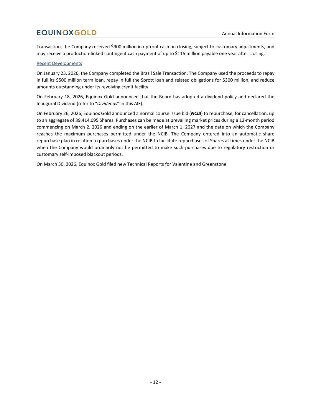 Annual Information Form - 12 - Transaction, the Company received $900 million in upfront cash on closing, subject to customary adjustments, and may receive a production-linked contingent cash payment of up to $115 million payable one year after closing. Recent Developments On January 23, 2026, the Company completed the Brazil Sale Transaction. The Company used the proceeds to repay in full its $500 million term loan, repay in full the Sprott loan and related obligations for $300 million, and reduce amounts outstanding under its revolving credit facility. On February 18, 2026, Equinox Gold announced that the Board has adopted a dividend policy and declared the Inaugural Dividend (refer to “Dividends” in this AIF). On February 26, 2026, Equinox Gold announced a normal course issue bid (NCIB) to repurchase, for cancellation, up to an aggregate of 39,414,095 Shares. Purchases can be made at prevailing market prices during a 12-month period commencing on March 2, 2026 and ending on the earlier of March 1, 2027 and the date on which the Company reaches the maximum purchases permitted under the NCIB. The Company entered into an automatic share repurchase plan in relation to purchases under the NCIB to facilitate repurchases of Shares at times under the NCIB when the Company would ordinarily not be permitted to make such purchases due to regulatory restriction or customary self-imposed blackout periods. On March 30, 2026, Equinox Gold filed new Technical Reports for Valentine and Greenstone.