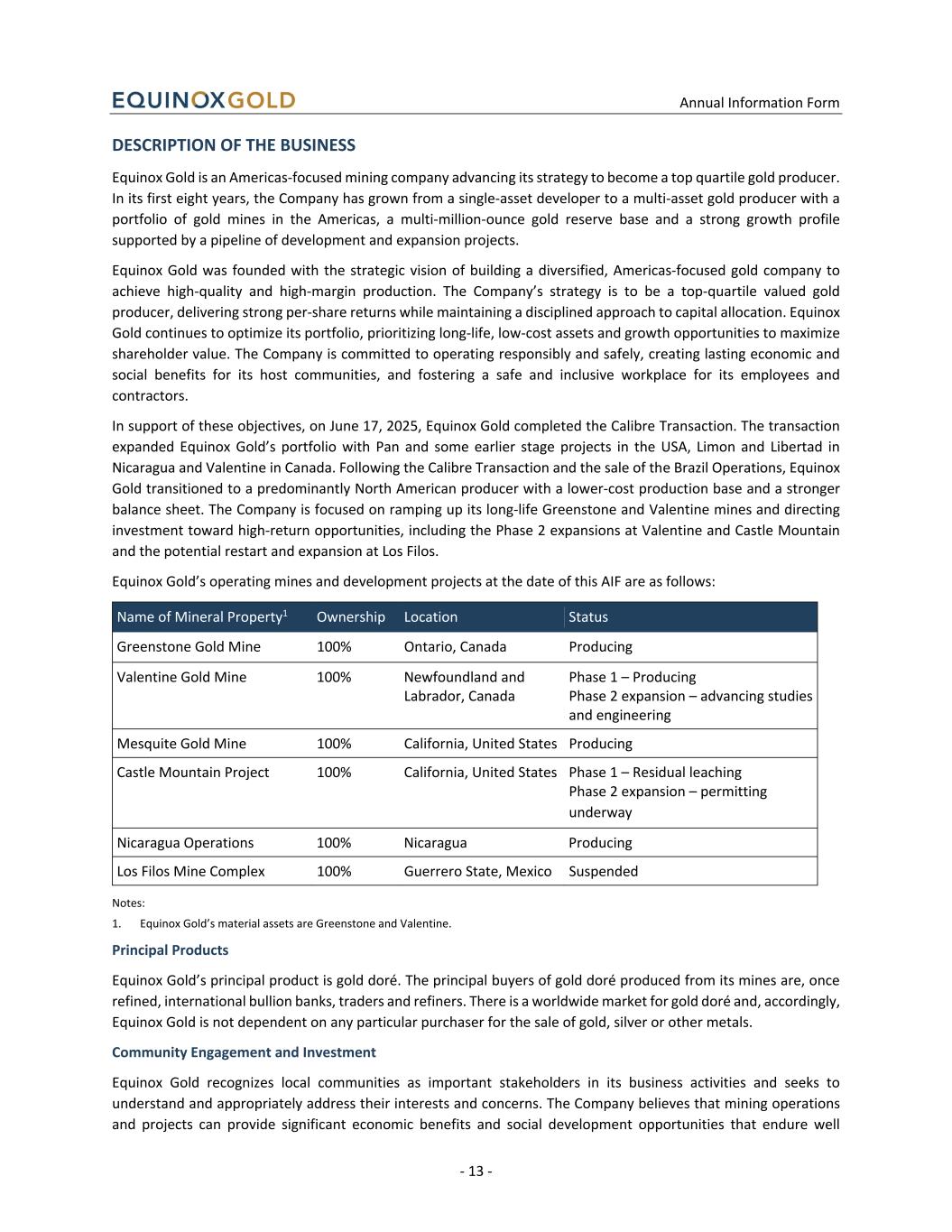 Annual Information Form - 13 - DESCRIPTION OF THE BUSINESS Equinox Gold is an Americas-focused mining company advancing its strategy to become a top quartile gold producer. In its first eight years, the Company has grown from a single-asset developer to a multi-asset gold producer with a portfolio of gold mines in the Americas, a multi-million-ounce gold reserve base and a strong growth profile supported by a pipeline of development and expansion projects. Equinox Gold was founded with the strategic vision of building a diversified, Americas-focused gold company to achieve high-quality and high-margin production. The Company’s strategy is to be a top-quartile valued gold producer, delivering strong per-share returns while maintaining a disciplined approach to capital allocation. Equinox Gold continues to optimize its portfolio, prioritizing long-life, low-cost assets and growth opportunities to maximize shareholder value. The Company is committed to operating responsibly and safely, creating lasting economic and social benefits for its host communities, and fostering a safe and inclusive workplace for its employees and contractors. In support of these objectives, on June 17, 2025, Equinox Gold completed the Calibre Transaction. The transaction expanded Equinox Gold’s portfolio with Pan and some earlier stage projects in the USA, Limon and Libertad in Nicaragua and Valentine in Canada. Following the Calibre Transaction and the sale of the Brazil Operations, Equinox Gold transitioned to a predominantly North American producer with a lower-cost production base and a stronger balance sheet. The Company is focused on ramping up its long-life Greenstone and Valentine mines and directing investment toward high-return opportunities, including the Phase 2 expansions at Valentine and Castle Mountain and the potential restart and expansion at Los Filos. Equinox Gold’s operating mines and development projects at the date of this AIF are as follows: Name of Mineral Property1 Ownership Location Status Greenstone Gold Mine 100% Ontario, Canada Producing Valentine Gold Mine 100% Newfoundland and Labrador, Canada Phase 1 – Producing Phase 2 expansion – advancing studies and engineering Mesquite Gold Mine 100% California, United States Producing Castle Mountain Project 100% California, United States Phase 1 – Residual leaching Phase 2 expansion – permitting underway Nicaragua Operations 100% Nicaragua Producing Los Filos Mine Complex 100% Guerrero State, Mexico Suspended Notes: 1. Equinox Gold’s material assets are Greenstone and Valentine. Principal Products Equinox Gold’s principal product is gold doré. The principal buyers of gold doré produced from its mines are, once refined, international bullion banks, traders and refiners. There is a worldwide market for gold doré and, accordingly, Equinox Gold is not dependent on any particular purchaser for the sale of gold, silver or other metals. Community Engagement and Investment Equinox Gold recognizes local communities as important stakeholders in its business activities and seeks to understand and appropriately address their interests and concerns. The Company believes that mining operations and projects can provide significant economic benefits and social development opportunities that endure well