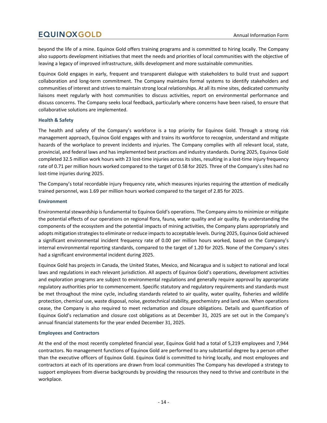 Annual Information Form - 14 - beyond the life of a mine. Equinox Gold offers training programs and is committed to hiring locally. The Company also supports development initiatives that meet the needs and priorities of local communities with the objective of leaving a legacy of improved infrastructure, skills development and more sustainable communities. Equinox Gold engages in early, frequent and transparent dialogue with stakeholders to build trust and support collaboration and long-term commitment. The Company maintains formal systems to identify stakeholders and communities of interest and strives to maintain strong local relationships. At all its mine sites, dedicated community liaisons meet regularly with host communities to discuss activities, report on environmental performance and discuss concerns. The Company seeks local feedback, particularly where concerns have been raised, to ensure that collaborative solutions are implemented. Health & Safety The health and safety of the Company’s workforce is a top priority for Equinox Gold. Through a strong risk management approach, Equinox Gold engages with and trains its workforce to recognize, understand and mitigate hazards of the workplace to prevent incidents and injuries. The Company complies with all relevant local, state, provincial, and federal laws and has implemented best practices and industry standards. During 2025, Equinox Gold completed 32.5 million work hours with 23 lost-time injuries across its sites, resulting in a lost-time injury frequency rate of 0.71 per million hours worked compared to the target of 0.58 for 2025. Three of the Company’s sites had no lost-time injuries during 2025. The Company’s total recordable injury frequency rate, which measures injuries requiring the attention of medically trained personnel, was 1.69 per million hours worked compared to the target of 2.85 for 2025. Environment Environmental stewardship is fundamental to Equinox Gold’s operations. The Company aims to minimize or mitigate the potential effects of our operations on regional flora, fauna, water quality and air quality. By understanding the components of the ecosystem and the potential impacts of mining activities, the Company plans appropriately and adopts mitigation strategies to eliminate or reduce impacts to acceptable levels. During 2025, Equinox Gold achieved a significant environmental incident frequency rate of 0.00 per million hours worked, based on the Company’s internal environmental reporting standards, compared to the target of 1.20 for 2025. None of the Company’s sites had a significant environmental incident during 2025. Equinox Gold has projects in Canada, the United States, Mexico, and Nicaragua and is subject to national and local laws and regulations in each relevant jurisdiction. All aspects of Equinox Gold’s operations, development activities and exploration programs are subject to environmental regulations and generally require approval by appropriate regulatory authorities prior to commencement. Specific statutory and regulatory requirements and standards must be met throughout the mine cycle, including standards related to air quality, water quality, fisheries and wildlife protection, chemical use, waste disposal, noise, geotechnical stability, geochemistry and land use. When operations cease, the Company is also required to meet reclamation and closure obligations. Details and quantification of Equinox Gold’s reclamation and closure cost obligations as at December 31, 2025 are set out in the Company’s annual financial statements for the year ended December 31, 2025. Employees and Contractors At the end of the most recently completed financial year, Equinox Gold had a total of 5,219 employees and 7,944 contractors. No management functions of Equinox Gold are performed to any substantial degree by a person other than the executive officers of Equinox Gold. Equinox Gold is committed to hiring locally, and most employees and contractors at each of its operations are drawn from local communities The Company has developed a strategy to support employees from diverse backgrounds by providing the resources they need to thrive and contribute in the workplace.