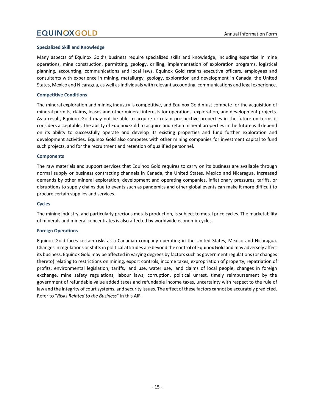 Annual Information Form - 15 - Specialized Skill and Knowledge Many aspects of Equinox Gold’s business require specialized skills and knowledge, including expertise in mine operations, mine construction, permitting, geology, drilling, implementation of exploration programs, logistical planning, accounting, communications and local laws. Equinox Gold retains executive officers, employees and consultants with experience in mining, metallurgy, geology, exploration and development in Canada, the United States, Mexico and Nicaragua, as well as individuals with relevant accounting, communications and legal experience. Competitive Conditions The mineral exploration and mining industry is competitive, and Equinox Gold must compete for the acquisition of mineral permits, claims, leases and other mineral interests for operations, exploration, and development projects. As a result, Equinox Gold may not be able to acquire or retain prospective properties in the future on terms it considers acceptable. The ability of Equinox Gold to acquire and retain mineral properties in the future will depend on its ability to successfully operate and develop its existing properties and fund further exploration and development activities. Equinox Gold also competes with other mining companies for investment capital to fund such projects, and for the recruitment and retention of qualified personnel. Components The raw materials and support services that Equinox Gold requires to carry on its business are available through normal supply or business contracting channels in Canada, the United States, Mexico and Nicaragua. Increased demands by other mineral exploration, development and operating companies, inflationary pressures, tariffs, or disruptions to supply chains due to events such as pandemics and other global events can make it more difficult to procure certain supplies and services. Cycles The mining industry, and particularly precious metals production, is subject to metal price cycles. The marketability of minerals and mineral concentrates is also affected by worldwide economic cycles. Foreign Operations Equinox Gold faces certain risks as a Canadian company operating in the United States, Mexico and Nicaragua. Changes in regulations or shifts in political attitudes are beyond the control of Equinox Gold and may adversely affect its business. Equinox Gold may be affected in varying degrees by factors such as government regulations (or changes thereto) relating to restrictions on mining, export controls, income taxes, expropriation of property, repatriation of profits, environmental legislation, tariffs, land use, water use, land claims of local people, changes in foreign exchange, mine safety regulations, labour laws, corruption, political unrest, timely reimbursement by the government of refundable value added taxes and refundable income taxes, uncertainty with respect to the rule of law and the integrity of court systems, and security issues. The effect of these factors cannot be accurately predicted. Refer to “Risks Related to the Business” in this AIF.
