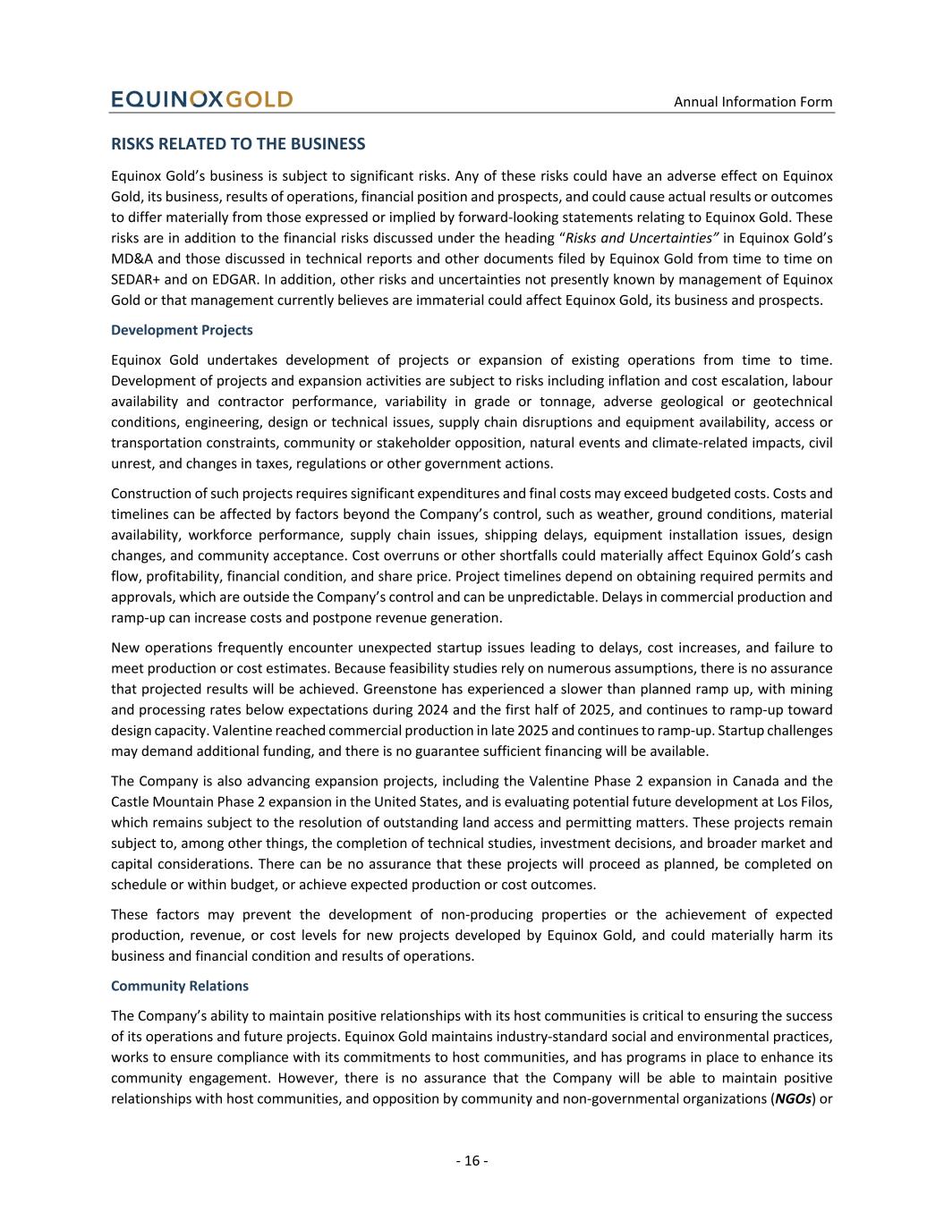 Annual Information Form - 16 - RISKS RELATED TO THE BUSINESS Equinox Gold’s business is subject to significant risks. Any of these risks could have an adverse effect on Equinox Gold, its business, results of operations, financial position and prospects, and could cause actual results or outcomes to differ materially from those expressed or implied by forward-looking statements relating to Equinox Gold. These risks are in addition to the financial risks discussed under the heading “Risks and Uncertainties” in Equinox Gold’s MD&A and those discussed in technical reports and other documents filed by Equinox Gold from time to time on SEDAR+ and on EDGAR. In addition, other risks and uncertainties not presently known by management of Equinox Gold or that management currently believes are immaterial could affect Equinox Gold, its business and prospects. Development Projects Equinox Gold undertakes development of projects or expansion of existing operations from time to time. Development of projects and expansion activities are subject to risks including inflation and cost escalation, labour availability and contractor performance, variability in grade or tonnage, adverse geological or geotechnical conditions, engineering, design or technical issues, supply chain disruptions and equipment availability, access or transportation constraints, community or stakeholder opposition, natural events and climate-related impacts, civil unrest, and changes in taxes, regulations or other government actions. Construction of such projects requires significant expenditures and final costs may exceed budgeted costs. Costs and timelines can be affected by factors beyond the Company’s control, such as weather, ground conditions, material availability, workforce performance, supply chain issues, shipping delays, equipment installation issues, design changes, and community acceptance. Cost overruns or other shortfalls could materially affect Equinox Gold’s cash flow, profitability, financial condition, and share price. Project timelines depend on obtaining required permits and approvals, which are outside the Company’s control and can be unpredictable. Delays in commercial production and ramp-up can increase costs and postpone revenue generation. New operations frequently encounter unexpected startup issues leading to delays, cost increases, and failure to meet production or cost estimates. Because feasibility studies rely on numerous assumptions, there is no assurance that projected results will be achieved. Greenstone has experienced a slower than planned ramp up, with mining and processing rates below expectations during 2024 and the first half of 2025, and continues to ramp-up toward design capacity. Valentine reached commercial production in late 2025 and continues to ramp-up. Startup challenges may demand additional funding, and there is no guarantee sufficient financing will be available. The Company is also advancing expansion projects, including the Valentine Phase 2 expansion in Canada and the Castle Mountain Phase 2 expansion in the United States, and is evaluating potential future development at Los Filos, which remains subject to the resolution of outstanding land access and permitting matters. These projects remain subject to, among other things, the completion of technical studies, investment decisions, and broader market and capital considerations. There can be no assurance that these projects will proceed as planned, be completed on schedule or within budget, or achieve expected production or cost outcomes. These factors may prevent the development of non-producing properties or the achievement of expected production, revenue, or cost levels for new projects developed by Equinox Gold, and could materially harm its business and financial condition and results of operations. Community Relations The Company’s ability to maintain positive relationships with its host communities is critical to ensuring the success of its operations and future projects. Equinox Gold maintains industry-standard social and environmental practices, works to ensure compliance with its commitments to host communities, and has programs in place to enhance its community engagement. However, there is no assurance that the Company will be able to maintain positive relationships with host communities, and opposition by community and non-governmental organizations (NGOs) or