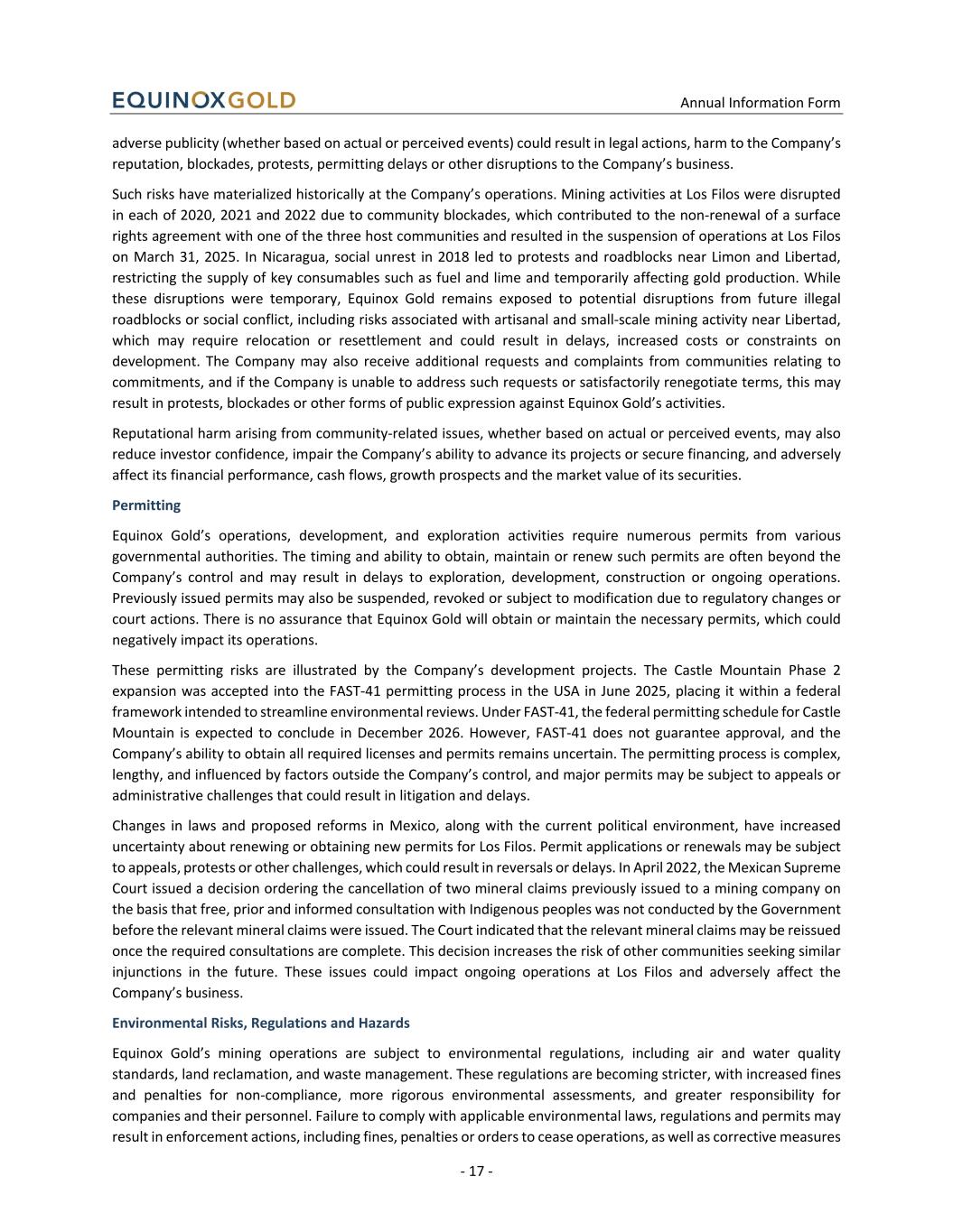 Annual Information Form - 17 - adverse publicity (whether based on actual or perceived events) could result in legal actions, harm to the Company’s reputation, blockades, protests, permitting delays or other disruptions to the Company’s business. Such risks have materialized historically at the Company’s operations. Mining activities at Los Filos were disrupted in each of 2020, 2021 and 2022 due to community blockades, which contributed to the non-renewal of a surface rights agreement with one of the three host communities and resulted in the suspension of operations at Los Filos on March 31, 2025. In Nicaragua, social unrest in 2018 led to protests and roadblocks near Limon and Libertad, restricting the supply of key consumables such as fuel and lime and temporarily affecting gold production. While these disruptions were temporary, Equinox Gold remains exposed to potential disruptions from future illegal roadblocks or social conflict, including risks associated with artisanal and small-scale mining activity near Libertad, which may require relocation or resettlement and could result in delays, increased costs or constraints on development. The Company may also receive additional requests and complaints from communities relating to commitments, and if the Company is unable to address such requests or satisfactorily renegotiate terms, this may result in protests, blockades or other forms of public expression against Equinox Gold’s activities. Reputational harm arising from community-related issues, whether based on actual or perceived events, may also reduce investor confidence, impair the Company’s ability to advance its projects or secure financing, and adversely affect its financial performance, cash flows, growth prospects and the market value of its securities. Permitting Equinox Gold’s operations, development, and exploration activities require numerous permits from various governmental authorities. The timing and ability to obtain, maintain or renew such permits are often beyond the Company’s control and may result in delays to exploration, development, construction or ongoing operations. Previously issued permits may also be suspended, revoked or subject to modification due to regulatory changes or court actions. There is no assurance that Equinox Gold will obtain or maintain the necessary permits, which could negatively impact its operations. These permitting risks are illustrated by the Company’s development projects. The Castle Mountain Phase 2 expansion was accepted into the FAST-41 permitting process in the USA in June 2025, placing it within a federal framework intended to streamline environmental reviews. Under FAST-41, the federal permitting schedule for Castle Mountain is expected to conclude in December 2026. However, FAST-41 does not guarantee approval, and the Company’s ability to obtain all required licenses and permits remains uncertain. The permitting process is complex, lengthy, and influenced by factors outside the Company’s control, and major permits may be subject to appeals or administrative challenges that could result in litigation and delays. Changes in laws and proposed reforms in Mexico, along with the current political environment, have increased uncertainty about renewing or obtaining new permits for Los Filos. Permit applications or renewals may be subject to appeals, protests or other challenges, which could result in reversals or delays. In April 2022, the Mexican Supreme Court issued a decision ordering the cancellation of two mineral claims previously issued to a mining company on the basis that free, prior and informed consultation with Indigenous peoples was not conducted by the Government before the relevant mineral claims were issued. The Court indicated that the relevant mineral claims may be reissued once the required consultations are complete. This decision increases the risk of other communities seeking similar injunctions in the future. These issues could impact ongoing operations at Los Filos and adversely affect the Company’s business. Environmental Risks, Regulations and Hazards Equinox Gold’s mining operations are subject to environmental regulations, including air and water quality standards, land reclamation, and waste management. These regulations are becoming stricter, with increased fines and penalties for non-compliance, more rigorous environmental assessments, and greater responsibility for companies and their personnel. Failure to comply with applicable environmental laws, regulations and permits may result in enforcement actions, including fines, penalties or orders to cease operations, as well as corrective measures