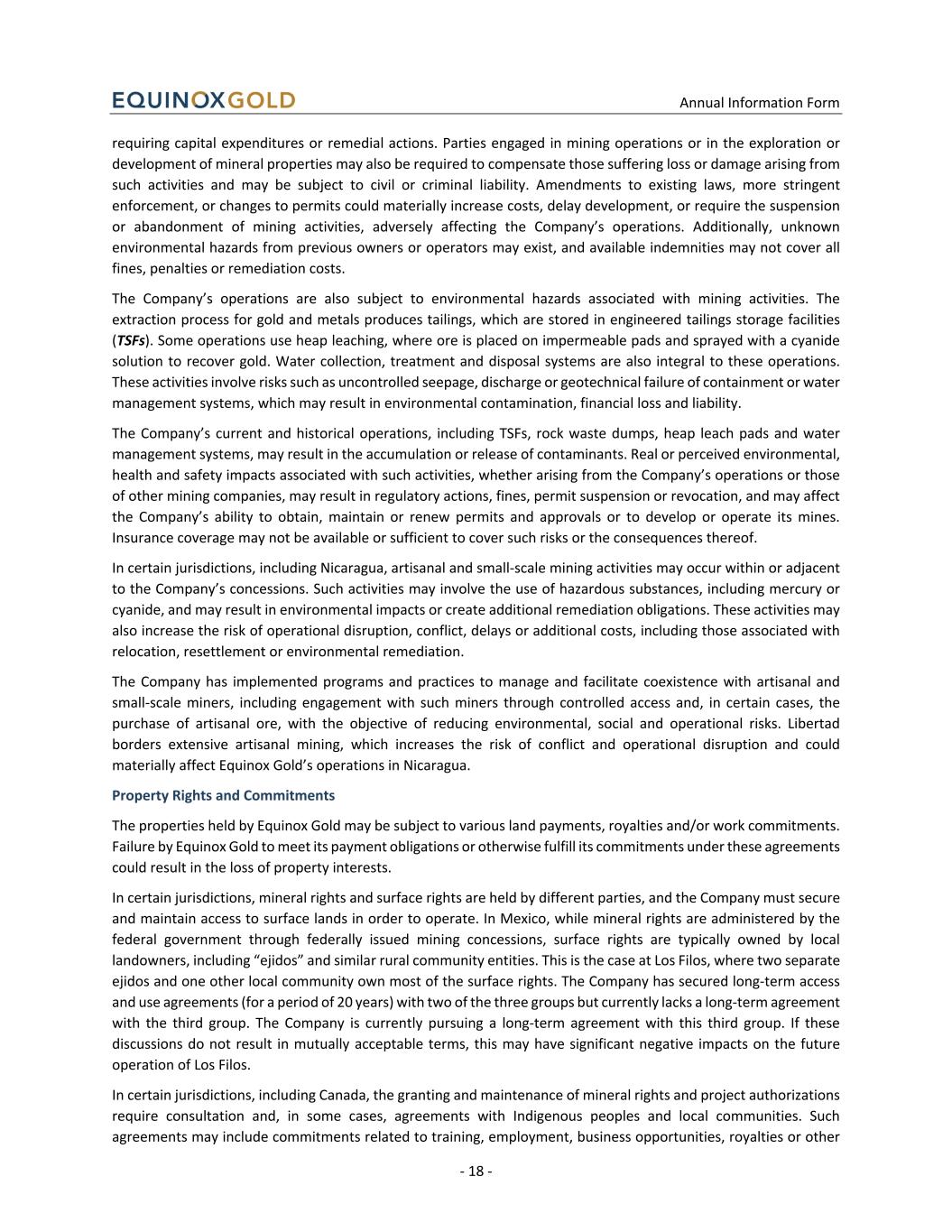 Annual Information Form - 18 - requiring capital expenditures or remedial actions. Parties engaged in mining operations or in the exploration or development of mineral properties may also be required to compensate those suffering loss or damage arising from such activities and may be subject to civil or criminal liability. Amendments to existing laws, more stringent enforcement, or changes to permits could materially increase costs, delay development, or require the suspension or abandonment of mining activities, adversely affecting the Company’s operations. Additionally, unknown environmental hazards from previous owners or operators may exist, and available indemnities may not cover all fines, penalties or remediation costs. The Company’s operations are also subject to environmental hazards associated with mining activities. The extraction process for gold and metals produces tailings, which are stored in engineered tailings storage facilities (TSFs). Some operations use heap leaching, where ore is placed on impermeable pads and sprayed with a cyanide solution to recover gold. Water collection, treatment and disposal systems are also integral to these operations. These activities involve risks such as uncontrolled seepage, discharge or geotechnical failure of containment or water management systems, which may result in environmental contamination, financial loss and liability. The Company’s current and historical operations, including TSFs, rock waste dumps, heap leach pads and water management systems, may result in the accumulation or release of contaminants. Real or perceived environmental, health and safety impacts associated with such activities, whether arising from the Company’s operations or those of other mining companies, may result in regulatory actions, fines, permit suspension or revocation, and may affect the Company’s ability to obtain, maintain or renew permits and approvals or to develop or operate its mines. Insurance coverage may not be available or sufficient to cover such risks or the consequences thereof. In certain jurisdictions, including Nicaragua, artisanal and small-scale mining activities may occur within or adjacent to the Company’s concessions. Such activities may involve the use of hazardous substances, including mercury or cyanide, and may result in environmental impacts or create additional remediation obligations. These activities may also increase the risk of operational disruption, conflict, delays or additional costs, including those associated with relocation, resettlement or environmental remediation. The Company has implemented programs and practices to manage and facilitate coexistence with artisanal and small-scale miners, including engagement with such miners through controlled access and, in certain cases, the purchase of artisanal ore, with the objective of reducing environmental, social and operational risks. Libertad borders extensive artisanal mining, which increases the risk of conflict and operational disruption and could materially affect Equinox Gold’s operations in Nicaragua. Property Rights and Commitments The properties held by Equinox Gold may be subject to various land payments, royalties and/or work commitments. Failure by Equinox Gold to meet its payment obligations or otherwise fulfill its commitments under these agreements could result in the loss of property interests. In certain jurisdictions, mineral rights and surface rights are held by different parties, and the Company must secure and maintain access to surface lands in order to operate. In Mexico, while mineral rights are administered by the federal government through federally issued mining concessions, surface rights are typically owned by local landowners, including “ejidos” and similar rural community entities. This is the case at Los Filos, where two separate ejidos and one other local community own most of the surface rights. The Company has secured long-term access and use agreements (for a period of 20 years) with two of the three groups but currently lacks a long-term agreement with the third group. The Company is currently pursuing a long-term agreement with this third group. If these discussions do not result in mutually acceptable terms, this may have significant negative impacts on the future operation of Los Filos. In certain jurisdictions, including Canada, the granting and maintenance of mineral rights and project authorizations require consultation and, in some cases, agreements with Indigenous peoples and local communities. Such agreements may include commitments related to training, employment, business opportunities, royalties or other