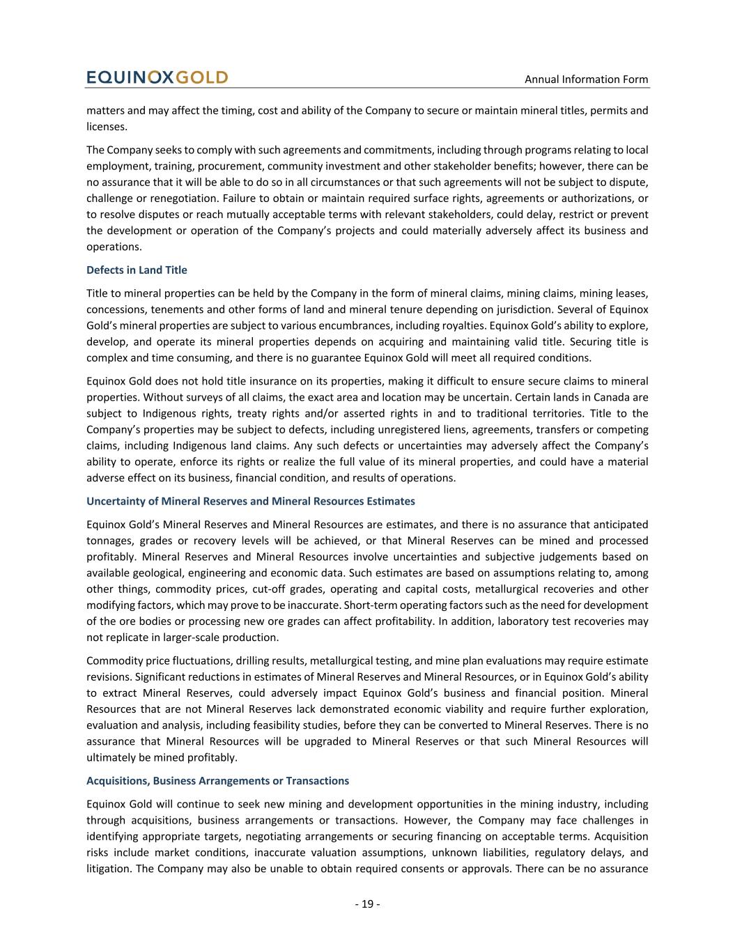 Annual Information Form - 19 - matters and may affect the timing, cost and ability of the Company to secure or maintain mineral titles, permits and licenses. The Company seeks to comply with such agreements and commitments, including through programs relating to local employment, training, procurement, community investment and other stakeholder benefits; however, there can be no assurance that it will be able to do so in all circumstances or that such agreements will not be subject to dispute, challenge or renegotiation. Failure to obtain or maintain required surface rights, agreements or authorizations, or to resolve disputes or reach mutually acceptable terms with relevant stakeholders, could delay, restrict or prevent the development or operation of the Company’s projects and could materially adversely affect its business and operations. Defects in Land Title Title to mineral properties can be held by the Company in the form of mineral claims, mining claims, mining leases, concessions, tenements and other forms of land and mineral tenure depending on jurisdiction. Several of Equinox Gold’s mineral properties are subject to various encumbrances, including royalties. Equinox Gold’s ability to explore, develop, and operate its mineral properties depends on acquiring and maintaining valid title. Securing title is complex and time consuming, and there is no guarantee Equinox Gold will meet all required conditions. Equinox Gold does not hold title insurance on its properties, making it difficult to ensure secure claims to mineral properties. Without surveys of all claims, the exact area and location may be uncertain. Certain lands in Canada are subject to Indigenous rights, treaty rights and/or asserted rights in and to traditional territories. Title to the Company’s properties may be subject to defects, including unregistered liens, agreements, transfers or competing claims, including Indigenous land claims. Any such defects or uncertainties may adversely affect the Company’s ability to operate, enforce its rights or realize the full value of its mineral properties, and could have a material adverse effect on its business, financial condition, and results of operations. Uncertainty of Mineral Reserves and Mineral Resources Estimates Equinox Gold’s Mineral Reserves and Mineral Resources are estimates, and there is no assurance that anticipated tonnages, grades or recovery levels will be achieved, or that Mineral Reserves can be mined and processed profitably. Mineral Reserves and Mineral Resources involve uncertainties and subjective judgements based on available geological, engineering and economic data. Such estimates are based on assumptions relating to, among other things, commodity prices, cut-off grades, operating and capital costs, metallurgical recoveries and other modifying factors, which may prove to be inaccurate. Short-term operating factors such as the need for development of the ore bodies or processing new ore grades can affect profitability. In addition, laboratory test recoveries may not replicate in larger-scale production. Commodity price fluctuations, drilling results, metallurgical testing, and mine plan evaluations may require estimate revisions. Significant reductions in estimates of Mineral Reserves and Mineral Resources, or in Equinox Gold’s ability to extract Mineral Reserves, could adversely impact Equinox Gold’s business and financial position. Mineral Resources that are not Mineral Reserves lack demonstrated economic viability and require further exploration, evaluation and analysis, including feasibility studies, before they can be converted to Mineral Reserves. There is no assurance that Mineral Resources will be upgraded to Mineral Reserves or that such Mineral Resources will ultimately be mined profitably. Acquisitions, Business Arrangements or Transactions Equinox Gold will continue to seek new mining and development opportunities in the mining industry, including through acquisitions, business arrangements or transactions. However, the Company may face challenges in identifying appropriate targets, negotiating arrangements or securing financing on acceptable terms. Acquisition risks include market conditions, inaccurate valuation assumptions, unknown liabilities, regulatory delays, and litigation. The Company may also be unable to obtain required consents or approvals. There can be no assurance