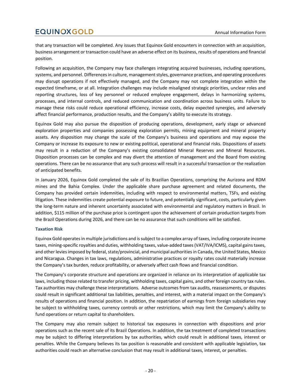 Annual Information Form - 20 - that any transaction will be completed. Any issues that Equinox Gold encounters in connection with an acquisition, business arrangement or transaction could have an adverse effect on its business, results of operations and financial position. Following an acquisition, the Company may face challenges integrating acquired businesses, including operations, systems, and personnel. Differences in culture, management styles, governance practices, and operating procedures may disrupt operations if not effectively managed, and the Company may not complete integration within the expected timeframe, or at all. Integration challenges may include misaligned strategic priorities, unclear roles and reporting structures, loss of key personnel or reduced employee engagement, delays in harmonizing systems, processes, and internal controls, and reduced communication and coordination across business units. Failure to manage these risks could reduce operational efficiency, increase costs, delay expected synergies, and adversely affect financial performance, production results, and the Company’s ability to execute its strategy. Equinox Gold may also pursue the disposition of producing operations, development, early stage or advanced exploration properties and companies possessing exploration permits, mining equipment and mineral property assets. Any disposition may change the scale of the Company’s business and operations and may expose the Company or increase its exposure to new or existing political, operational and financial risks. Dispositions of assets may result in a reduction of the Company’s existing consolidated Mineral Reserves and Mineral Resources. Disposition processes can be complex and may divert the attention of management and the Board from existing operations. There can be no assurance that any such process will result in a successful transaction or the realization of anticipated benefits. In January 2026, Equinox Gold completed the sale of its Brazilian Operations, comprising the Aurizona and RDM mines and the Bahia Complex. Under the applicable share purchase agreement and related documents, the Company has provided certain indemnities, including with respect to environmental matters, TSFs, and existing litigation. These indemnities create potential exposure to future, and potentially significant, costs, particularly given the long-term nature and inherent uncertainty associated with environmental and regulatory matters in Brazil. In addition, $115 million of the purchase price is contingent upon the achievement of certain production targets from the Brazil Operations during 2026, and there can be no assurance that such conditions will be satisfied. Taxation Risk Equinox Gold operates in multiple jurisdictions and is subject to a complex array of taxes, including corporate income taxes, mining-specific royalties and duties, withholding taxes, value-added taxes (VAT/IVA/ICMS), capital gains taxes, and other levies imposed by federal, state/provincial, and municipal authorities in Canada, the United States, Mexico and Nicaragua. Changes in tax laws, regulations, administrative practices or royalty rates could materially increase the Company’s tax burden, reduce profitability, or adversely affect cash flows and financial condition. The Company’s corporate structure and operations are organized in reliance on its interpretation of applicable tax laws, including those related to transfer pricing, withholding taxes, capital gains, and other foreign country tax rules. Tax authorities may challenge these interpretations. Adverse outcomes from tax audits, reassessments, or disputes could result in significant additional tax liabilities, penalties, and interest, with a material impact on the Company’s results of operations and financial position. In addition, the repatriation of earnings from foreign subsidiaries may be subject to withholding taxes, currency controls or other restrictions, which may limit the Company’s ability to fund operations or return capital to shareholders. The Company may also remain subject to historical tax exposures in connection with dispositions and prior operations such as the recent sale of its Brazil Operations. In addition, the tax treatment of completed transactions may be subject to differing interpretations by tax authorities, which could result in additional taxes, interest or penalties. While the Company believes its tax position is reasonable and consistent with applicable legislation, tax authorities could reach an alternative conclusion that may result in additional taxes, interest, or penalties.