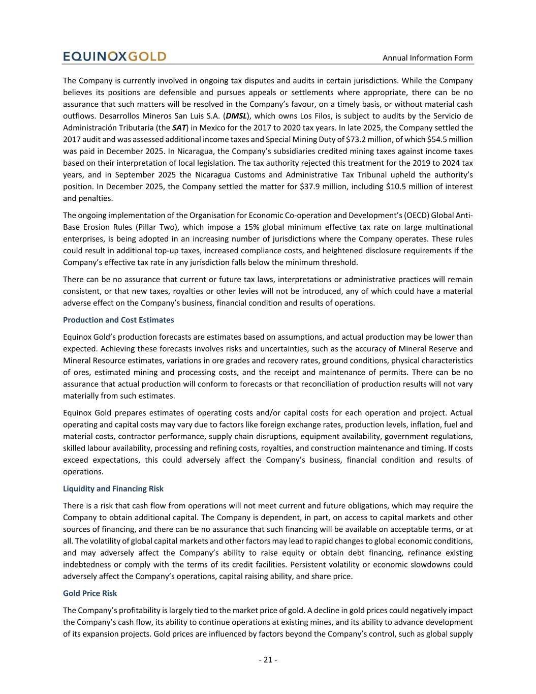 Annual Information Form - 21 - The Company is currently involved in ongoing tax disputes and audits in certain jurisdictions. While the Company believes its positions are defensible and pursues appeals or settlements where appropriate, there can be no assurance that such matters will be resolved in the Company’s favour, on a timely basis, or without material cash outflows. Desarrollos Mineros San Luis S.A. (DMSL), which owns Los Filos, is subject to audits by the Servicio de Administración Tributaria (the SAT) in Mexico for the 2017 to 2020 tax years. In late 2025, the Company settled the 2017 audit and was assessed additional income taxes and Special Mining Duty of $73.2 million, of which $54.5 million was paid in December 2025. In Nicaragua, the Company’s subsidiaries credited mining taxes against income taxes based on their interpretation of local legislation. The tax authority rejected this treatment for the 2019 to 2024 tax years, and in September 2025 the Nicaragua Customs and Administrative Tax Tribunal upheld the authority’s position. In December 2025, the Company settled the matter for $37.9 million, including $10.5 million of interest and penalties. The ongoing implementation of the Organisation for Economic Co-operation and Development’s (OECD) Global Anti- Base Erosion Rules (Pillar Two), which impose a 15% global minimum effective tax rate on large multinational enterprises, is being adopted in an increasing number of jurisdictions where the Company operates. These rules could result in additional top-up taxes, increased compliance costs, and heightened disclosure requirements if the Company’s effective tax rate in any jurisdiction falls below the minimum threshold. There can be no assurance that current or future tax laws, interpretations or administrative practices will remain consistent, or that new taxes, royalties or other levies will not be introduced, any of which could have a material adverse effect on the Company’s business, financial condition and results of operations. Production and Cost Estimates Equinox Gold’s production forecasts are estimates based on assumptions, and actual production may be lower than expected. Achieving these forecasts involves risks and uncertainties, such as the accuracy of Mineral Reserve and Mineral Resource estimates, variations in ore grades and recovery rates, ground conditions, physical characteristics of ores, estimated mining and processing costs, and the receipt and maintenance of permits. There can be no assurance that actual production will conform to forecasts or that reconciliation of production results will not vary materially from such estimates. Equinox Gold prepares estimates of operating costs and/or capital costs for each operation and project. Actual operating and capital costs may vary due to factors like foreign exchange rates, production levels, inflation, fuel and material costs, contractor performance, supply chain disruptions, equipment availability, government regulations, skilled labour availability, processing and refining costs, royalties, and construction maintenance and timing. If costs exceed expectations, this could adversely affect the Company’s business, financial condition and results of operations. Liquidity and Financing Risk There is a risk that cash flow from operations will not meet current and future obligations, which may require the Company to obtain additional capital. The Company is dependent, in part, on access to capital markets and other sources of financing, and there can be no assurance that such financing will be available on acceptable terms, or at all. The volatility of global capital markets and other factors may lead to rapid changes to global economic conditions, and may adversely affect the Company’s ability to raise equity or obtain debt financing, refinance existing indebtedness or comply with the terms of its credit facilities. Persistent volatility or economic slowdowns could adversely affect the Company’s operations, capital raising ability, and share price. Gold Price Risk The Company’s profitability is largely tied to the market price of gold. A decline in gold prices could negatively impact the Company’s cash flow, its ability to continue operations at existing mines, and its ability to advance development of its expansion projects. Gold prices are influenced by factors beyond the Company’s control, such as global supply